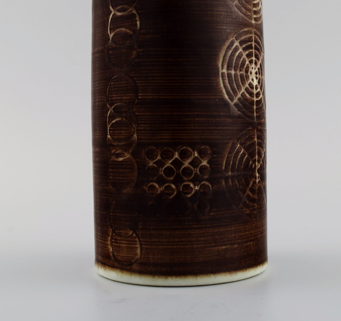 Olle Alberius for Rörstrand. Cylindrisk Sarek vase i håndmalet og glaseret keramik med geometriske mønstre. Svensk design, 1960/70'erne. Måler: 16 x 8 cm. I flot stand. Stemplet. 1. sortering.