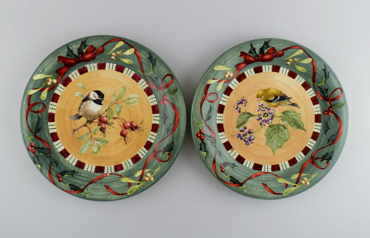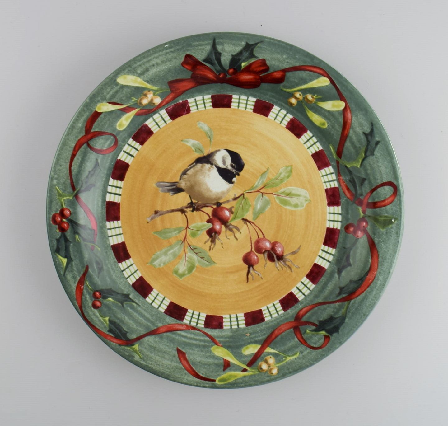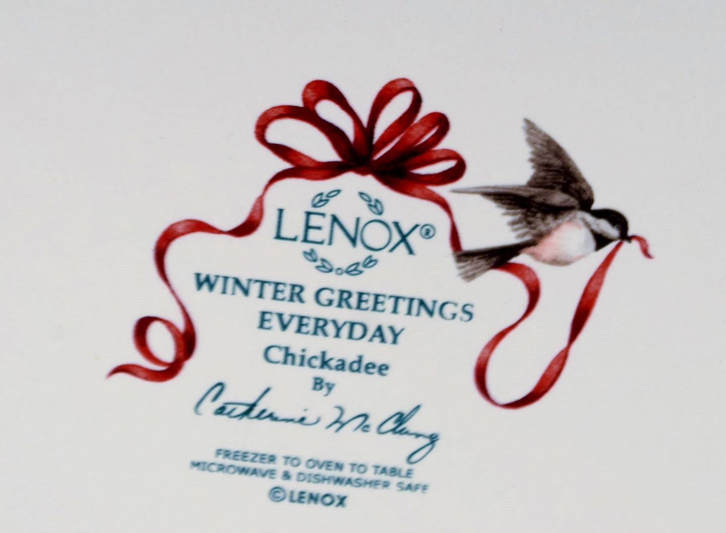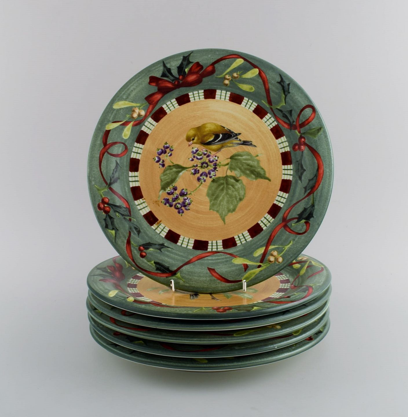 Catherine McClung for Lenox. "Winter greetings everyday". Six dinner plates in glazed stoneware decorated with mistletoe, birds and red ribbon. Approx. 2000. Diameter: 27 cm. In excellent condition. Stamped.