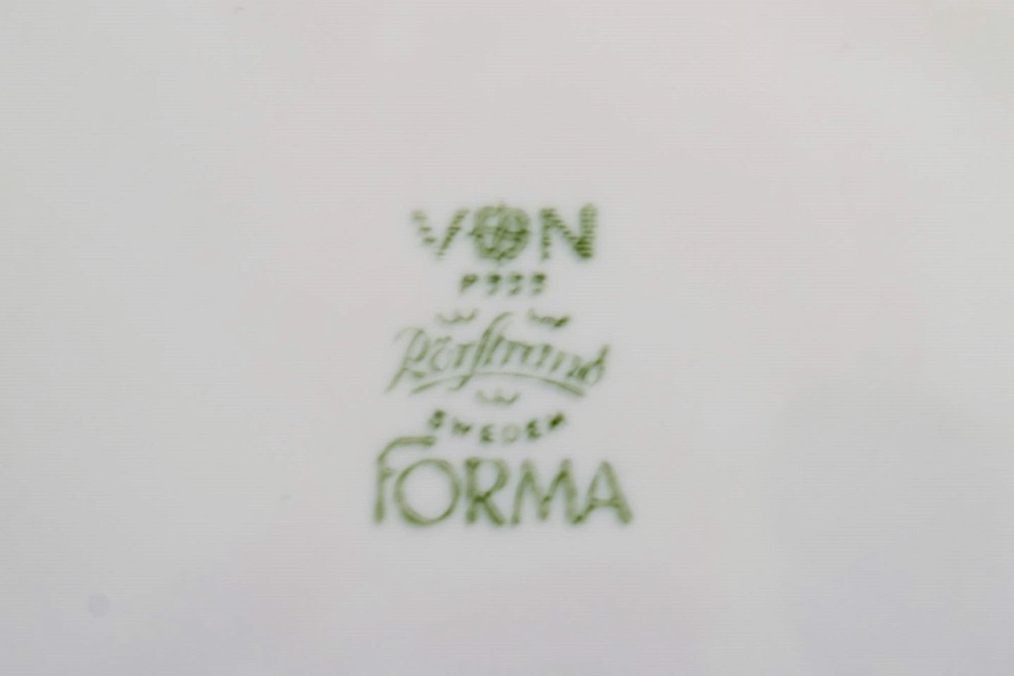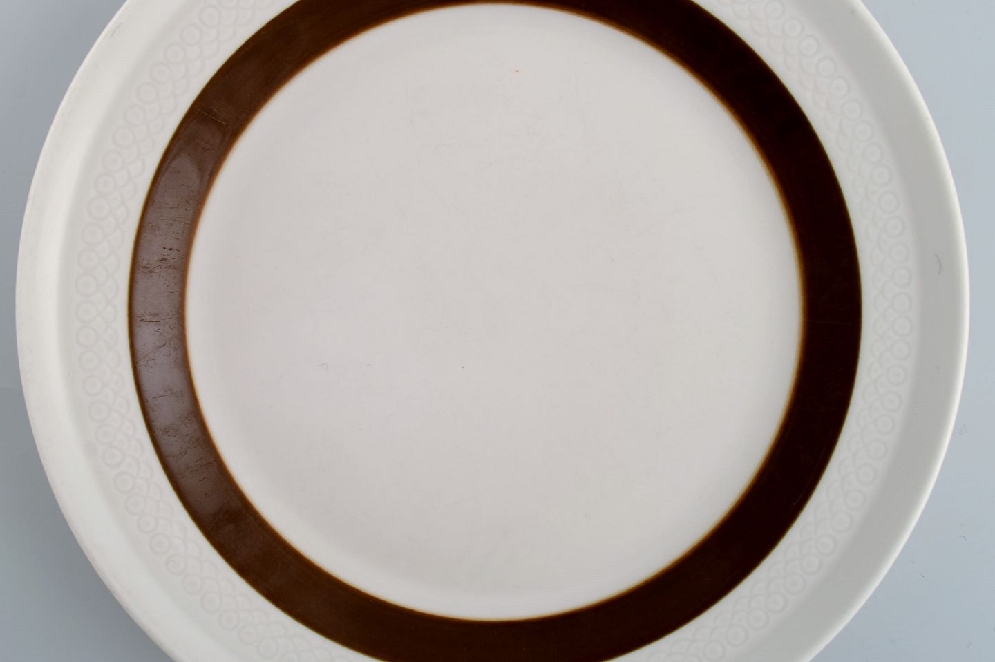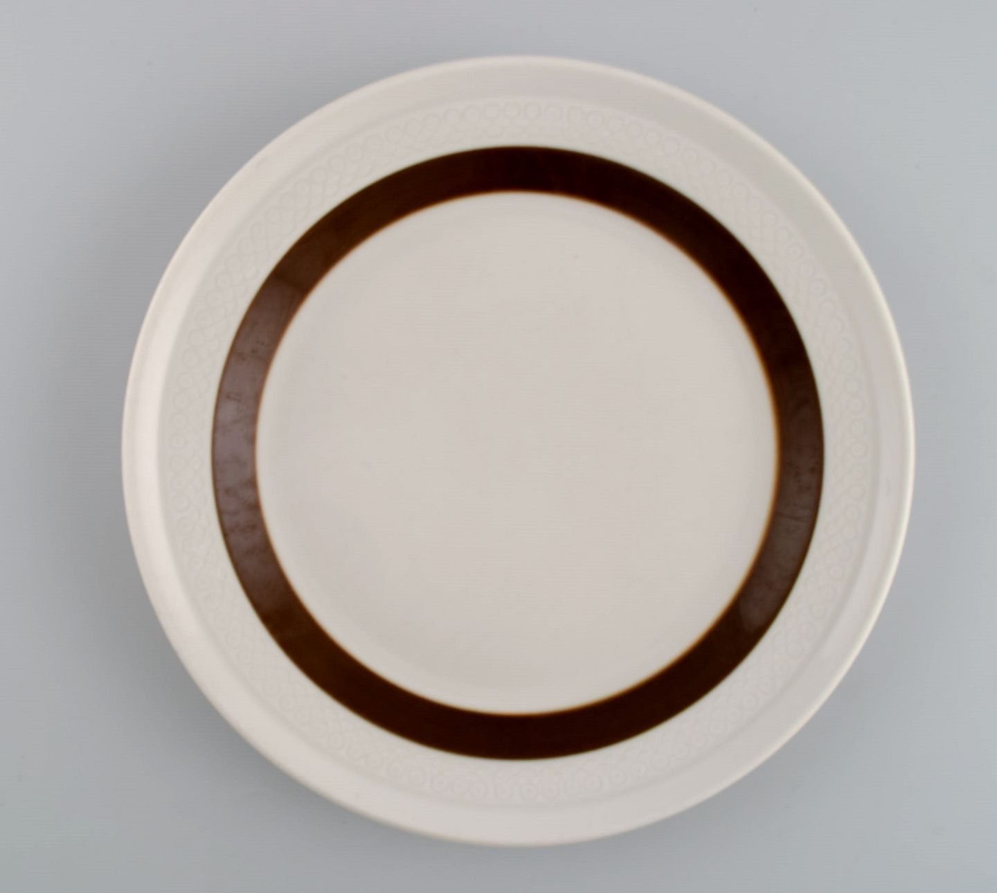 Olle Alberius for Rörstrand. Syv Forma frokosttallerkener i glaseret stentřj. Dateret 1967-1981. Diameter: 21,5 cm. I flot stand. 1. sortering.