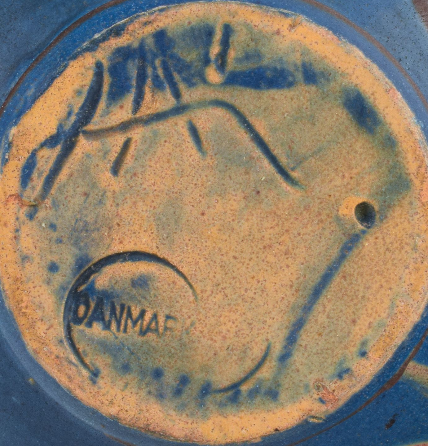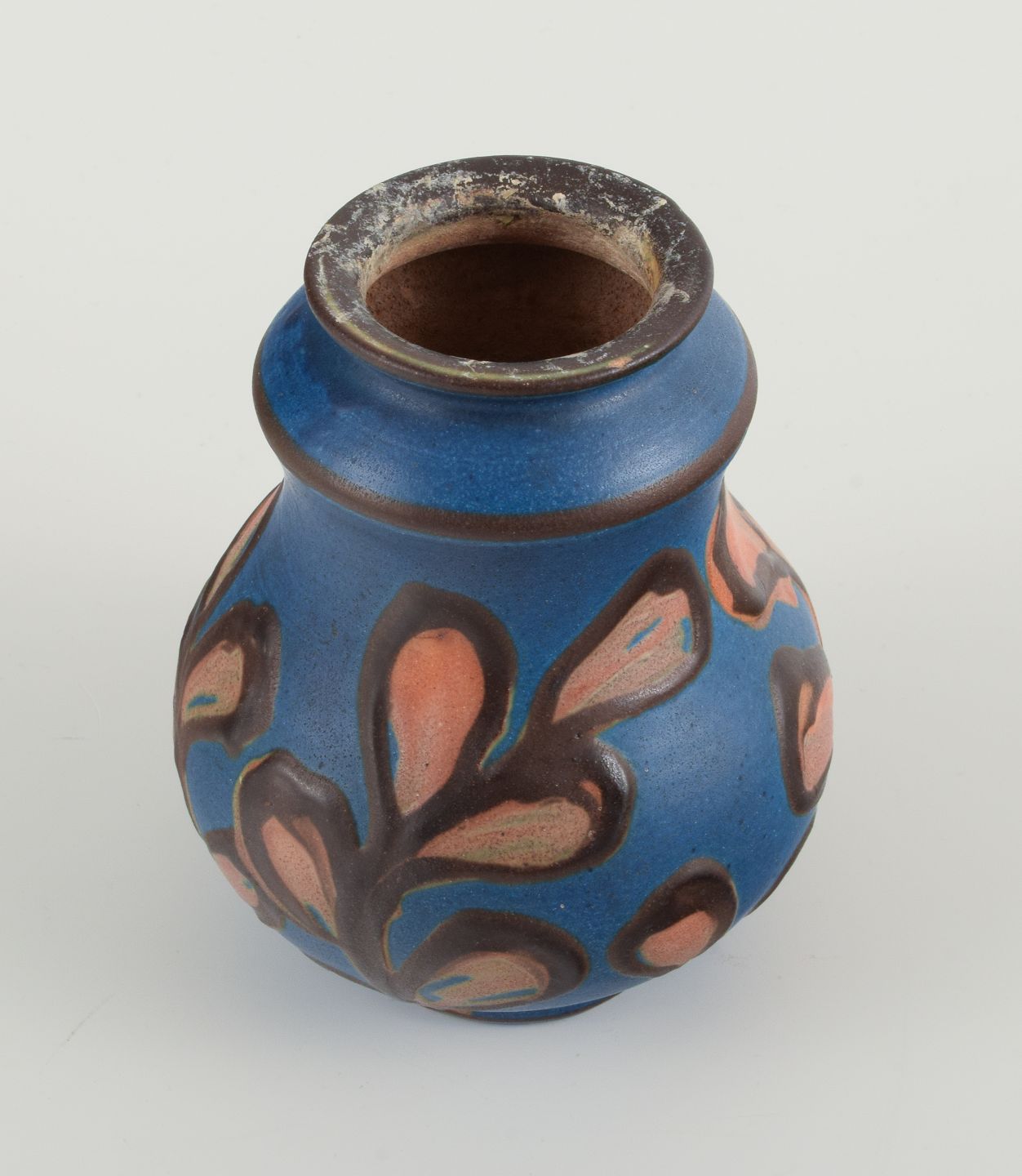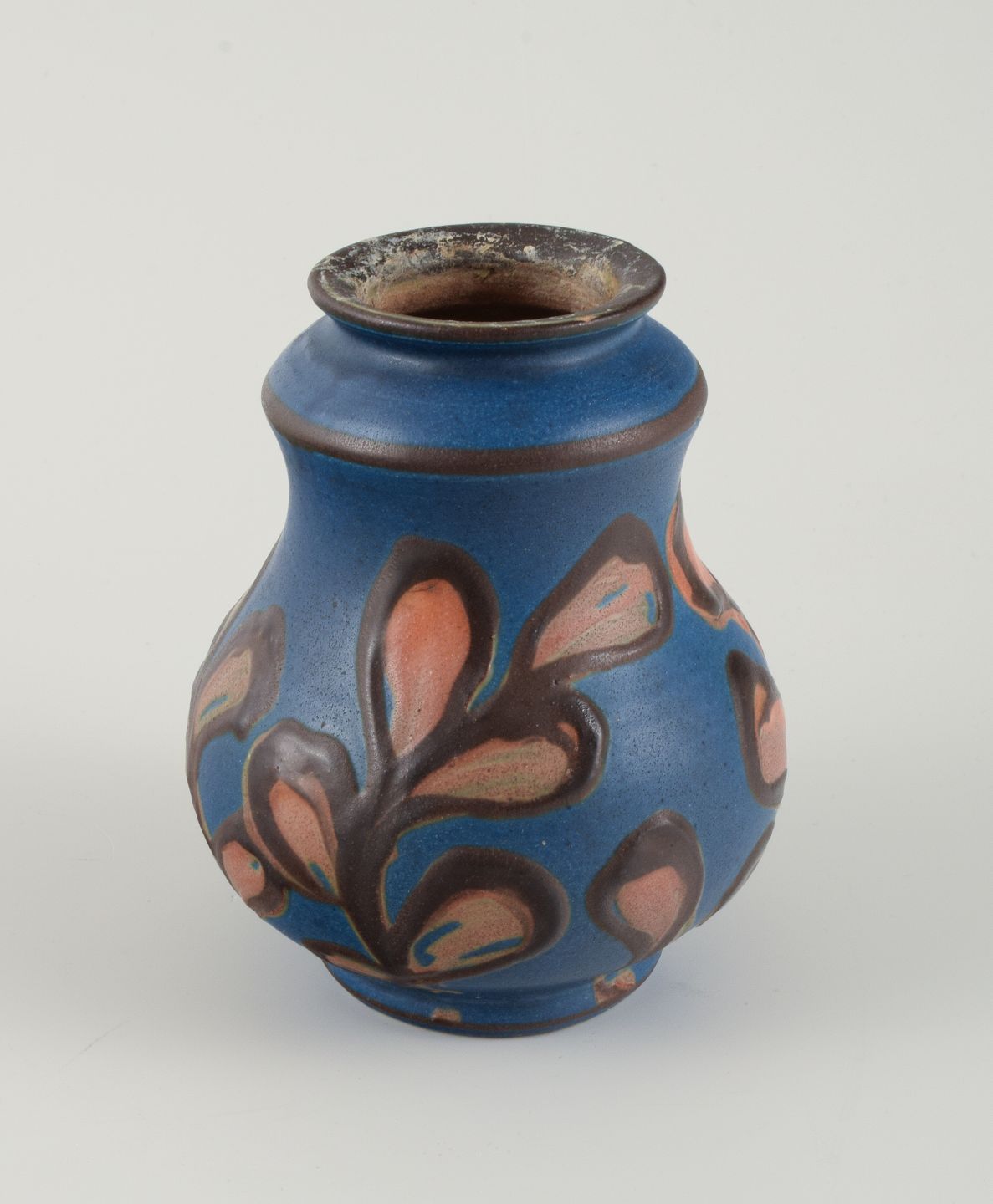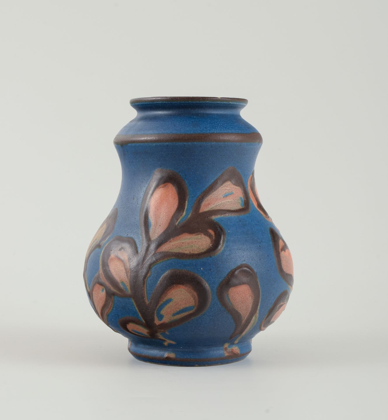 Kähler, Denmark, glazed stoneware vase in modern design. 1930/40s. Cow horn technique. Brown leaves on blue background. Measurements: H 12.0 cm. x d 10.0 cm. Calcium at the top. In excellent condition. Marked.