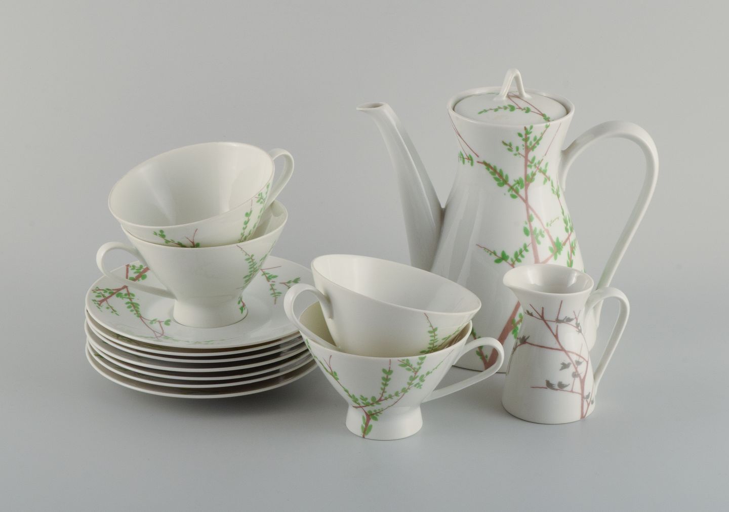 Bjørn Wiinblad for Rosenthal. "Summer" coffee service for four people with jug, four cups, seven saucers and creamer.