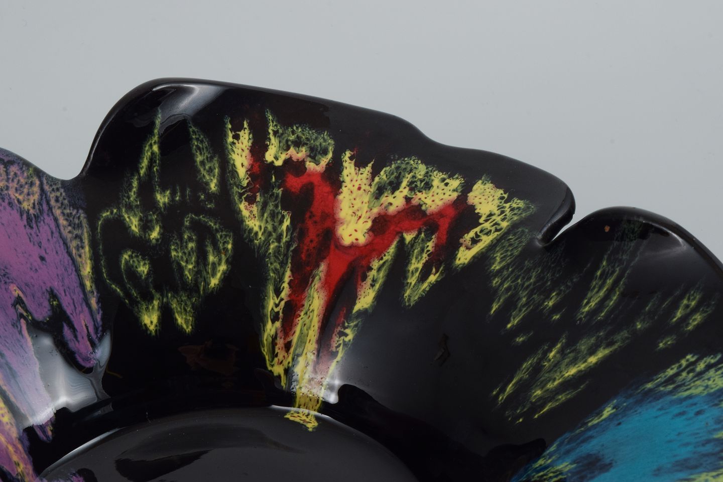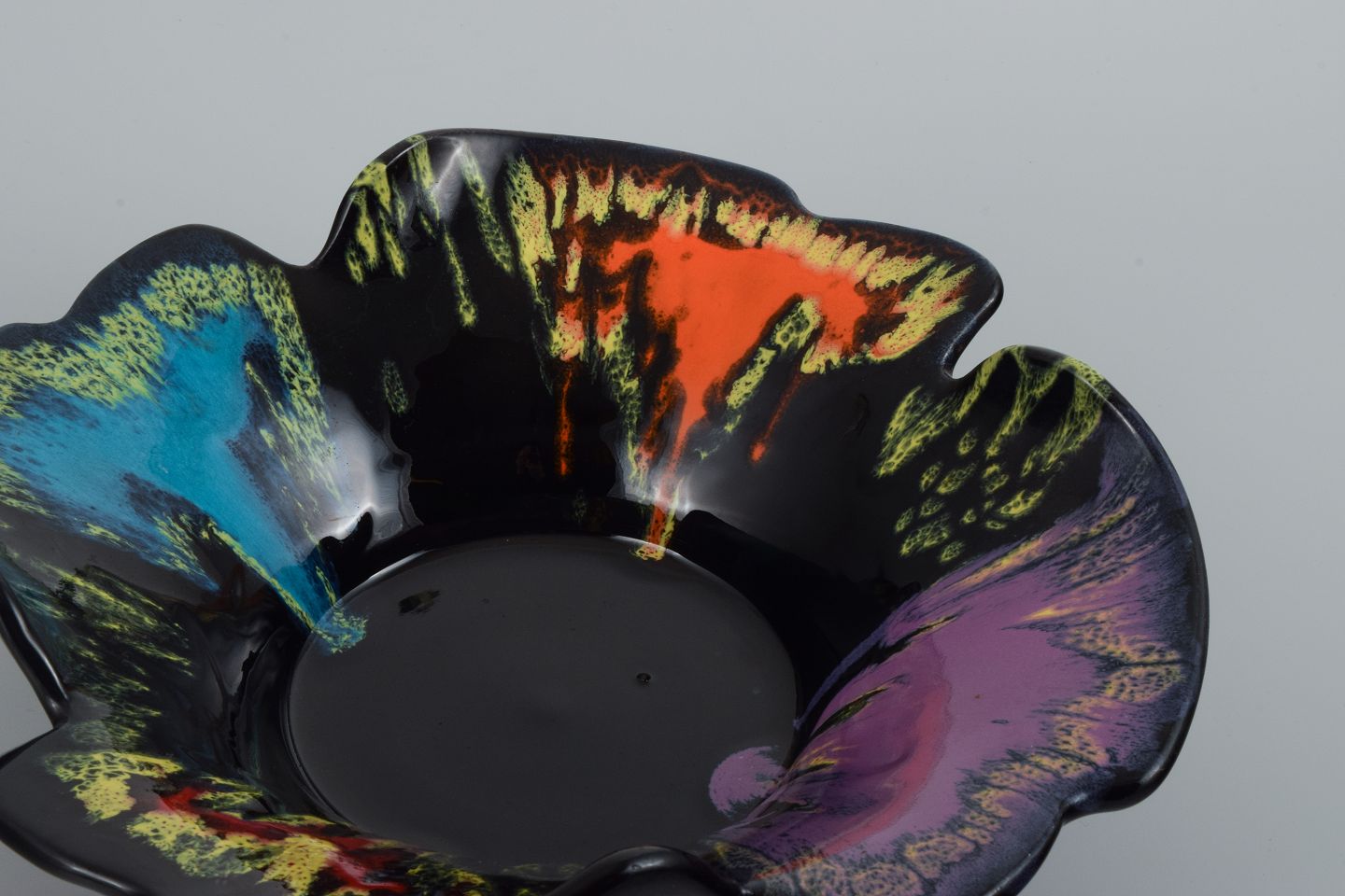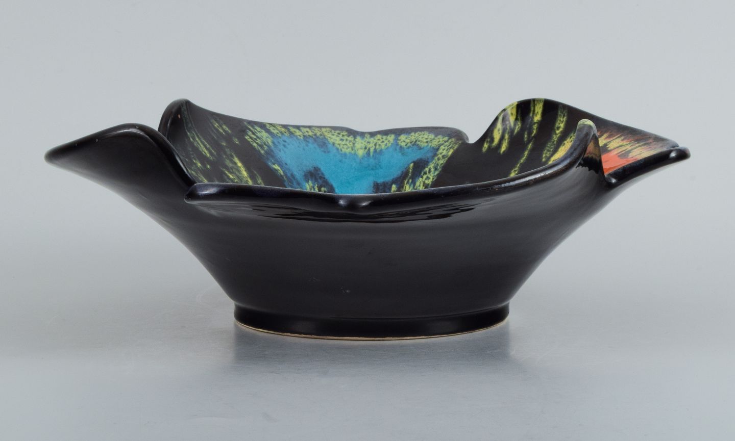 Vallauris, Frankrig, keramikskål i farvestrålende glasurer på sort bund.