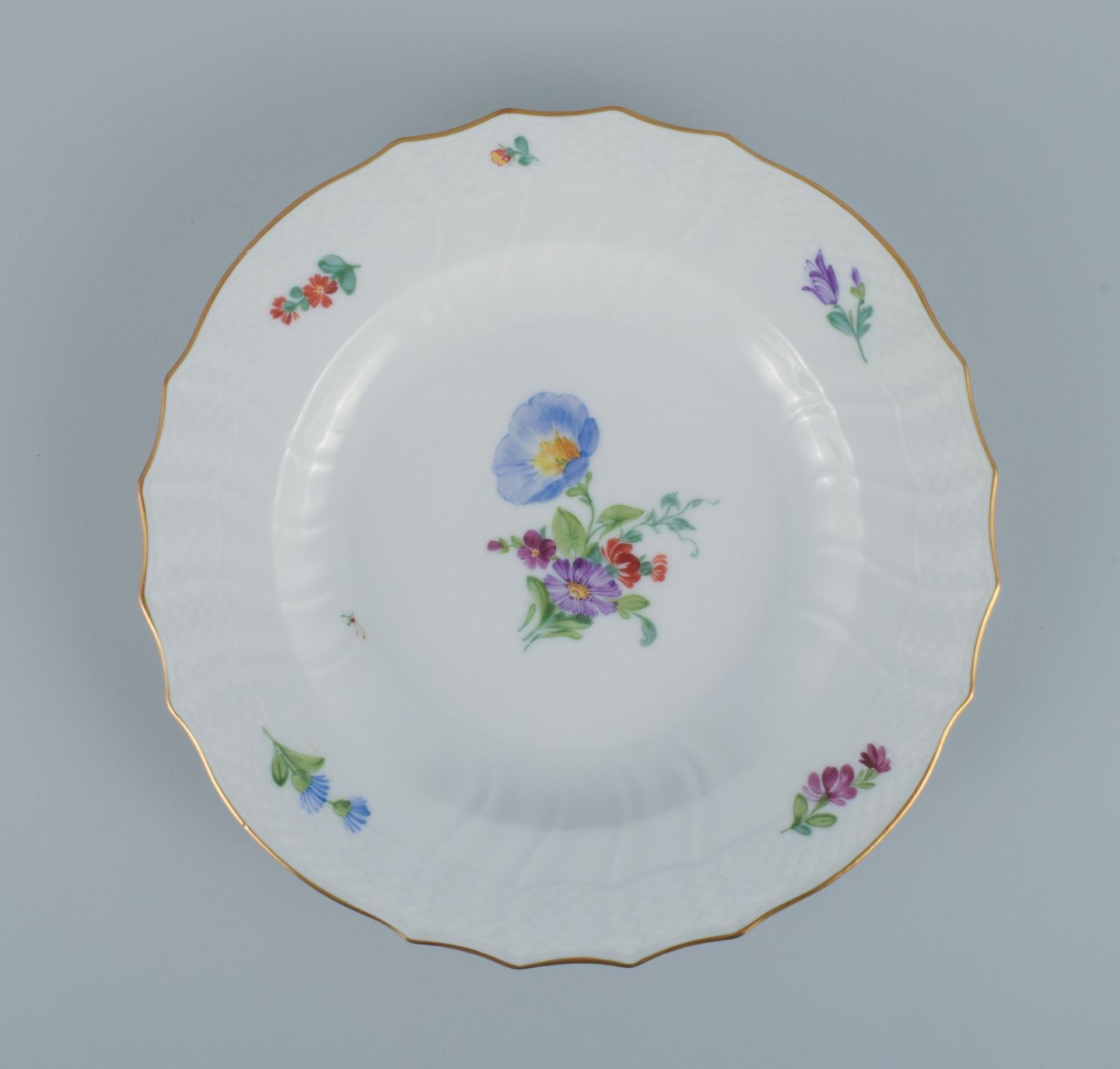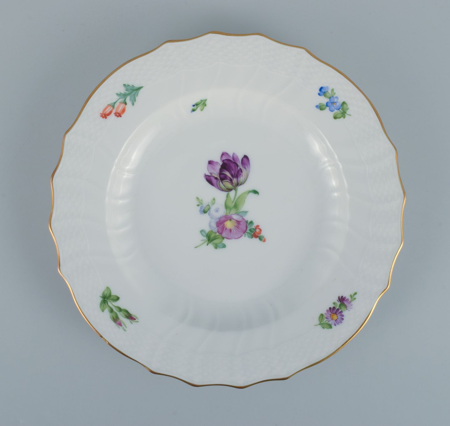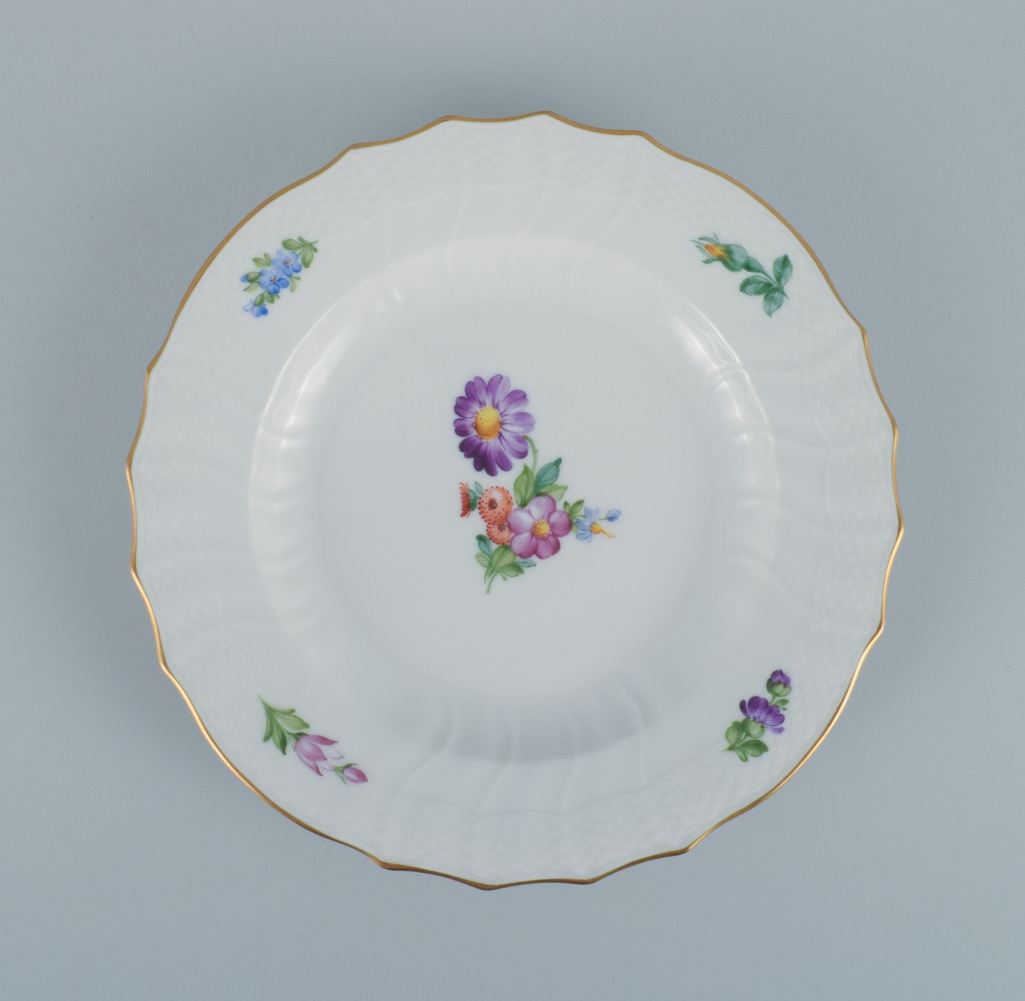 Royal Copenhagen Saksisk Blomst. Fem middagstallerkener i håndmalet porcelæn med blomster og gulddekoration. Modelnummer 493/1621. I flot stand. Stemplet. Anden sortering. Mål: D 25,5 cm.