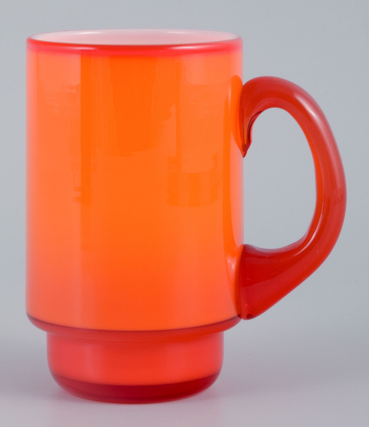 Michael Bang for Holmegaard. Tre krus i orange og hvidt kunstglas. 1960'erne. I perfekt stand. Mål: B 9,0 (med hank) x H 10,5 cm.