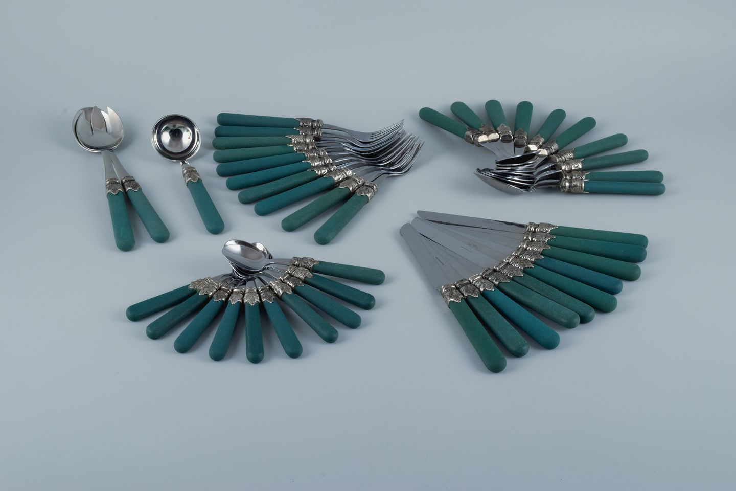 Ti knive, ti gafler, ti skeer og ti teskeer, salatbestik samt serveringsske.