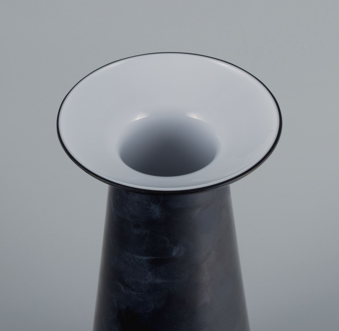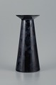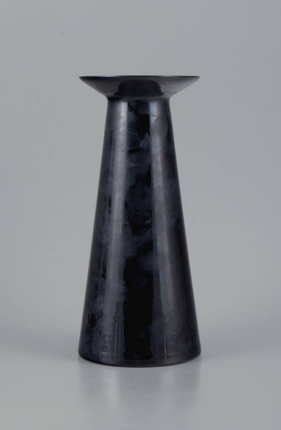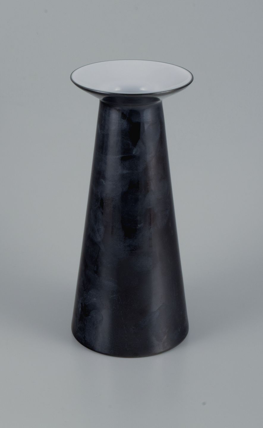 Cylindrisk krop med lang hals og bred åbning, sortglaseret, matteret og plettet.