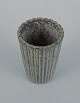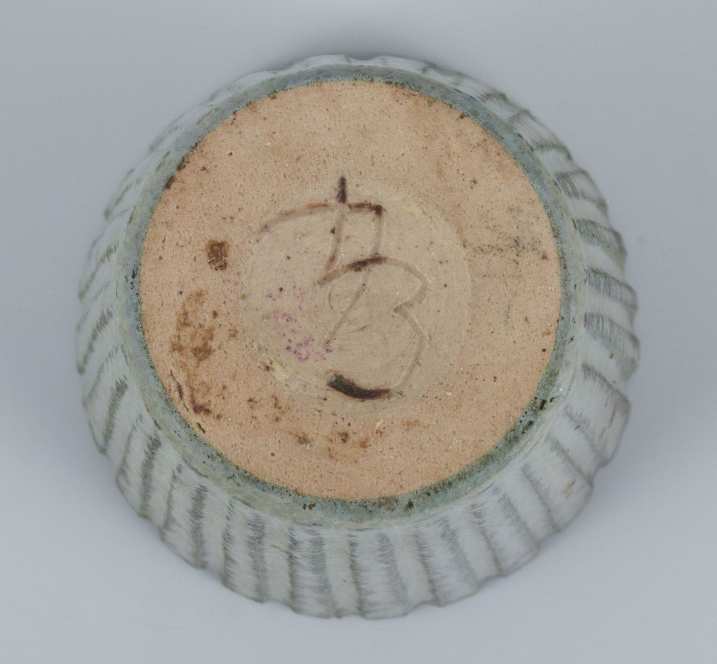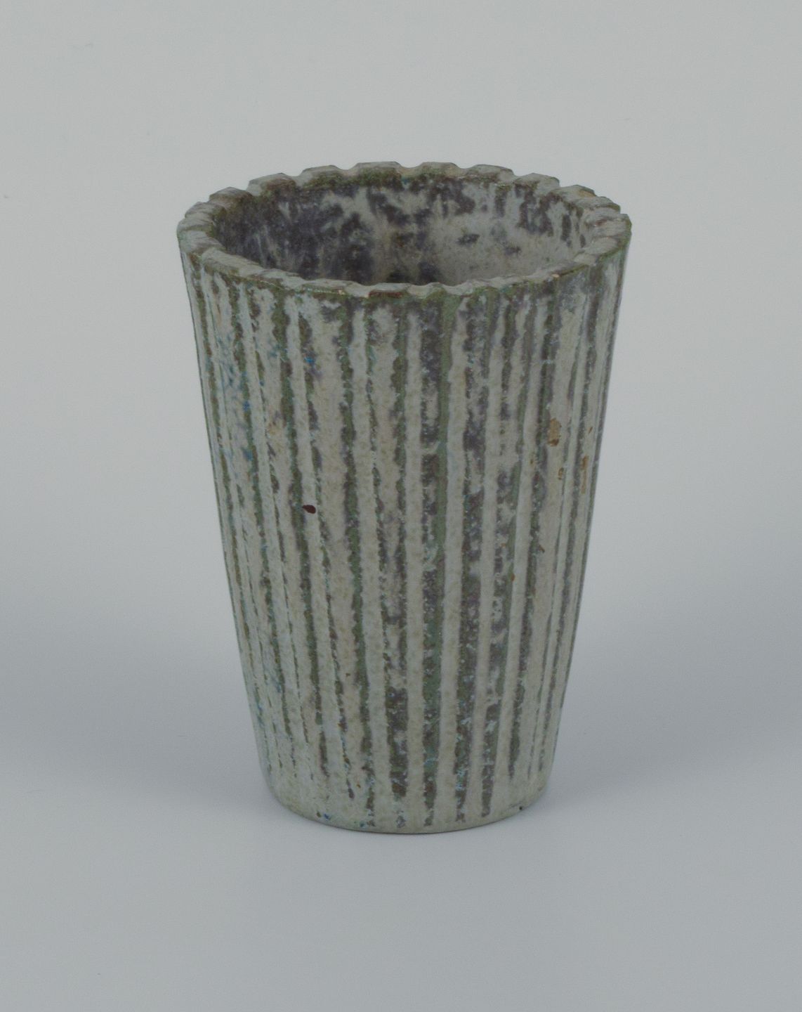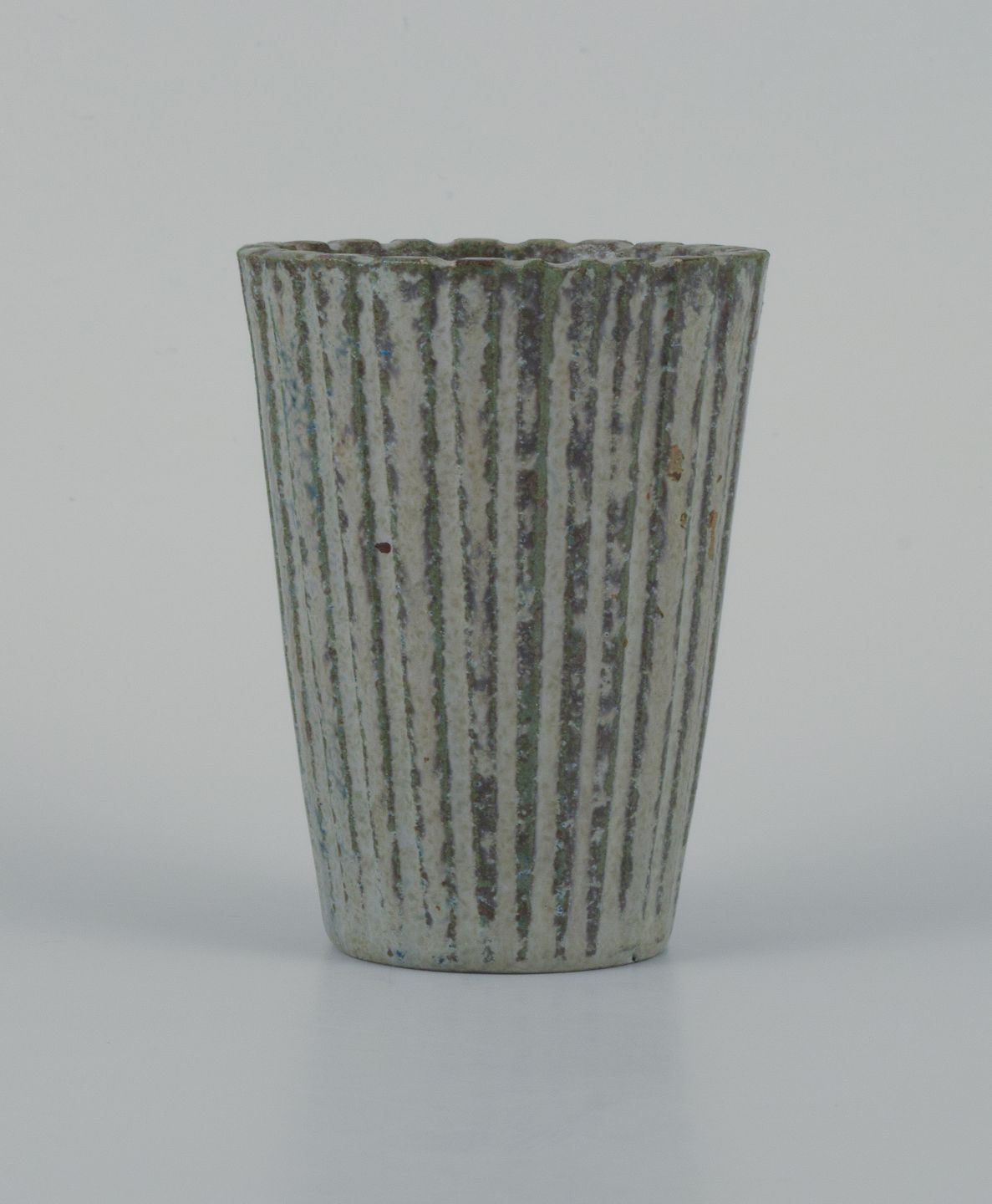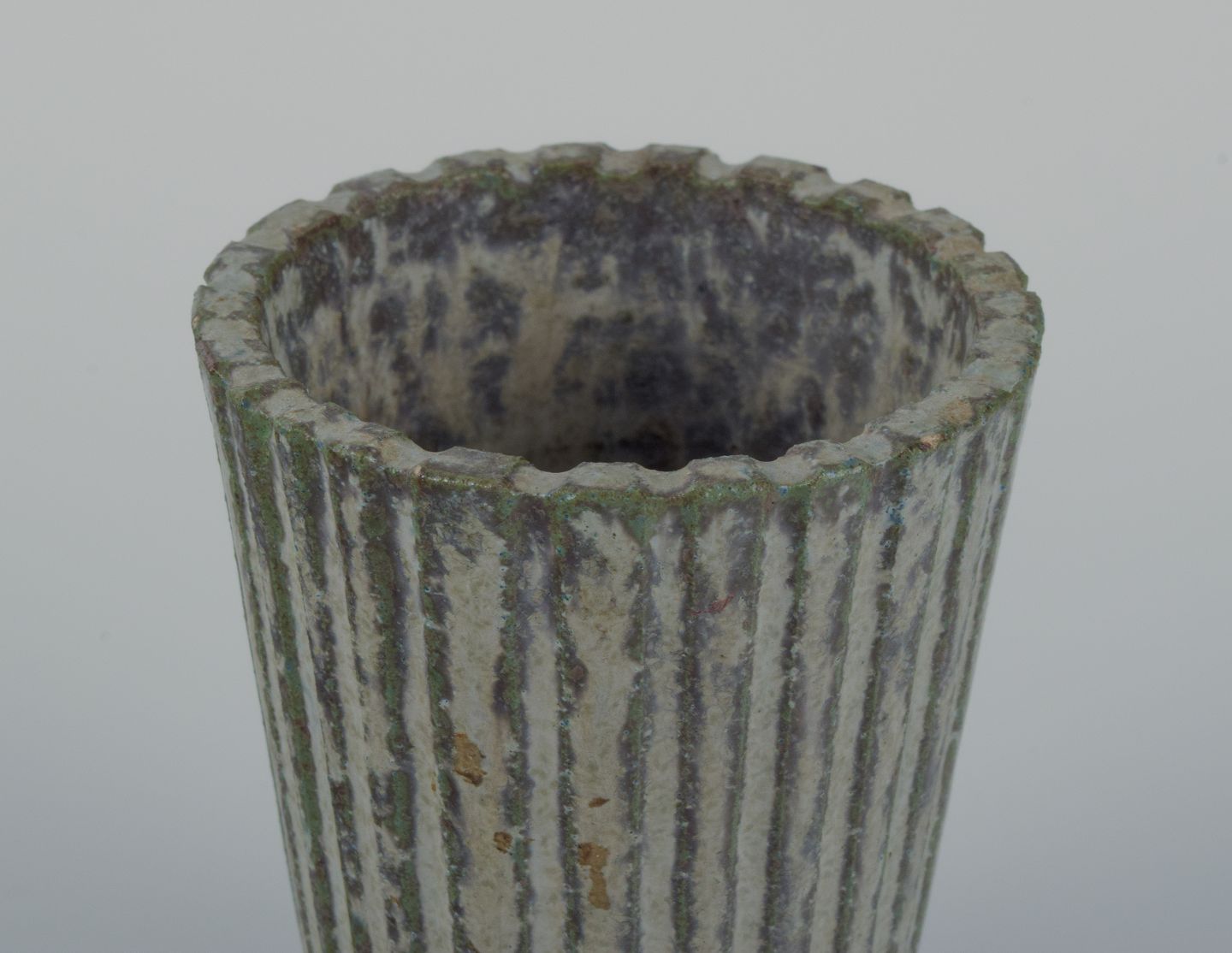 Arne Bang, small ceramic vase in fluted design speckled glaze in blue-grey tones. 1940/50s. Perfect condition. Hand signed. Dimensions: D 6.0 x H 8.0 cm.