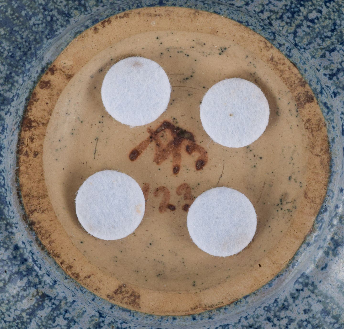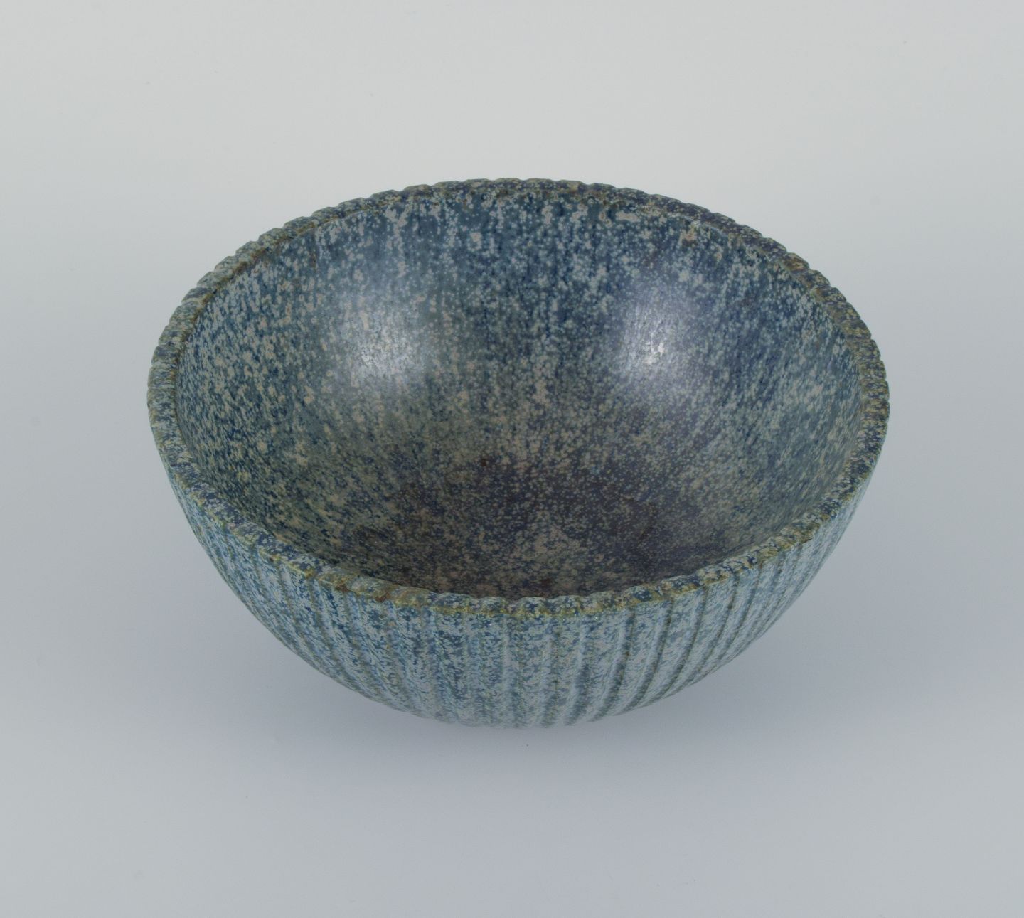 Arne Bang, keramikskål i rillet design, glasur i blå nuancer Model nr. 123. 1940/50’erne. Perfekt stand. Håndsigneret. Mål: D 18,5 x H 9,0 cm.