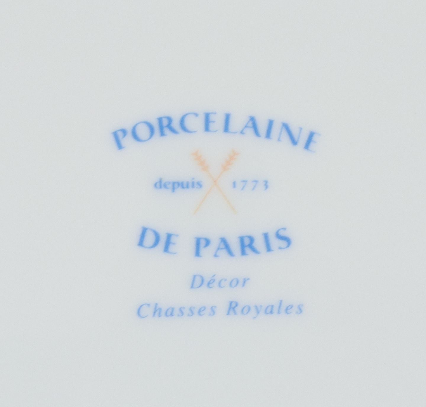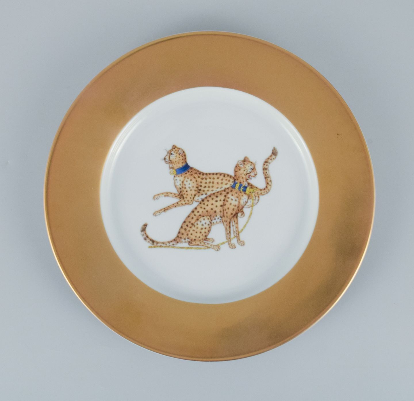 Porcelaine de Paris (Décor - Chasses Royales). To dæktallerkner hånddekoreret med geparder og gulddekoration. Ca. 1980’erne. I perfekt stand. Stemplet. Mål: D 26,3 cm.