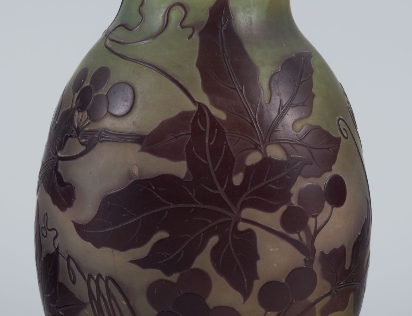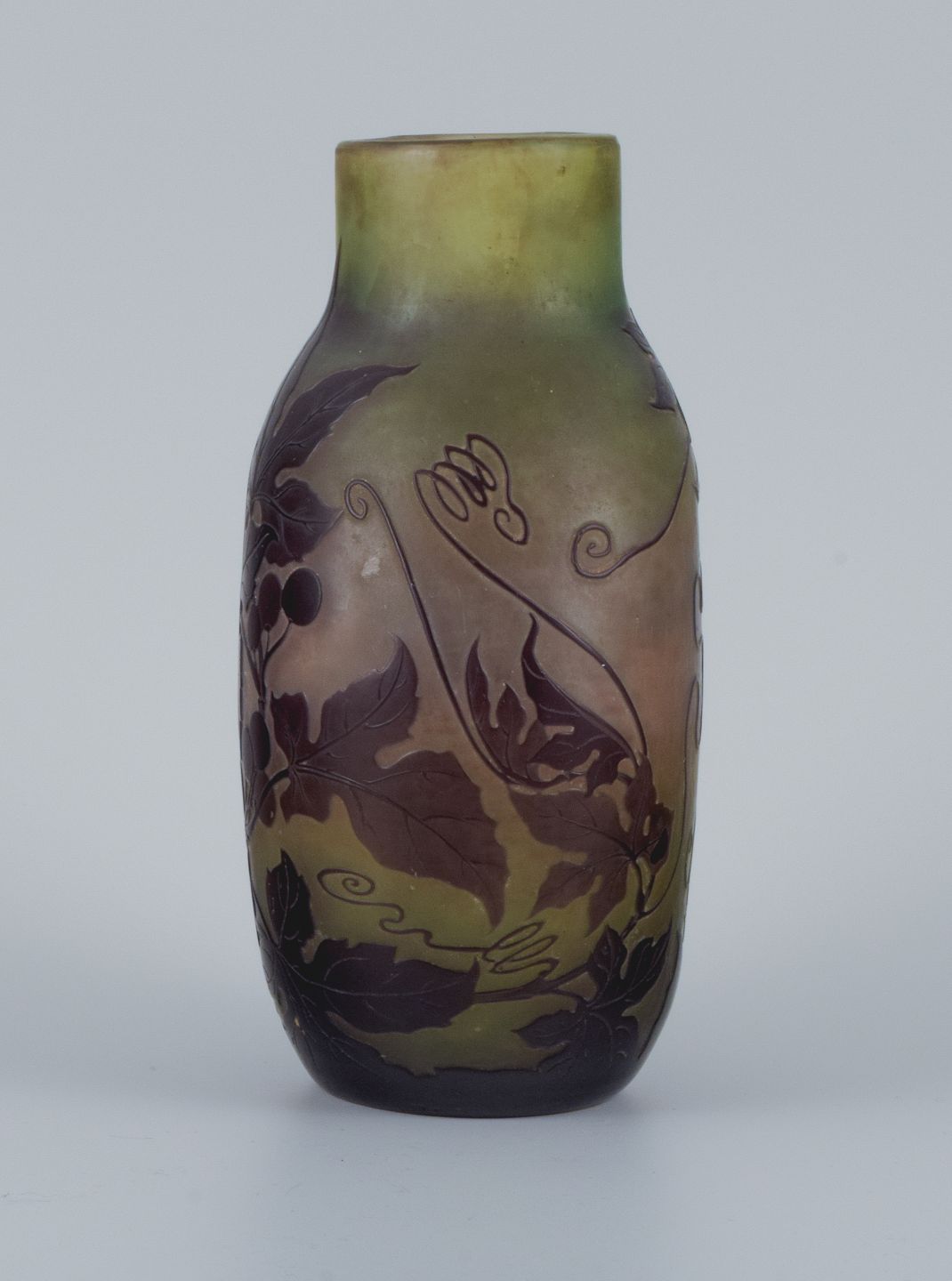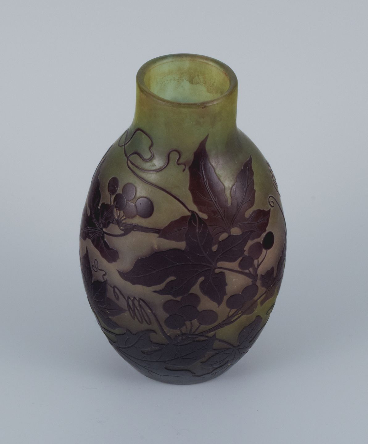 Émile Gallé (1846-1904), France. Vase in mouth-blown art glass with purple foliage in relief.