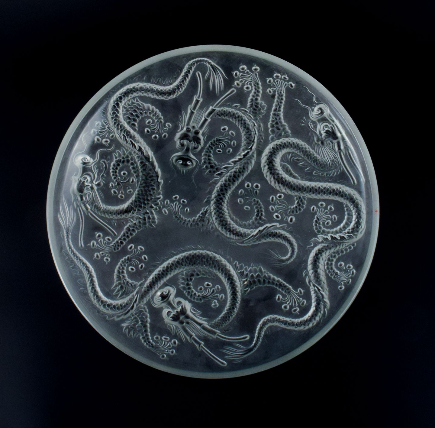 Josef Inwald, large art glass bowl in Barolac glass, designed with dragons in oriental style. Approx. 1940s. In perfect condition. Dimensions: D 35.5 x H 5.0 cm.
