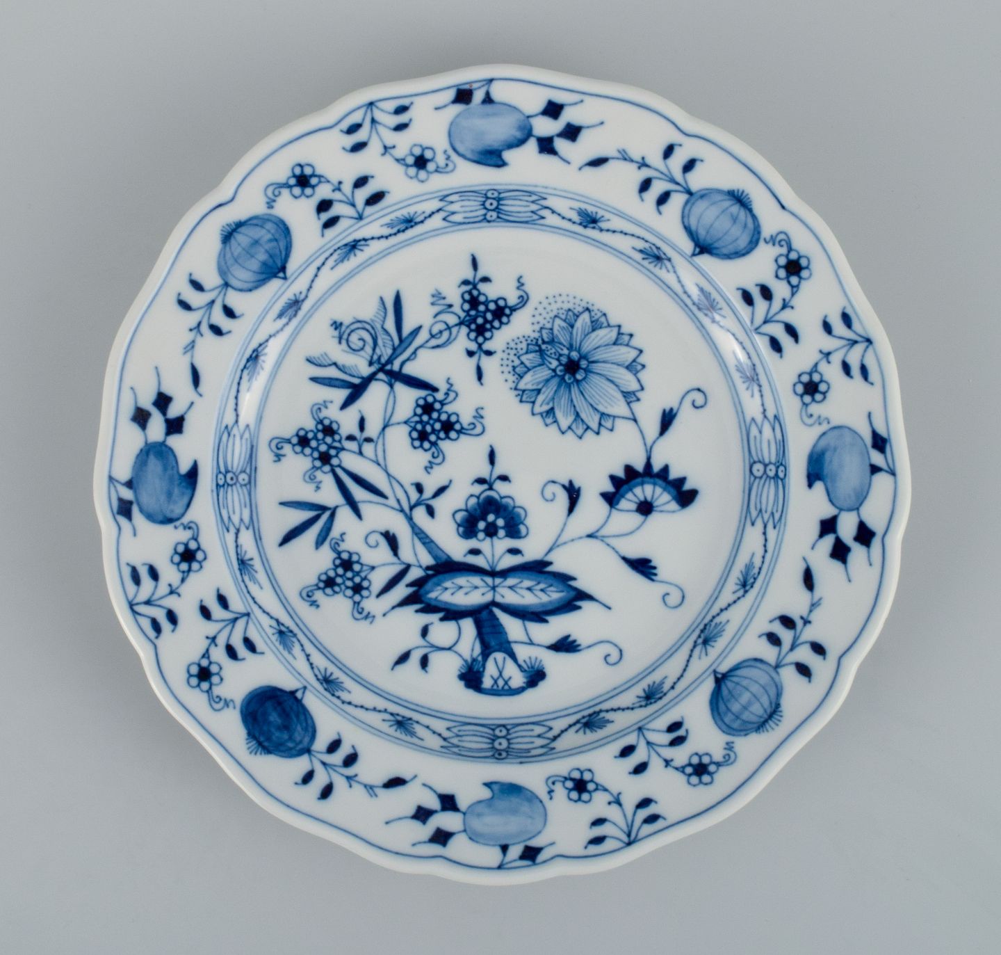 Meissen, et sæt på seks løgmønstret middagstallerkner. Ca. 1900. Fjerde sortering. I perfekt stand. Stemplet. Mål: D 25 x H 3,0 - 3,5 cm.