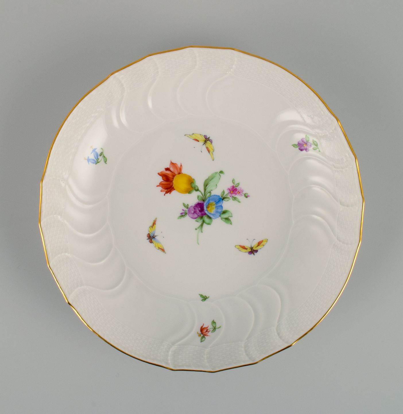KPM (Königliche Porzellan Manufaktur), Germany, bowl decorated with flowers, butterflies and gold. Approx. 1900. First factory quality. In perfect condition. Dimensions: D 20.5 x H 3.5 cm.