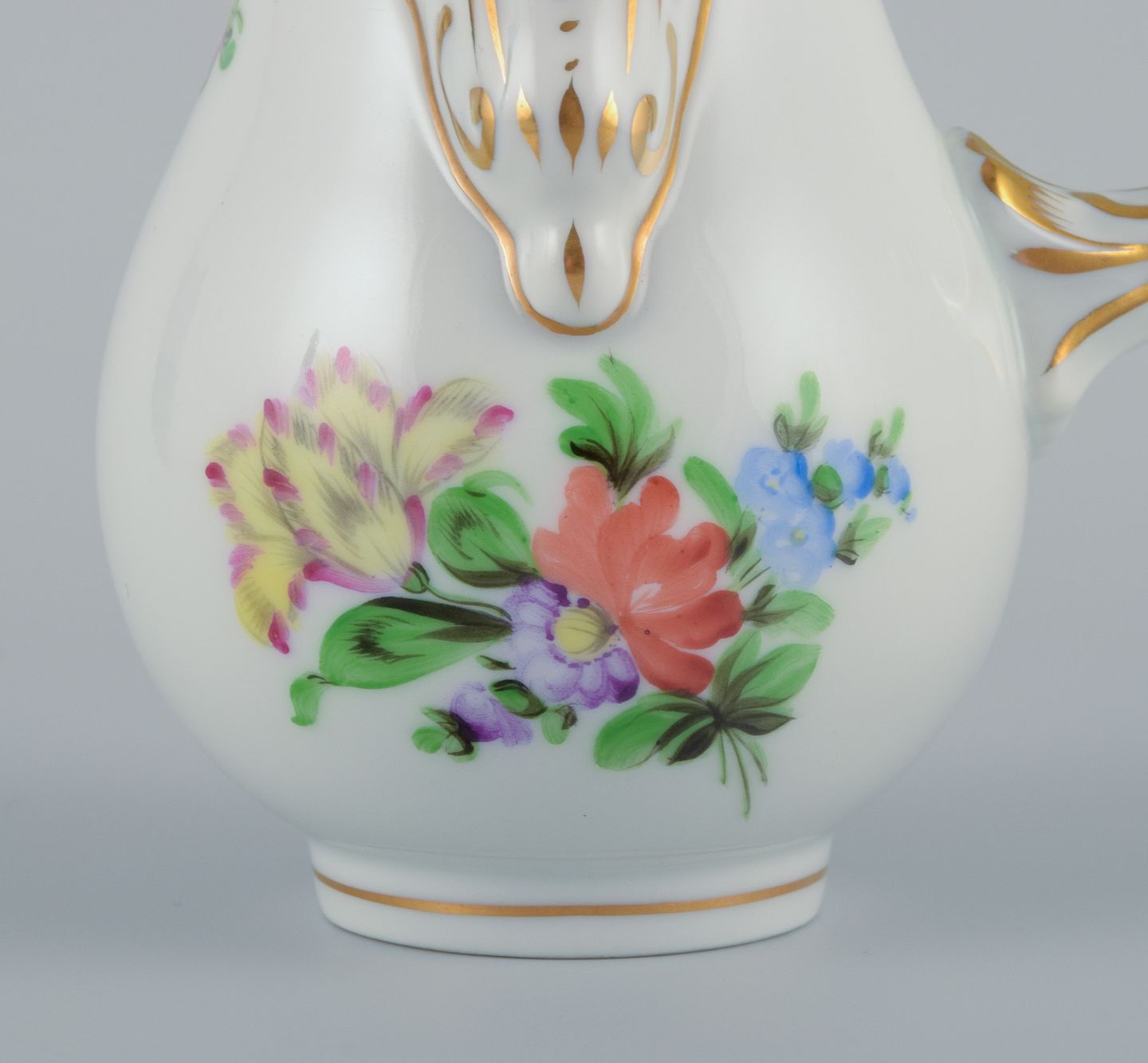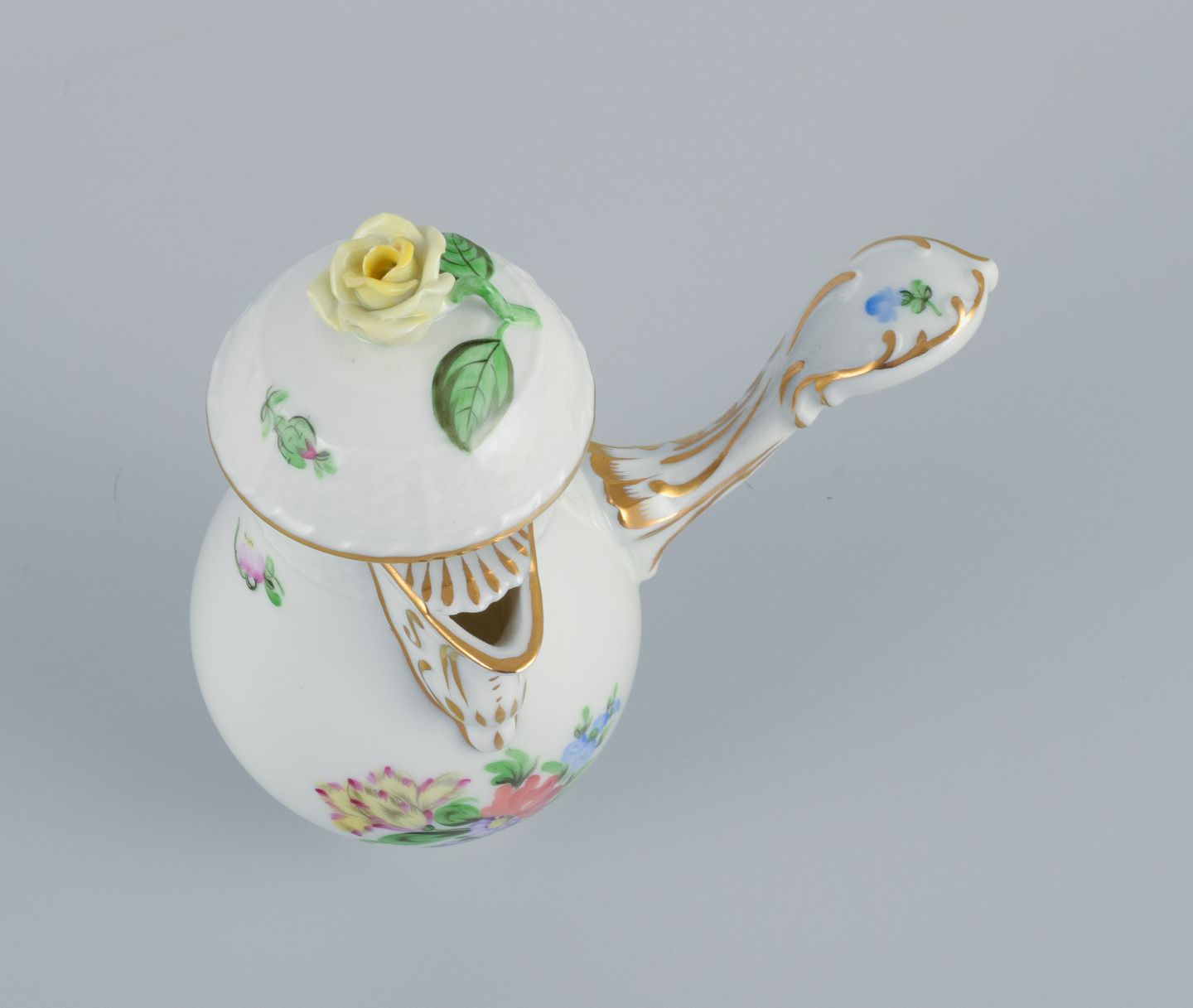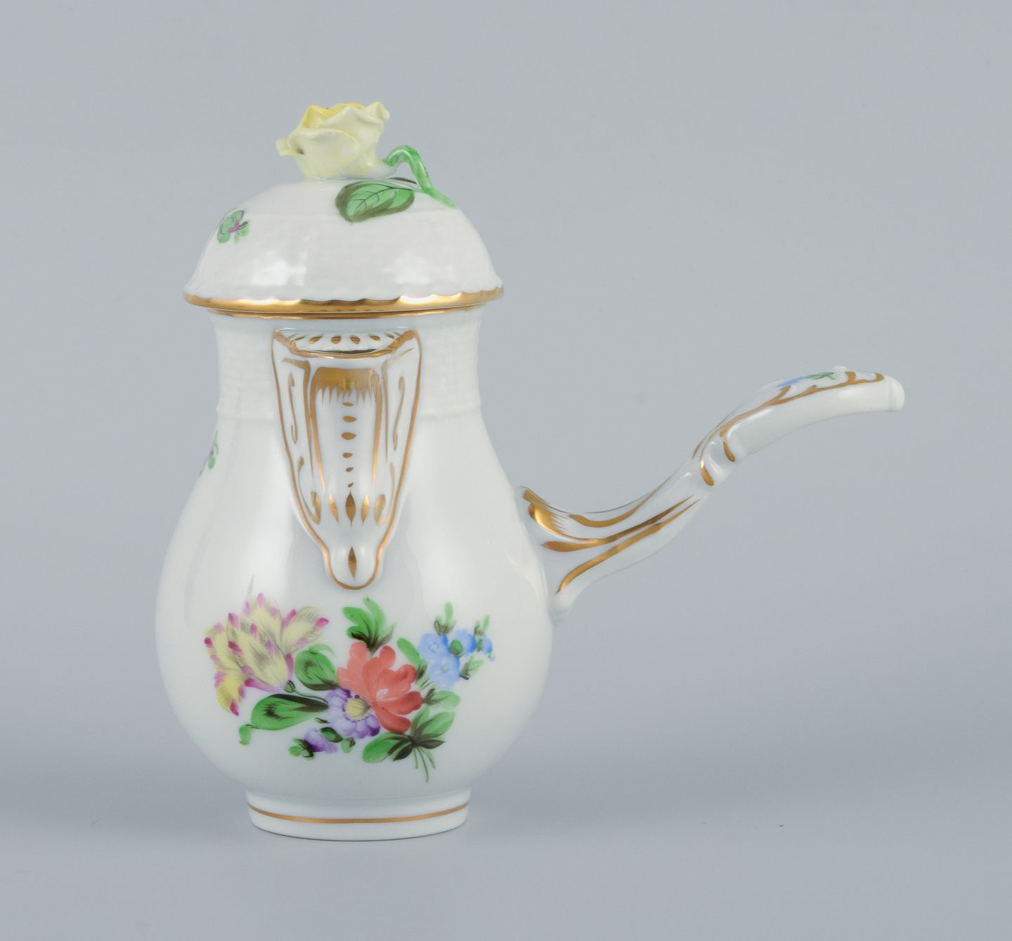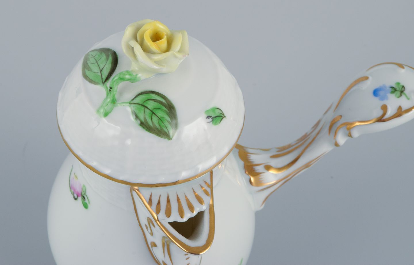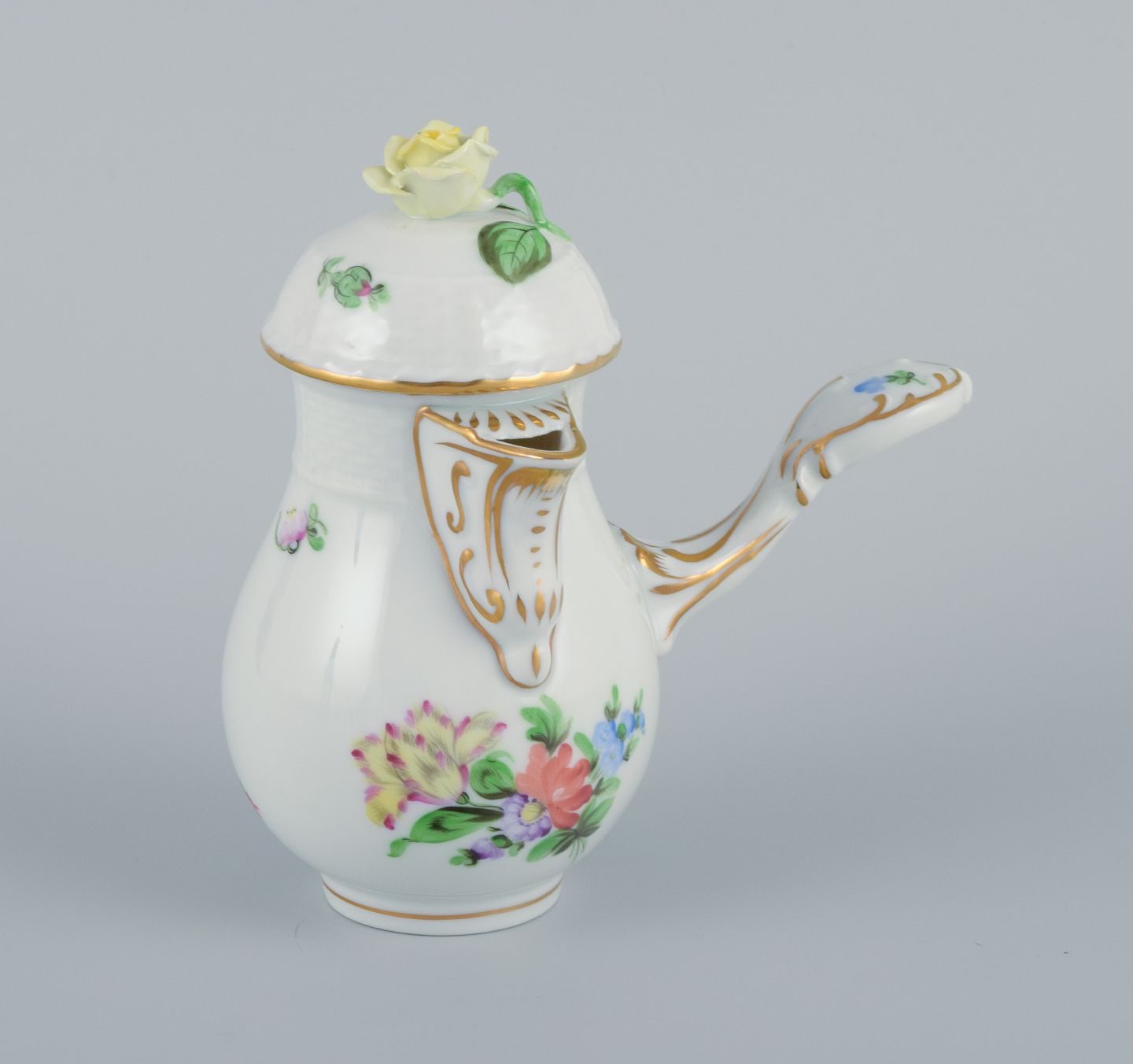 Herend, small chocolate jug with handle hand-painted with flowers. Yellow rose in relief on the lid.