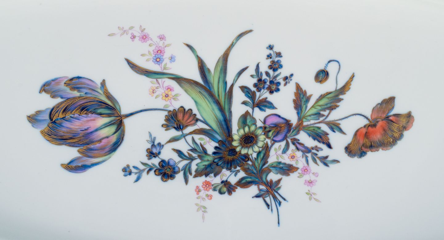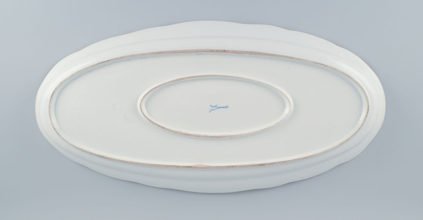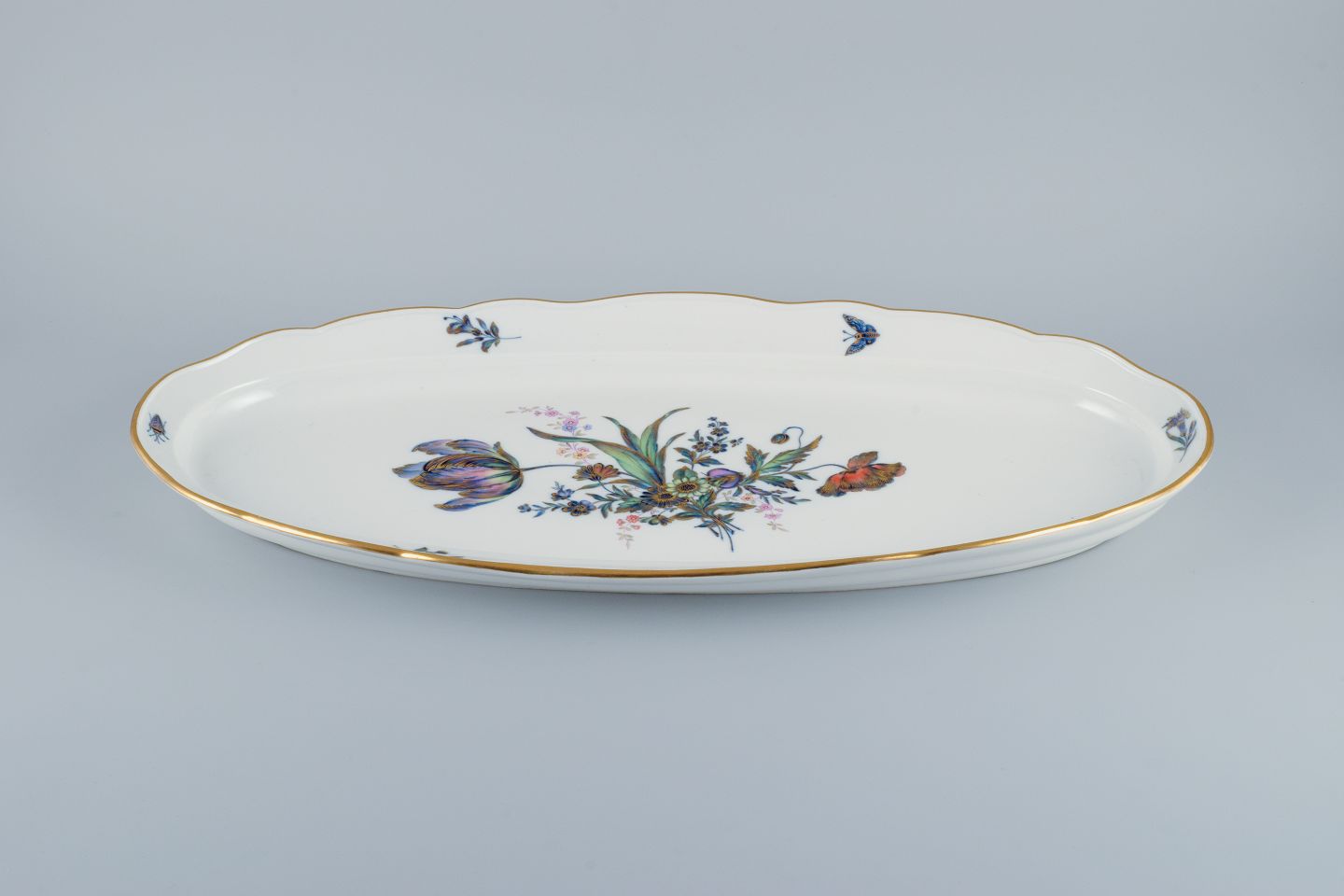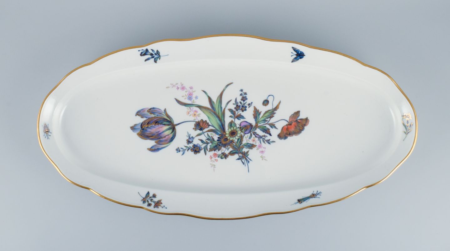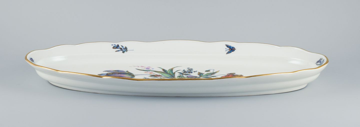 Meissen, Germany. Large fish platter, hand painted with flowers and insects and gold rim. Approx. 1900. In perfect condition. First factory quality. Marked. Dimensions: L 62.5 x D 30.5 x H 5.5 cm.