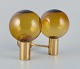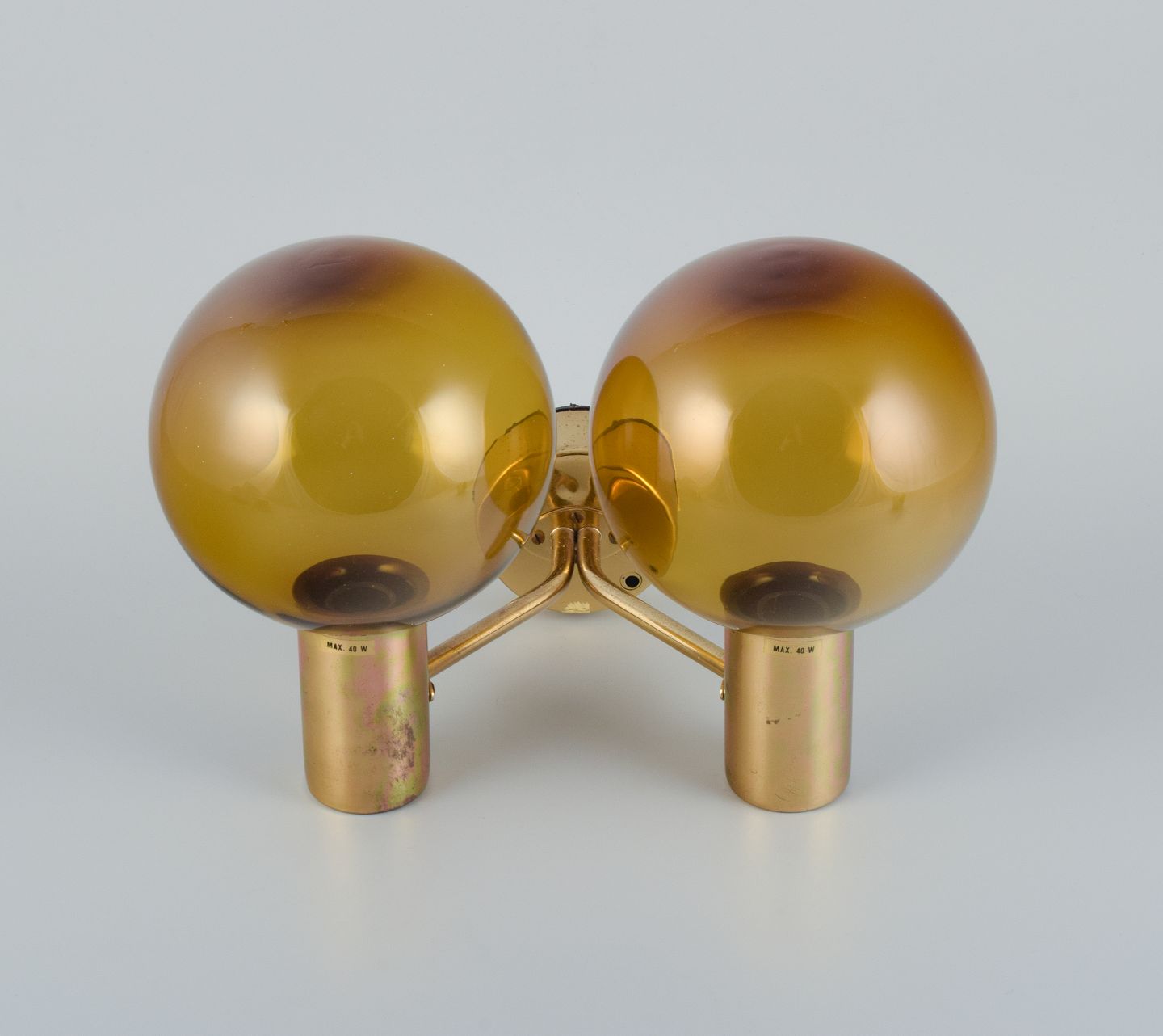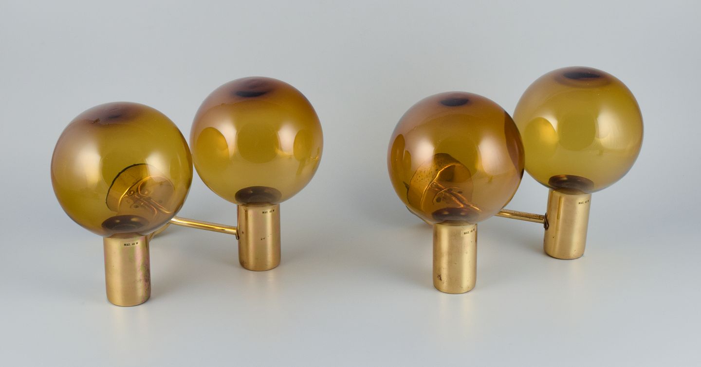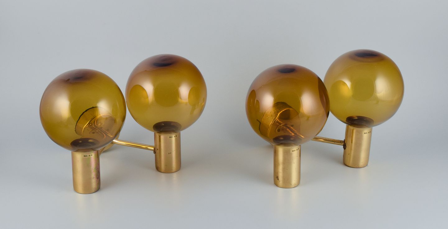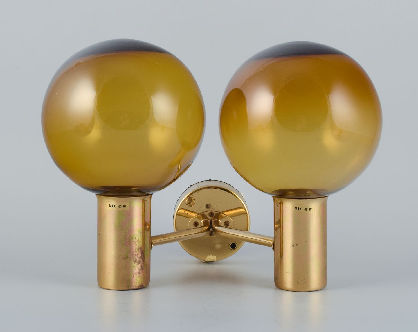 Hans Agne Jakobsson, Sweden, a pair of double wall sconces in brass and smoked glass. 1970s. In excellent condition with minimal signs of use. 220 volts. Sticker. Dimensions: H 22.0 x L 23.0