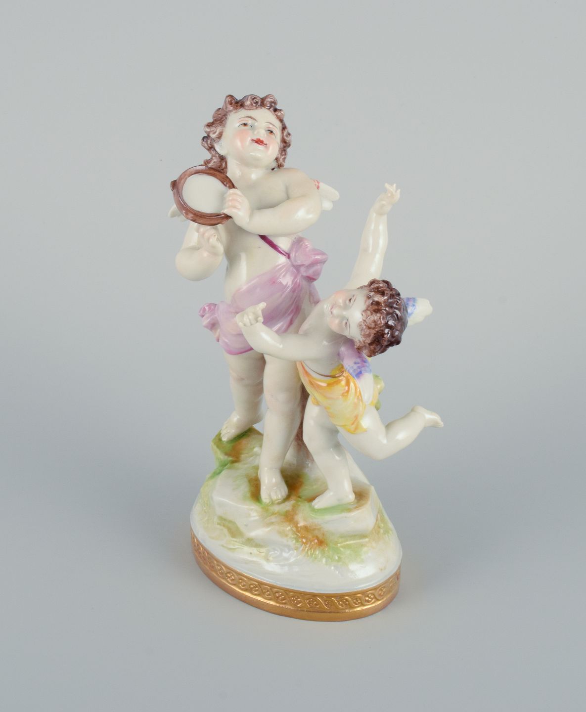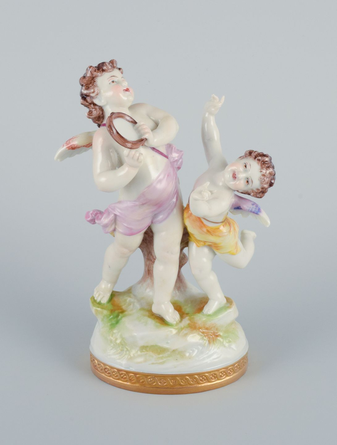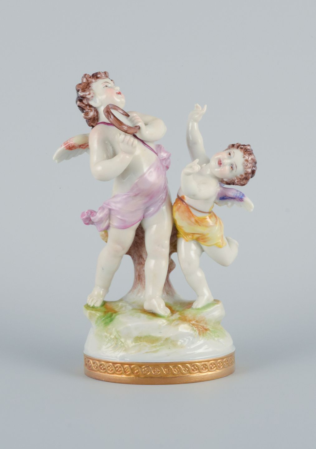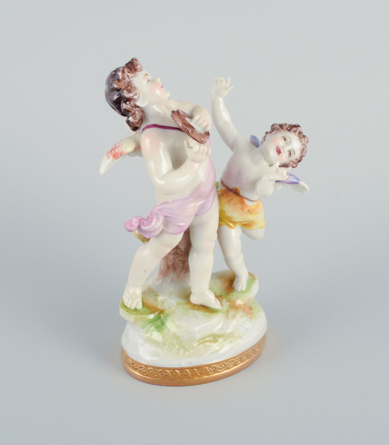Rudolstadt Volkstedt, Germany, porcelain figure with two putti in play. Signed. Hand painted, overglaze. Early 20th century. In excellent condition. Dimensions: H 15.0 x W 10.0 cm.