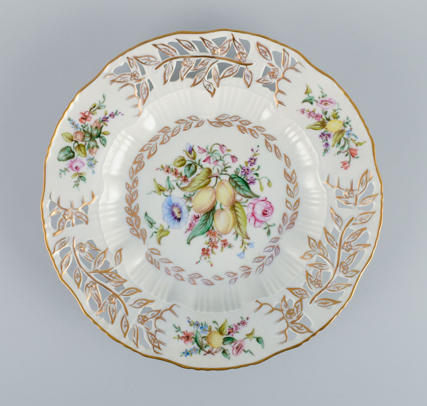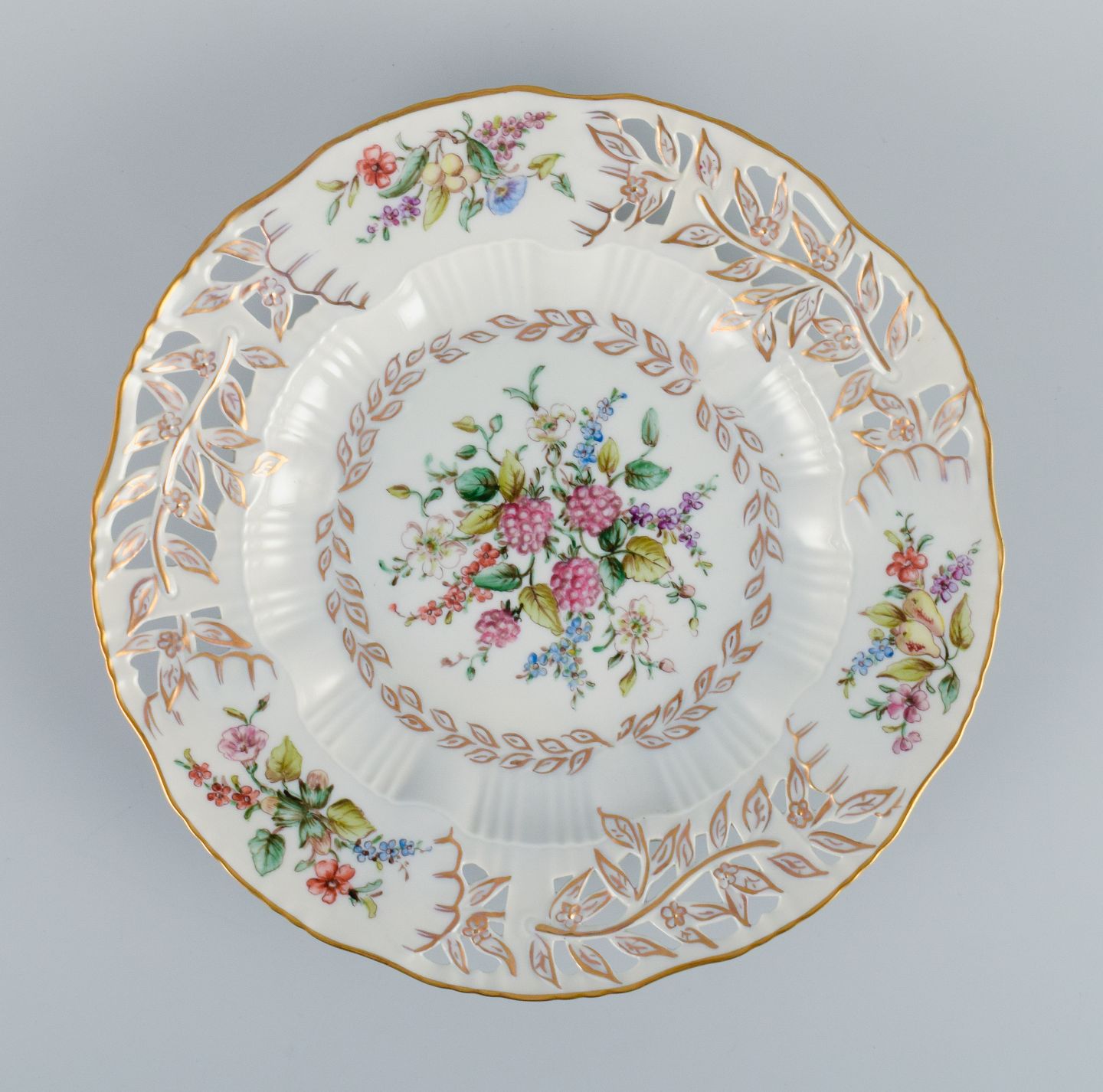 Royal Copenhagen, et sæt på fire antikke middagstallerkner med gennembrudt kant og bladværk.