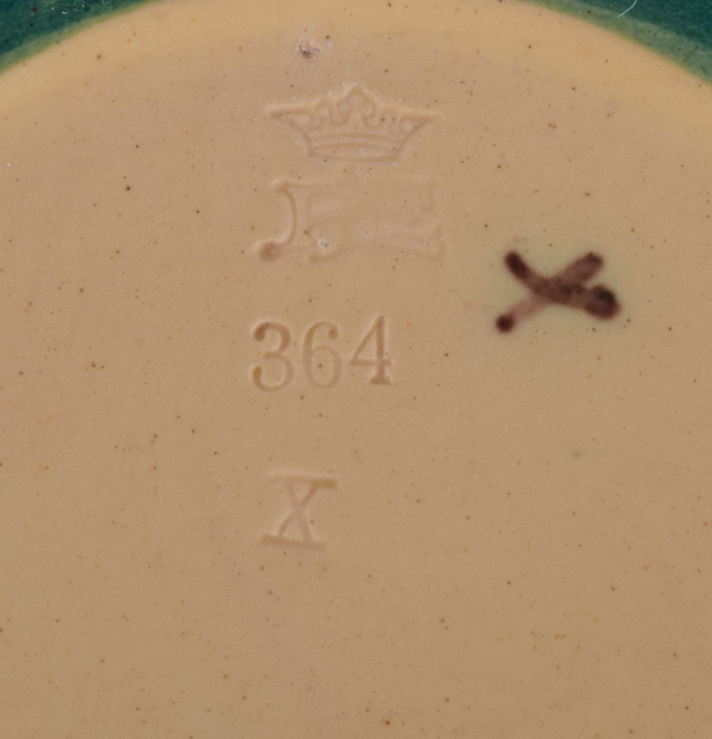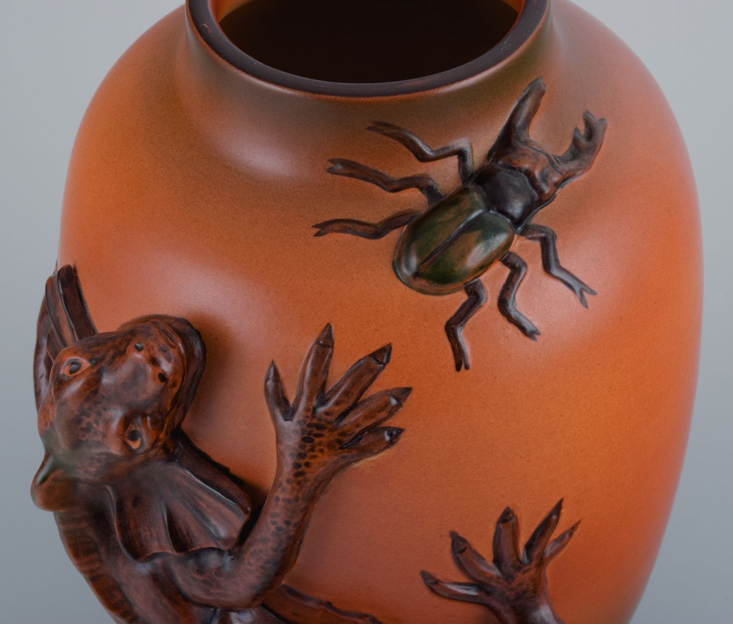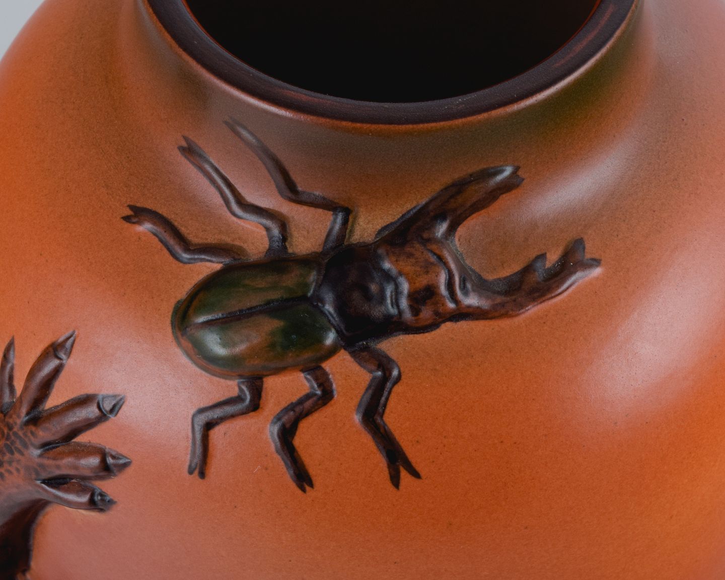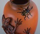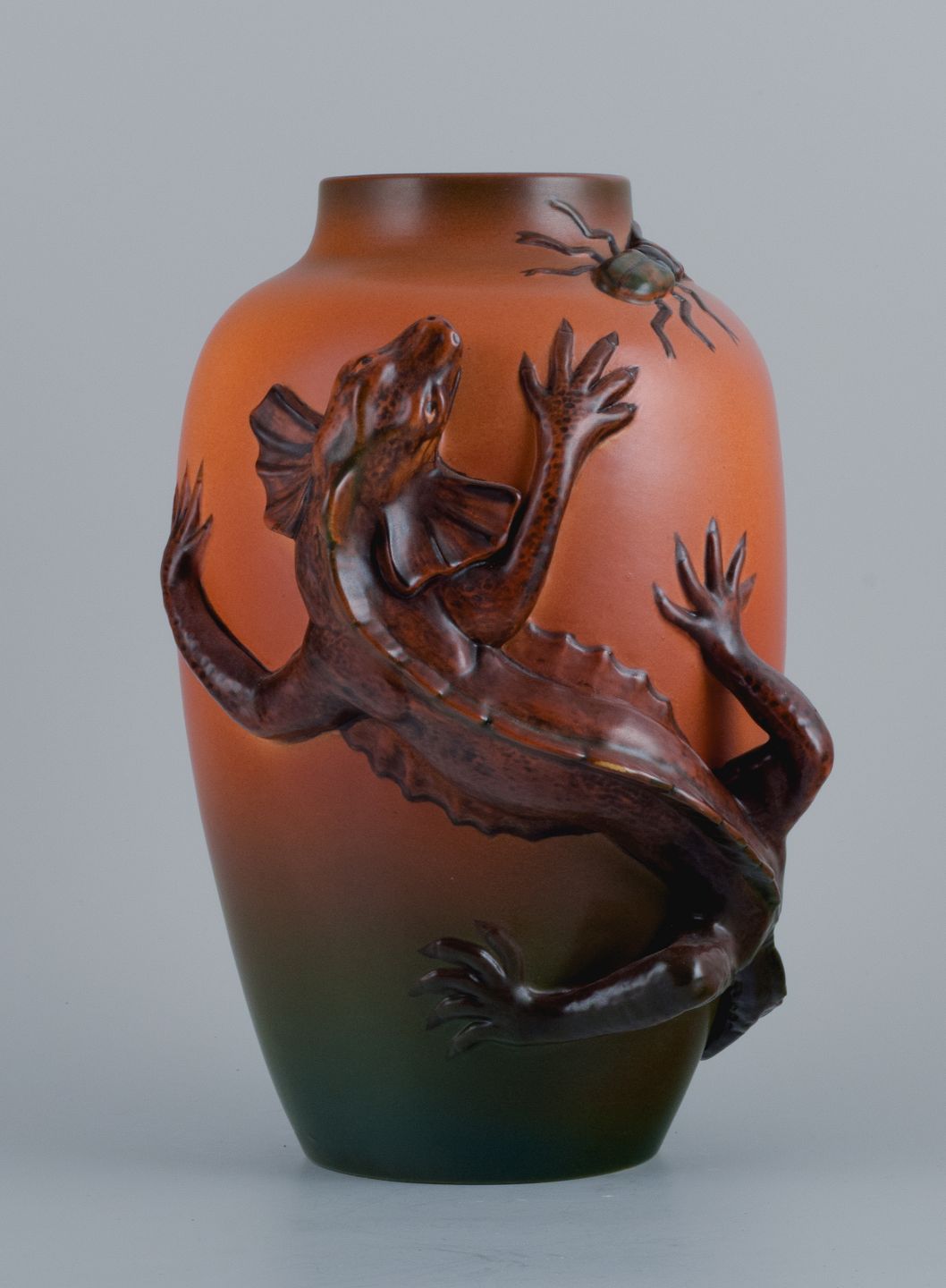 Ipsens Enke, Danmark. Vase i håndmalet glaseret keramik med firben og bille. Ca. 1920. Modelnummer 364. Stemplet. I flot stand. Mål: H 27,0 x D 18,0 cm.