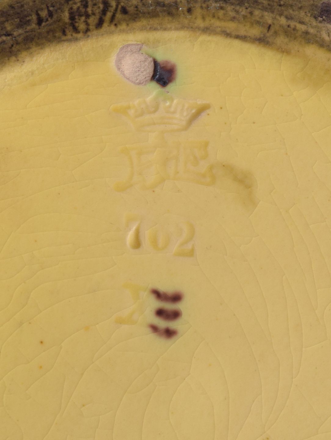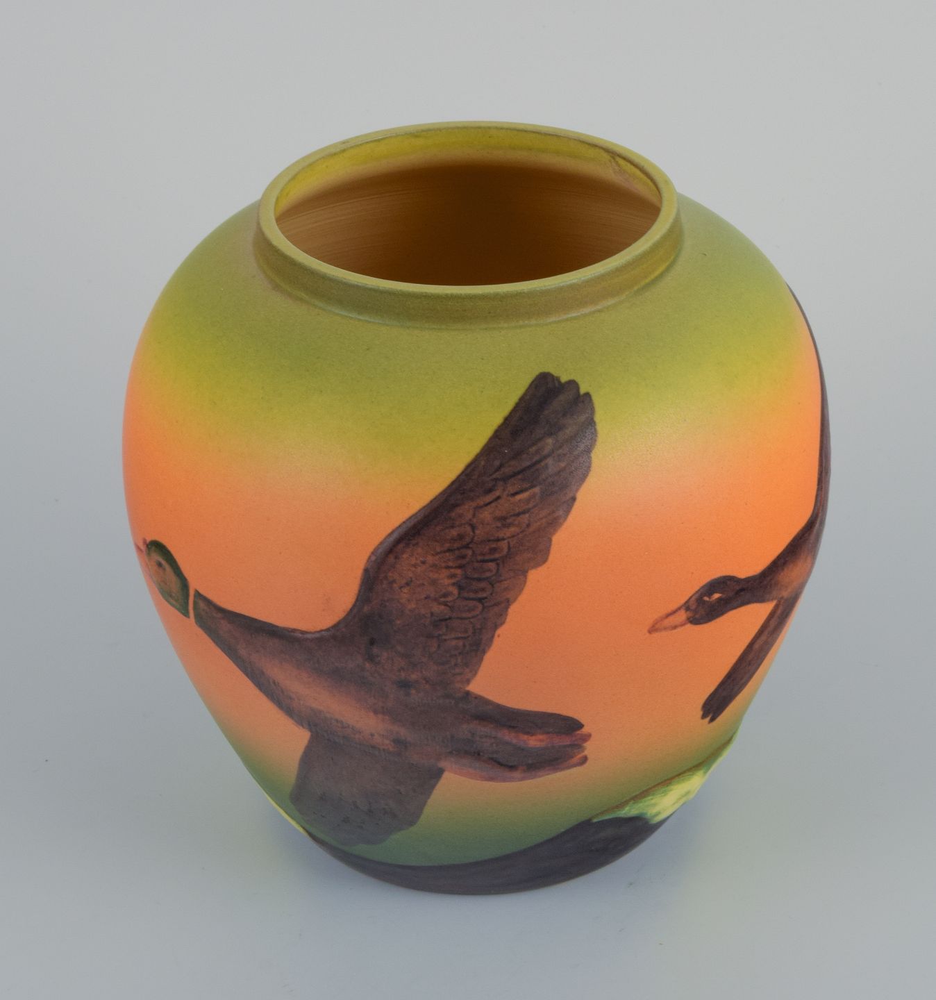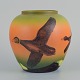 Ipsens Enke, vase med ænder, glasur i orange og grønne toner. Modelnummer 762. 1920/30'erne. Stemplet. I flot stand. Mål: D 16,0 x H 16,0 cm.