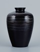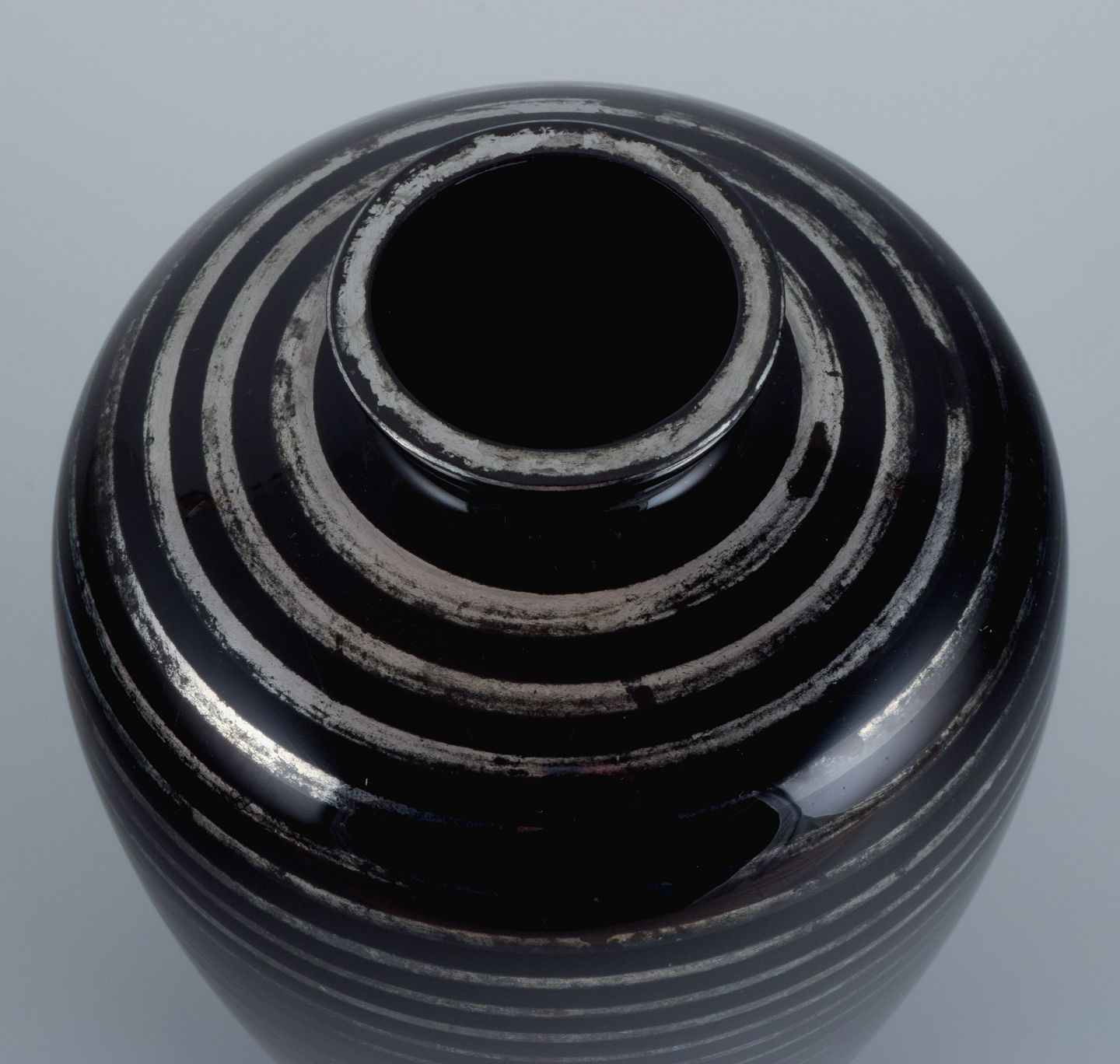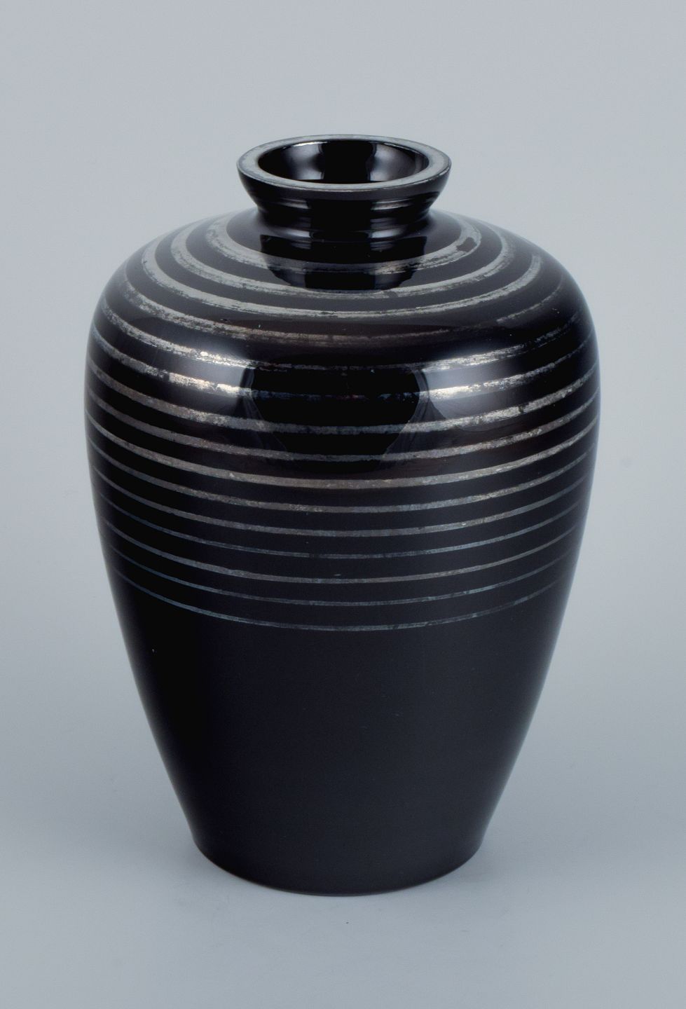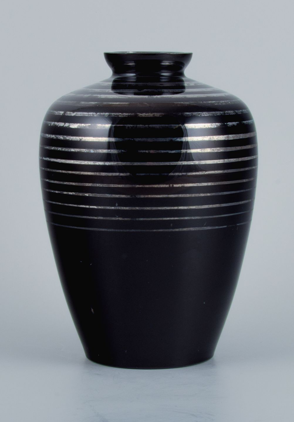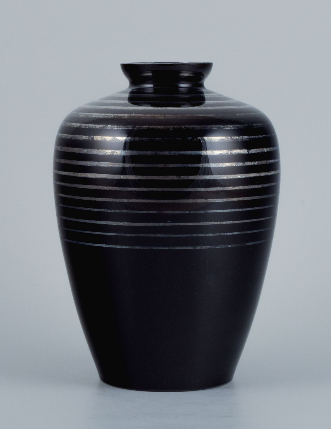 Art Deco glasvase, Tyskland. Med horisontale sølvindlæg. 1930/40’erne. I flot stand med mindre slid. Signeret J. Mål: H 20,0 x D 13,5 cm.