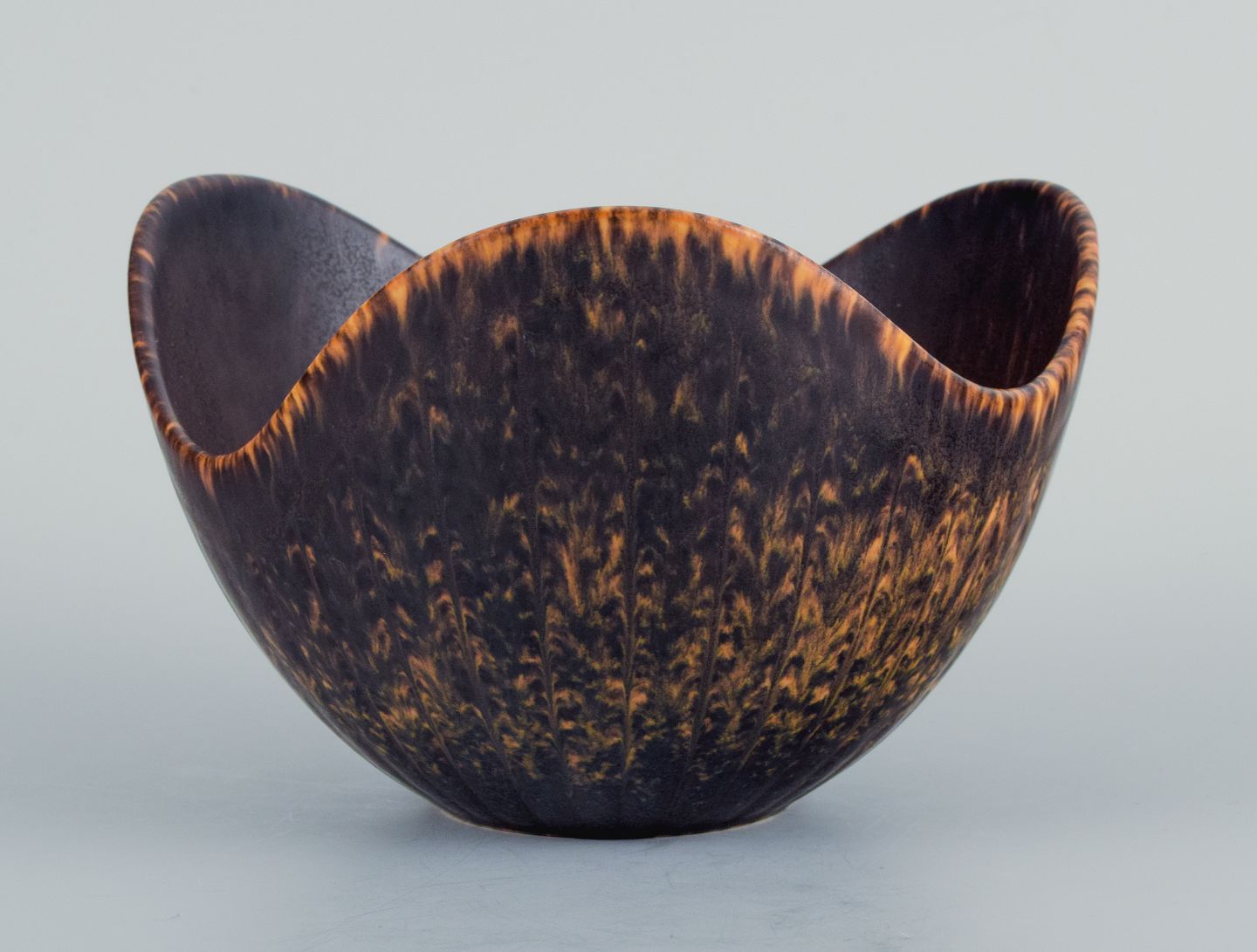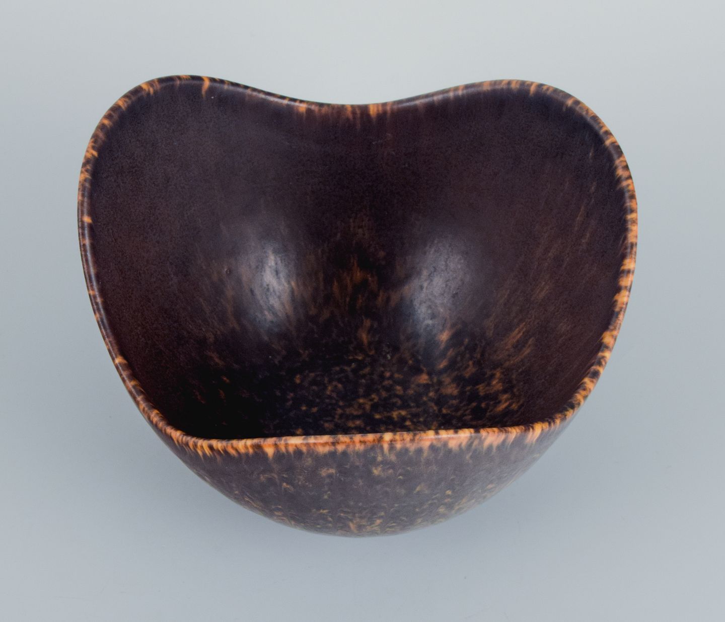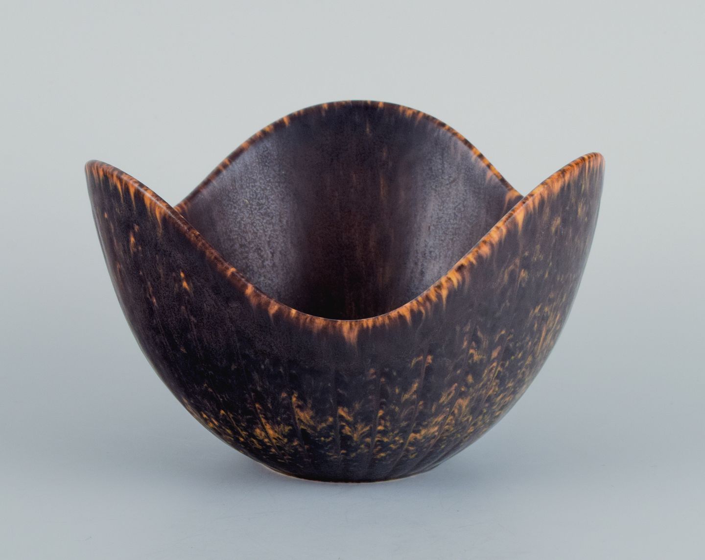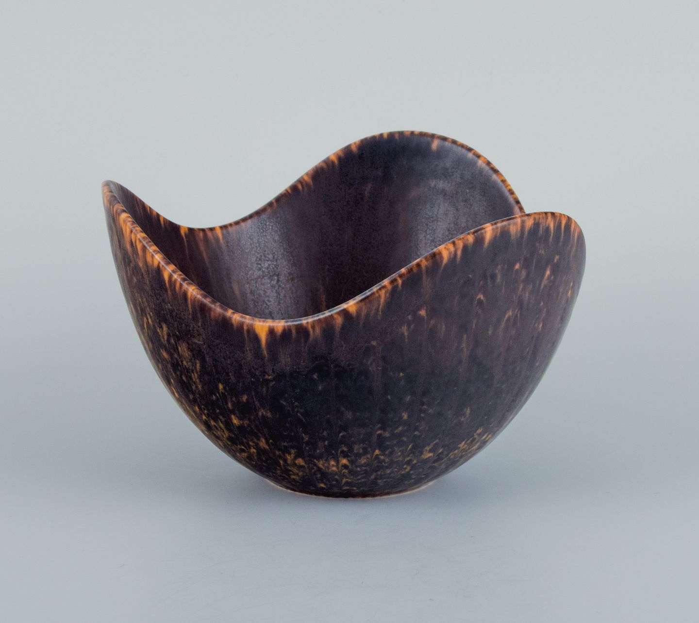 Gunnar Nylund (1904–1997) for Rörstrand. Ceramic bowl, organic shape with dark brown and orange glaze. Mid 20th century. In perfect condition. Marked. Dimensions: D 14.0 x H 9.0 cm.