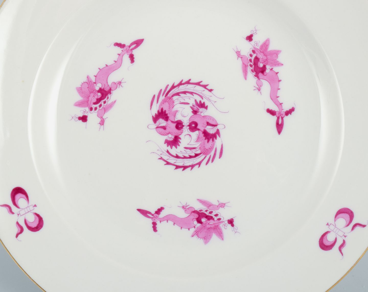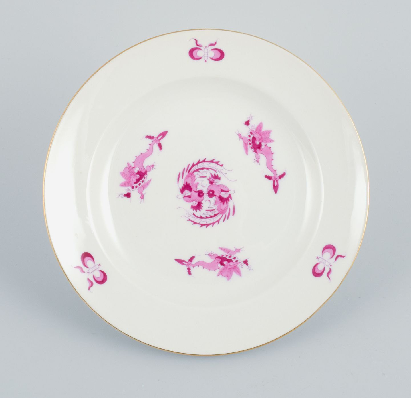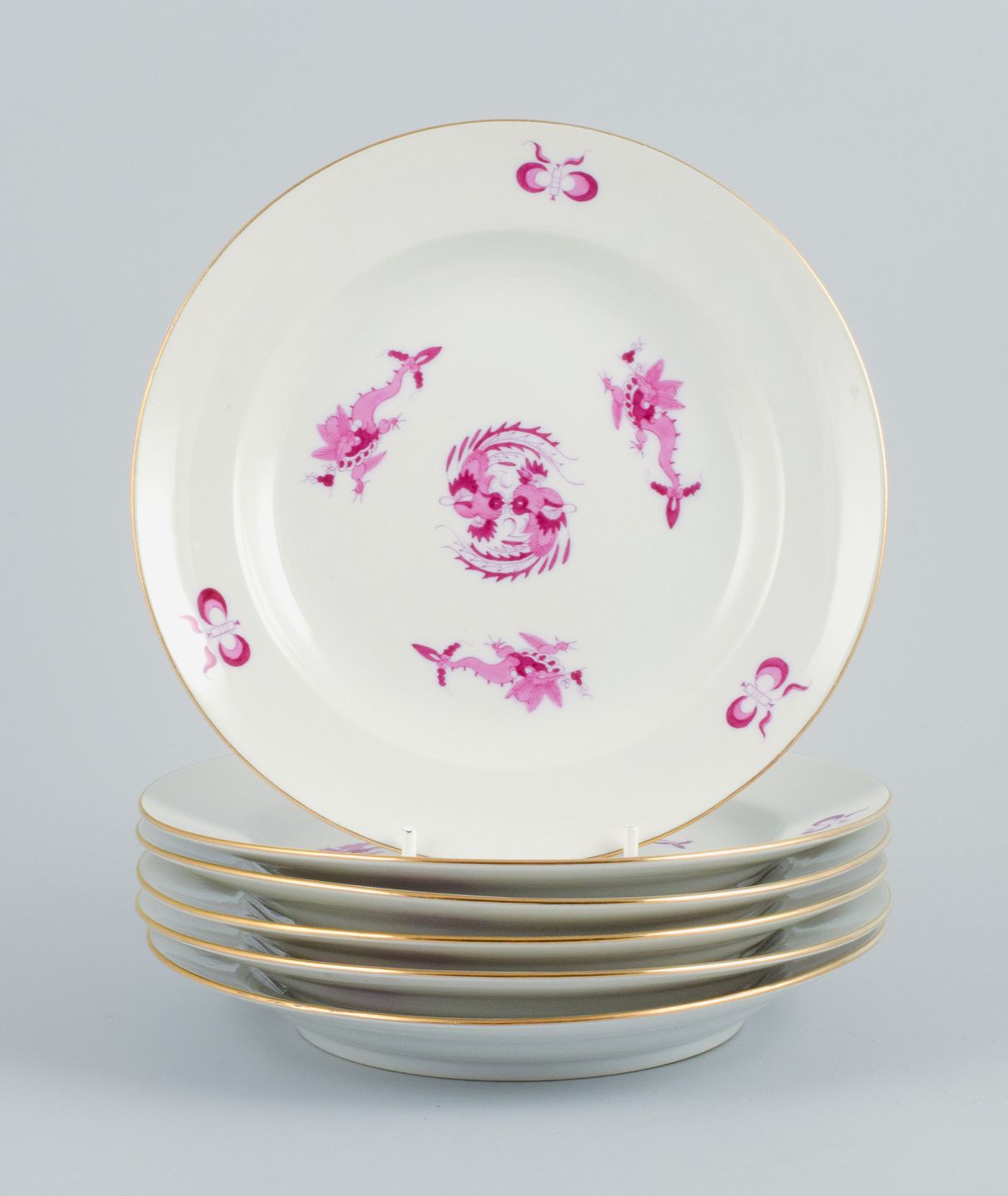 Meissen, Germany, Rich Court Dragon, a set of six plates in purple with gold decoration. Hand painted.