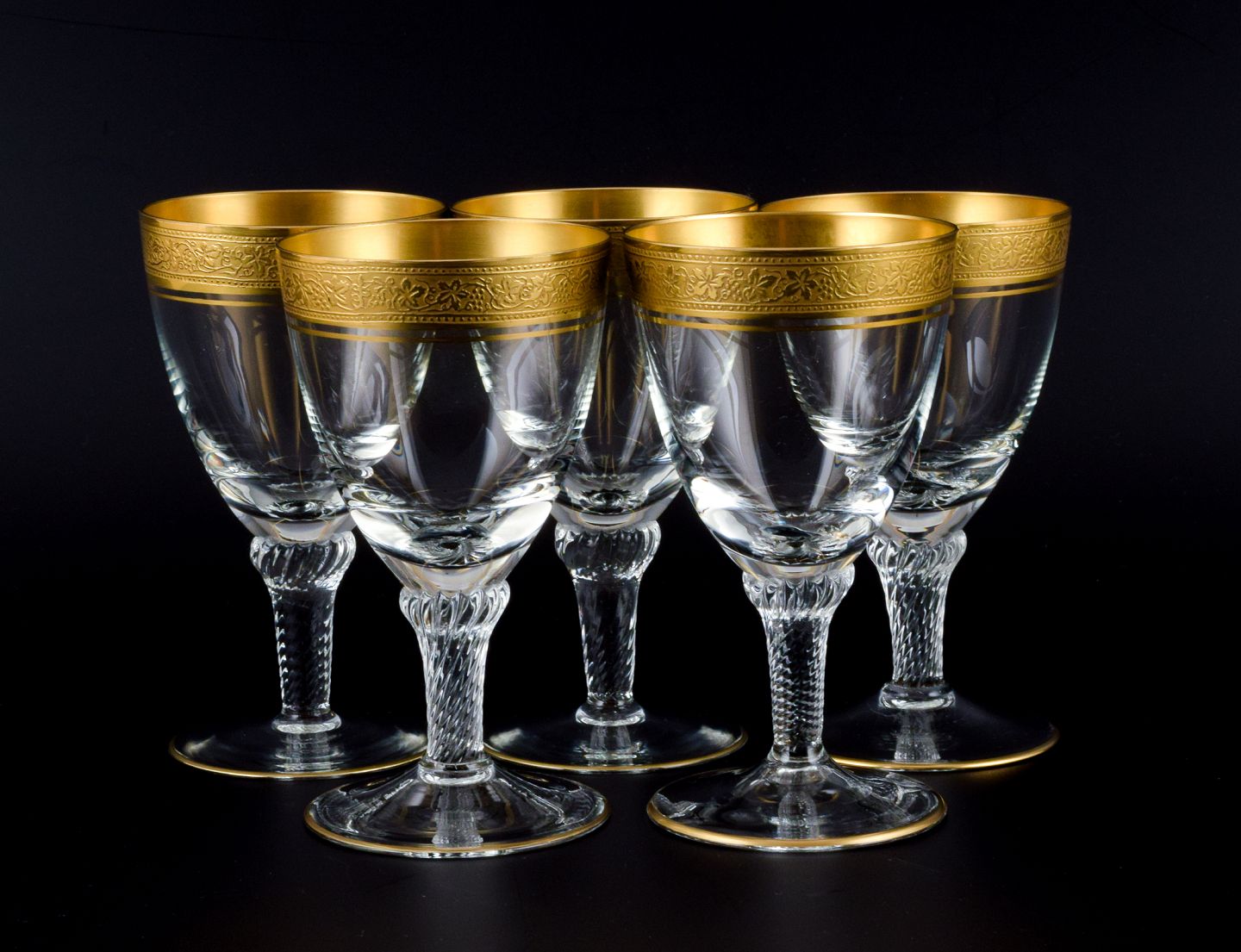 Rimpler Kristall, Zwiesel, Germany, five hand blown crystal white wine glasses with gold rim decorated with grapes and vine leaves. 1960s. In perfect condition. Dimensions: H 12.2 x D 7.0 cm