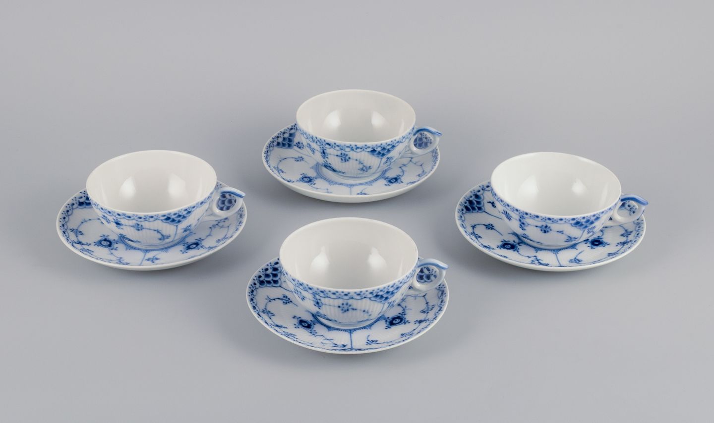 Royal Copenhagen, Blue Fluted half lace, four pairs of teacups.