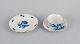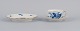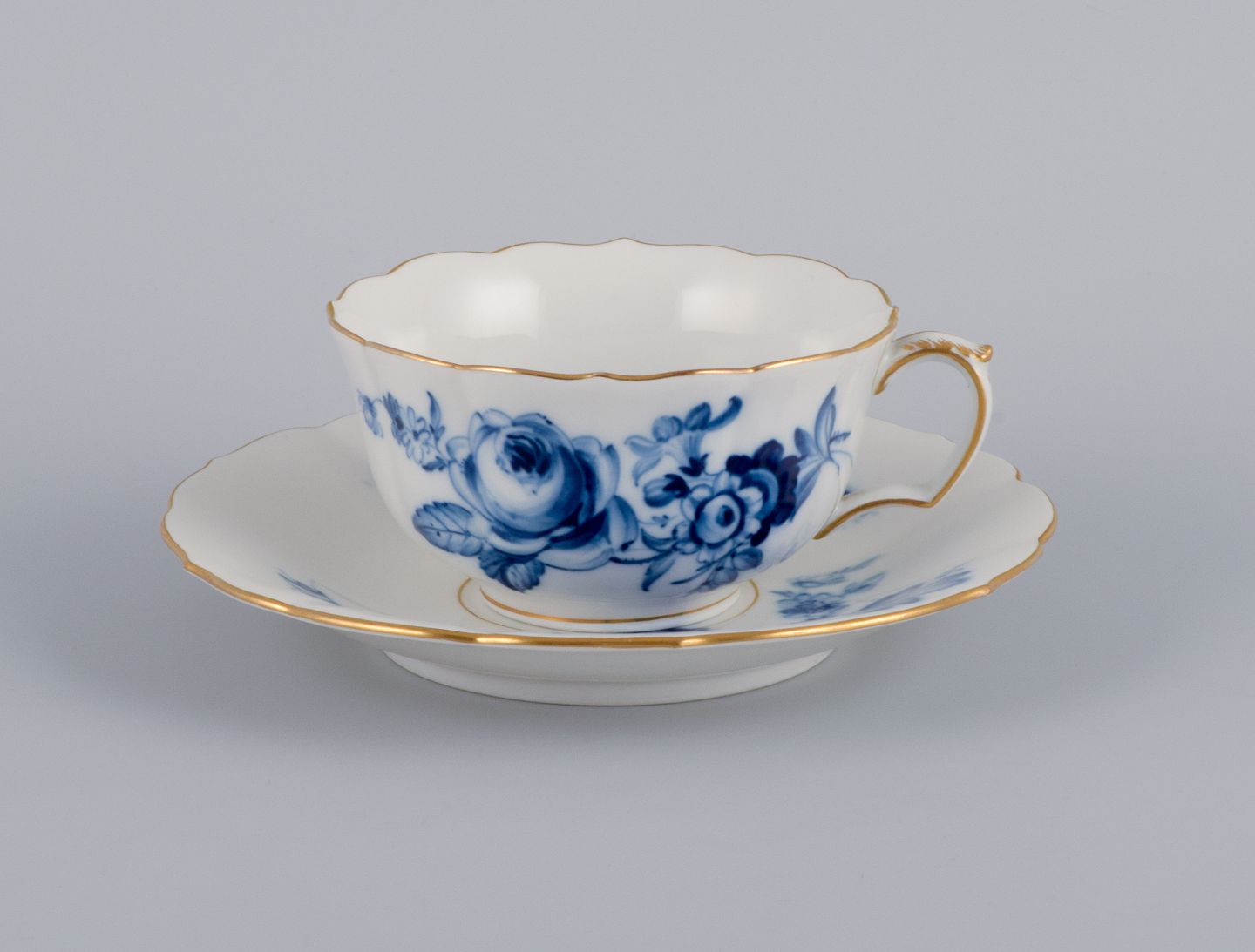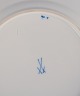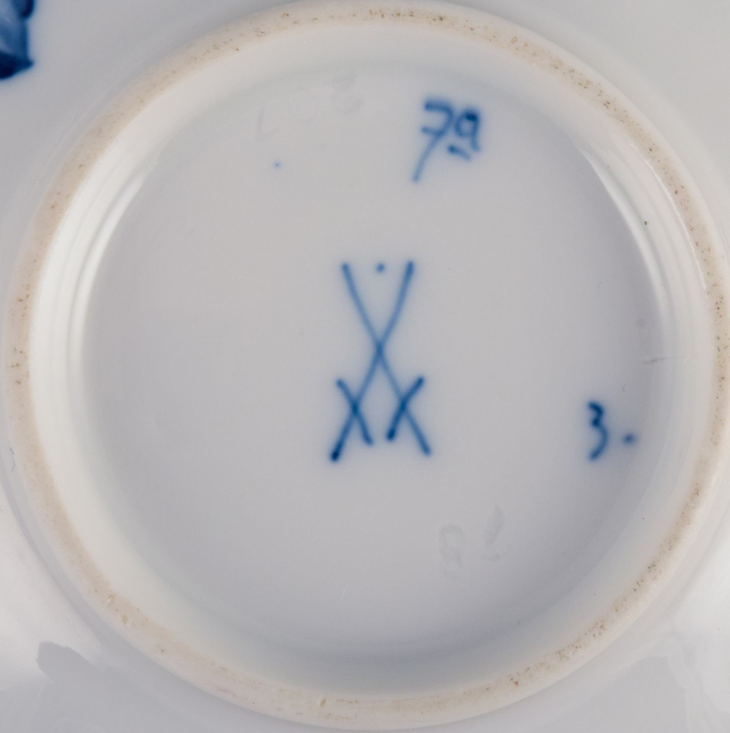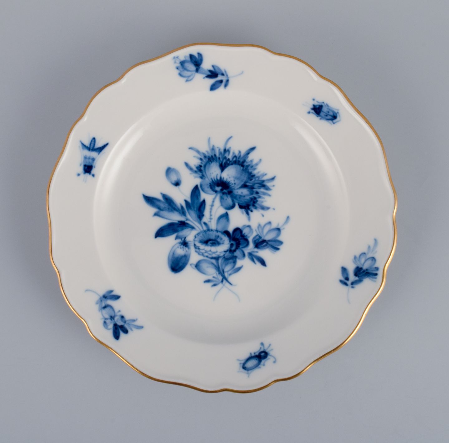 Hand painted in blue with flowers and insects. Gold decoration on edges.