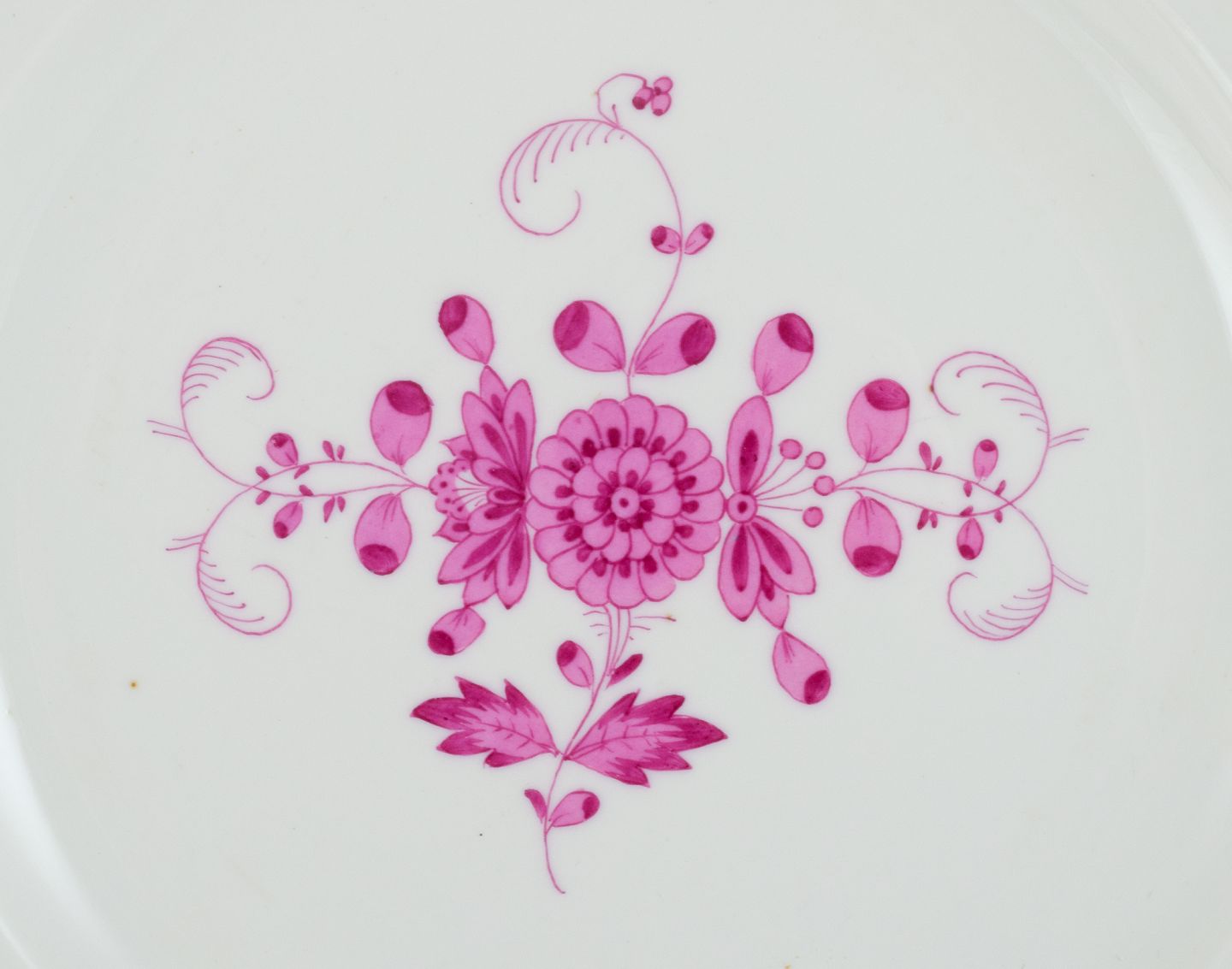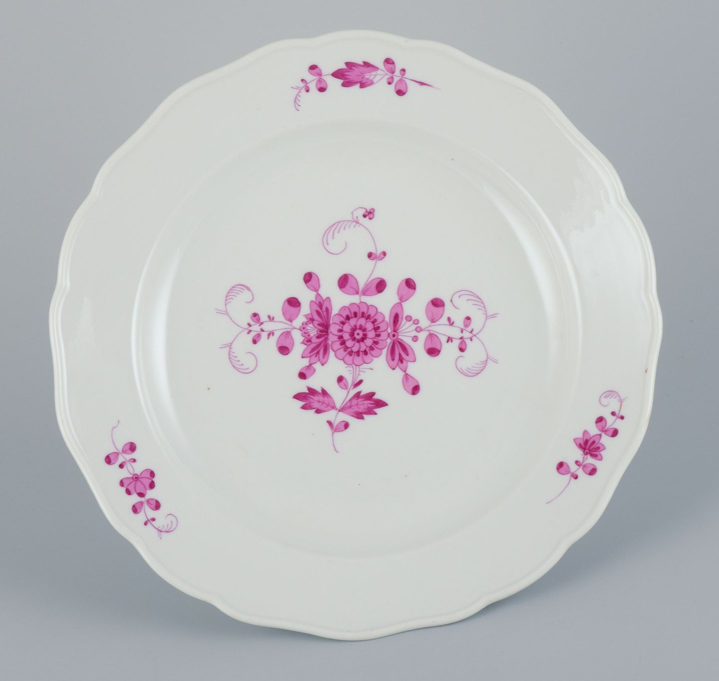 Meissen, Germany, Pink Indian, a set of four dinner plates. Hand painted in high quality. Approx. 1900. In perfect condition. Third factory quality. Marked. Dimensions: D 24.5 x 3.5 cm.