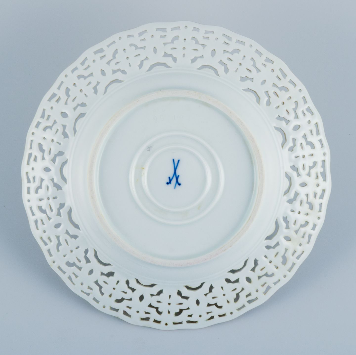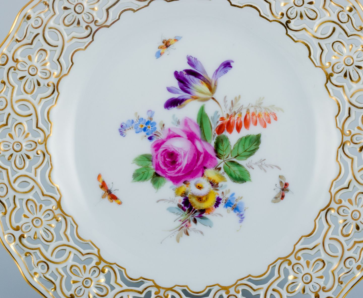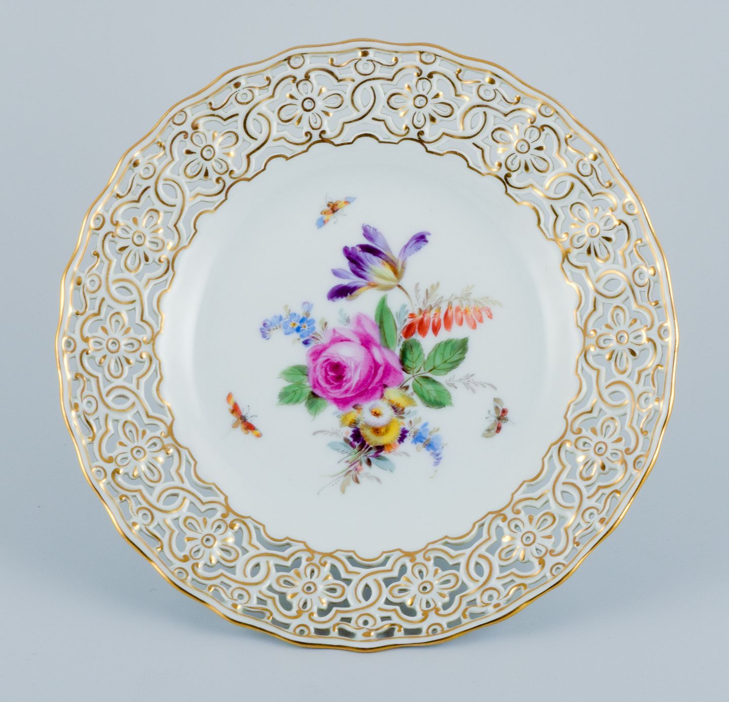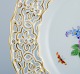 Meissen, gennembrudt tallerken håndmalet med blomster og sommerfugle.
