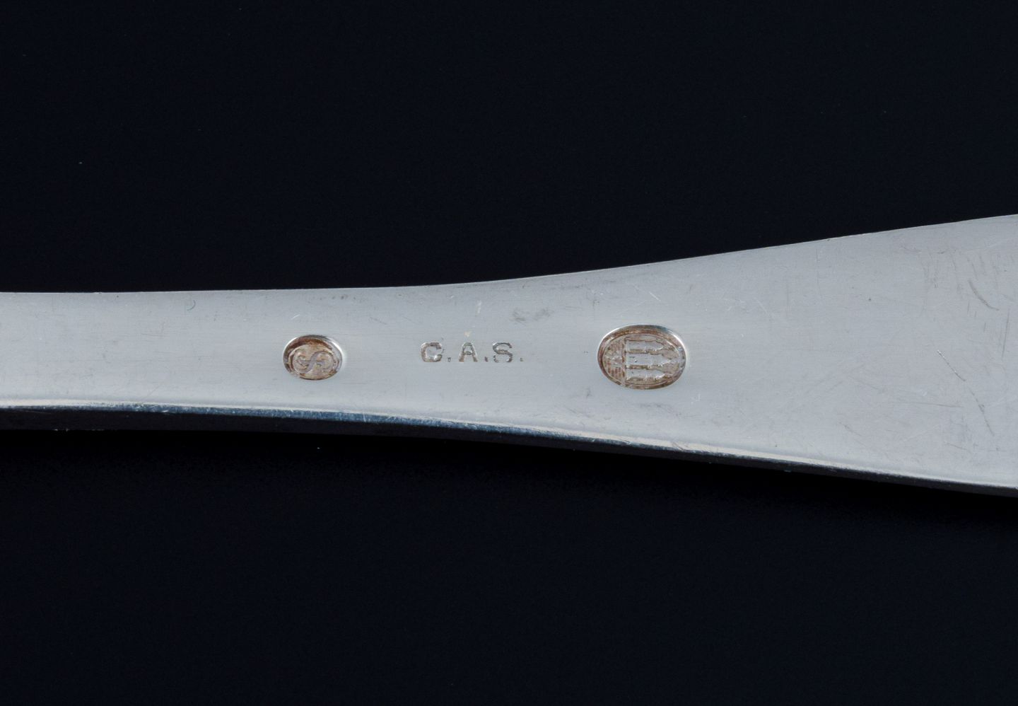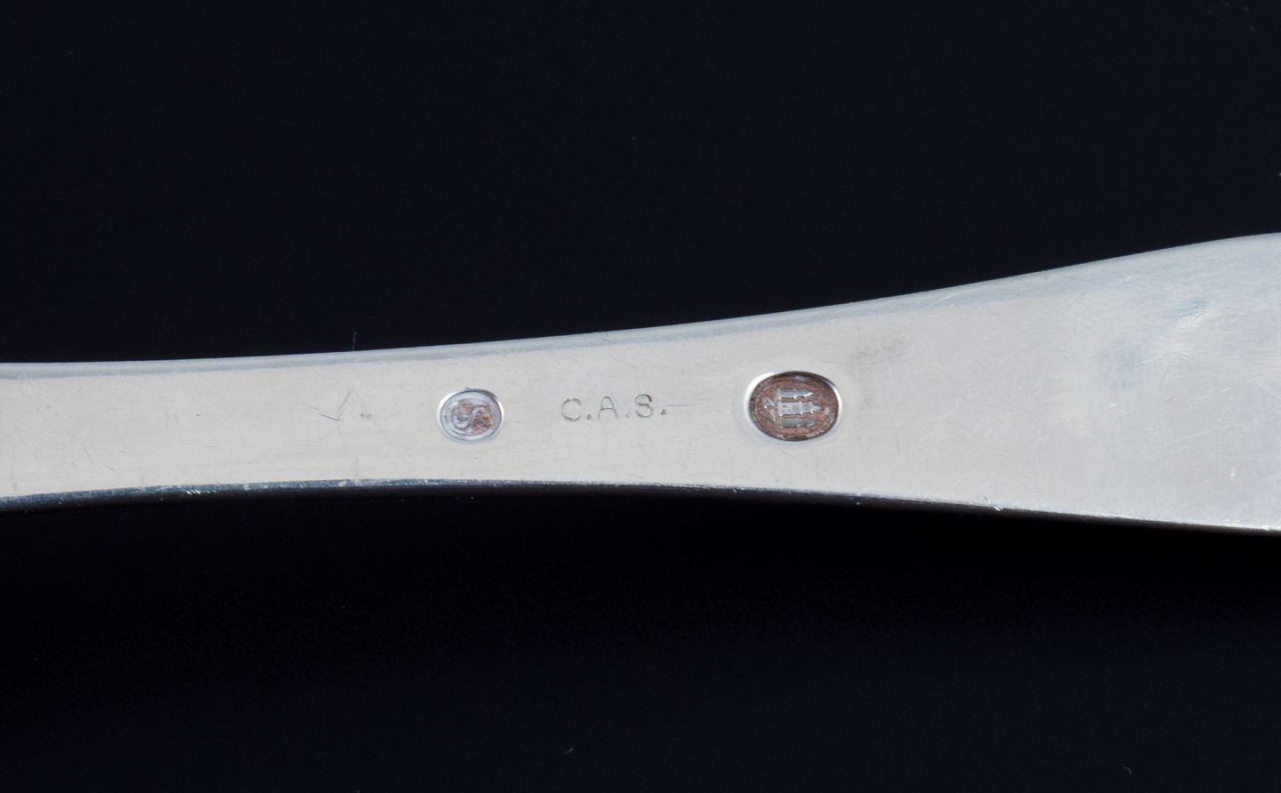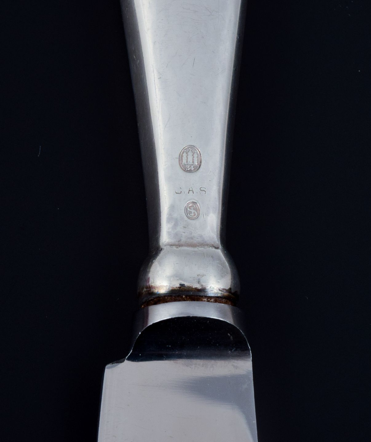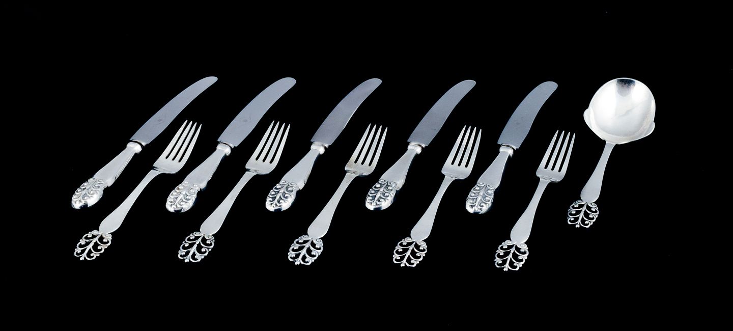 Dansk sølvsmed, middagsservice til fem personer bestående fem middagsknive, fem middagsgafler og en serveringsske.