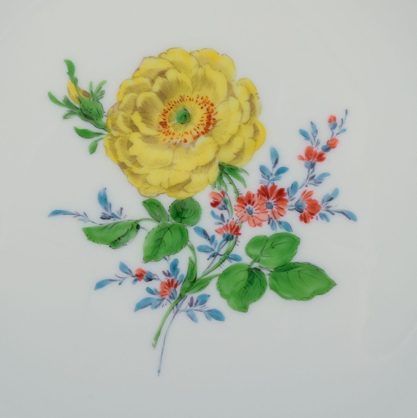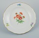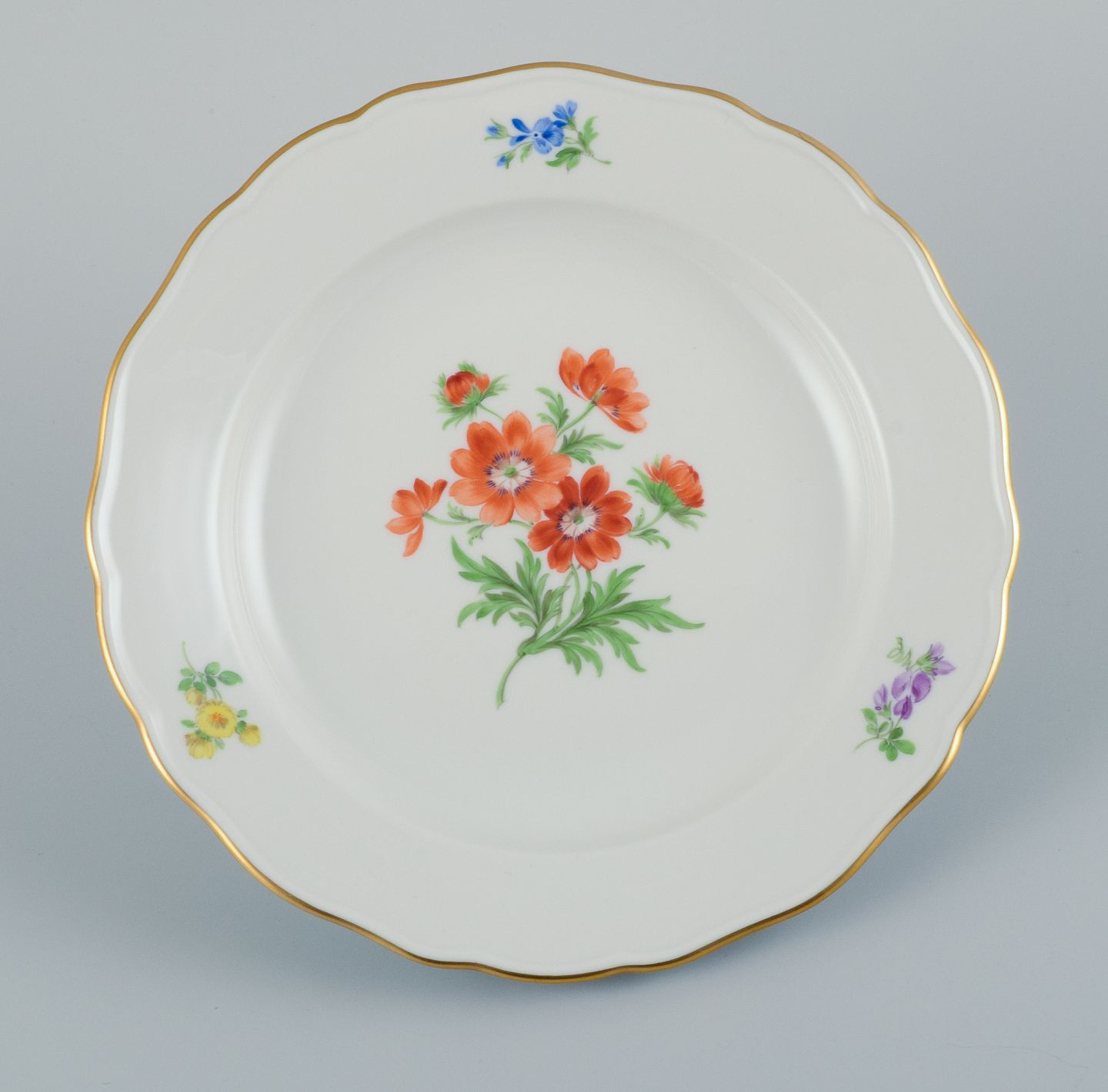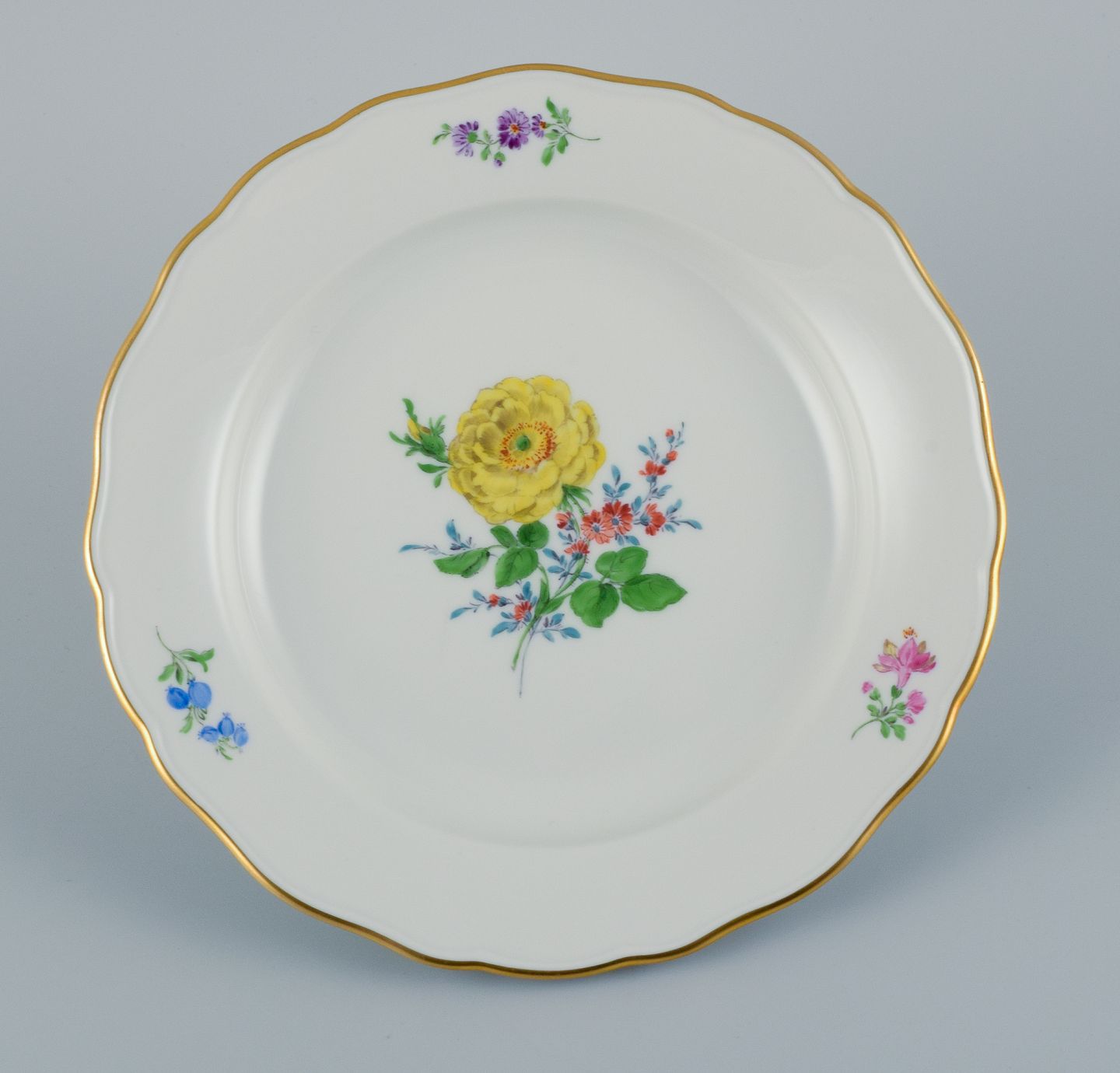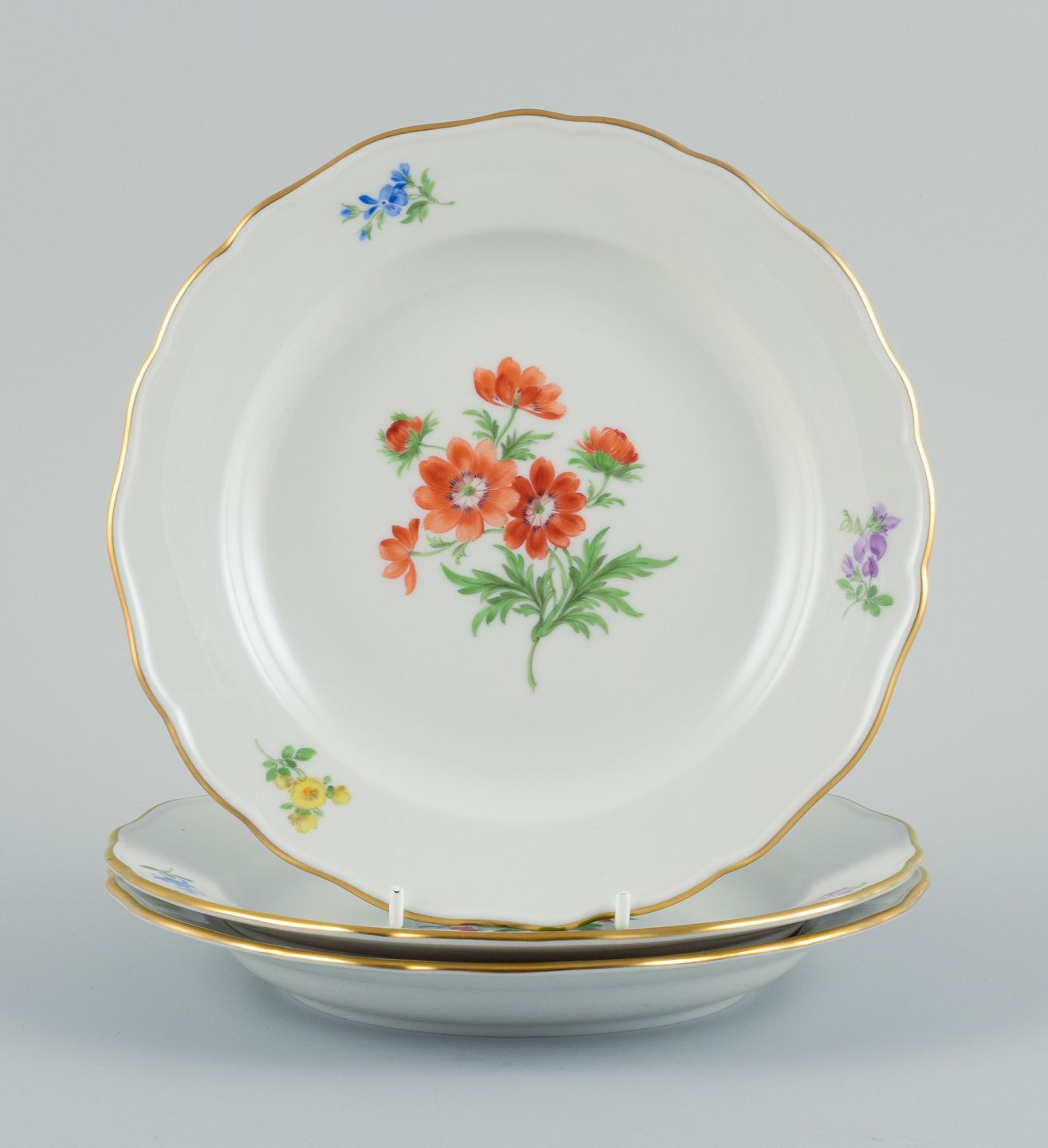 Meissen, Tyskland. Tre porcelænstallerkner håndmalet med forskellige blomstermotiver og guldkant. Ca. 1930’erne. I perfekt stand. Første sortering. Stemplet. Mål: D 19,8 cm.