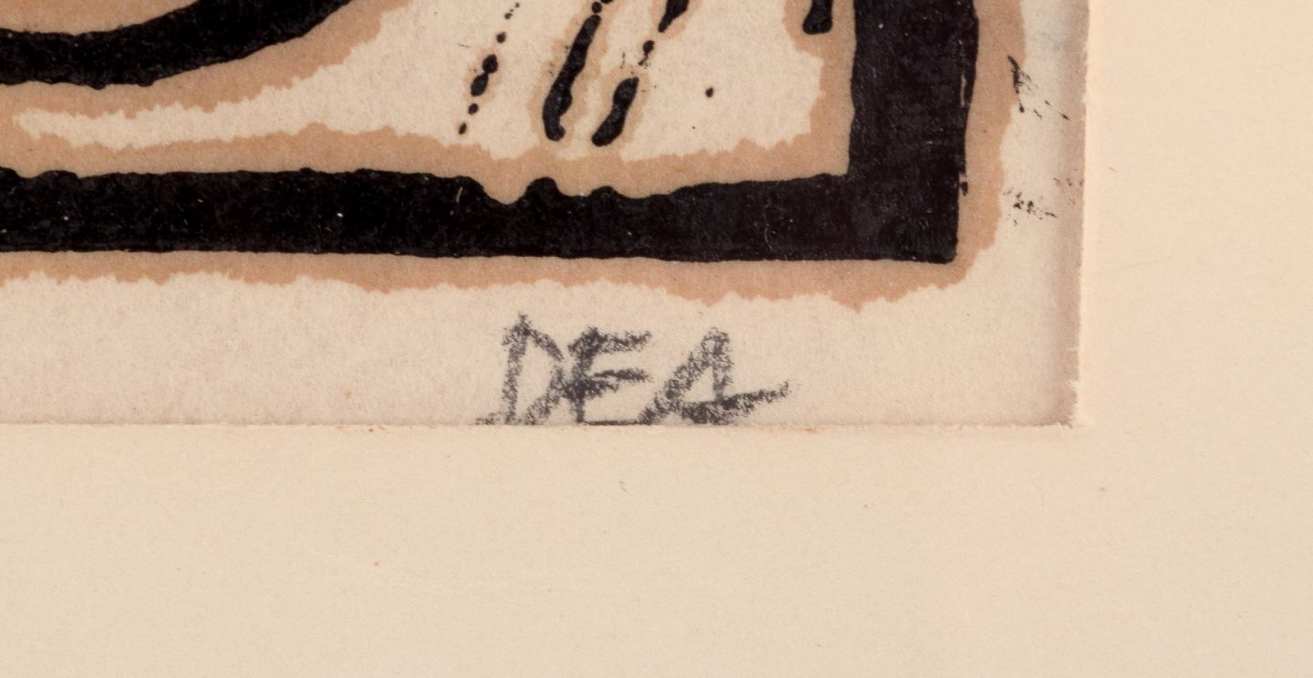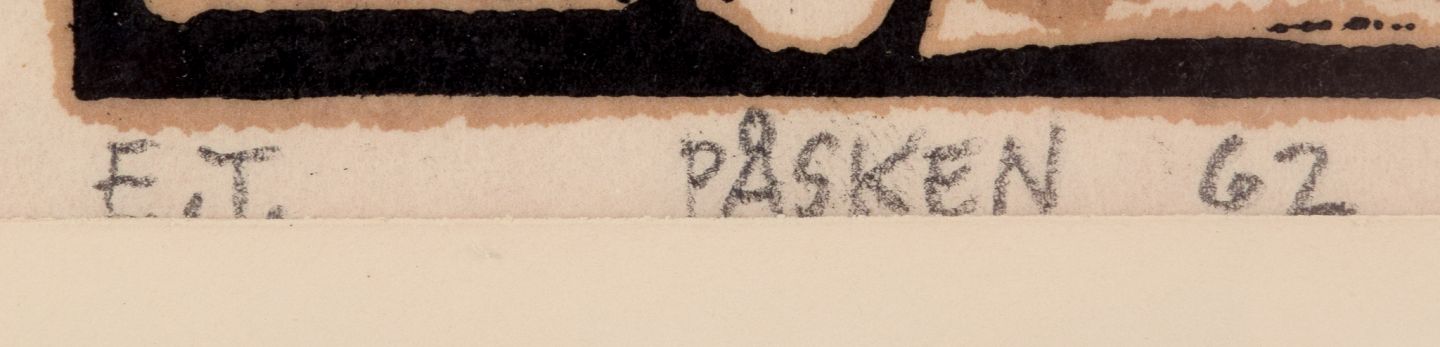 Dea Trier Mørch, træsnit på japanpapir. Abstrakt motiv. Signeret med blyant E.T. - Påsken 62 - Dea. I perfekt stand. Lysmål: B 18,5 x H 7,0 cm. Totalmål med ramme: B 28,7 x H 22,3 cm.
