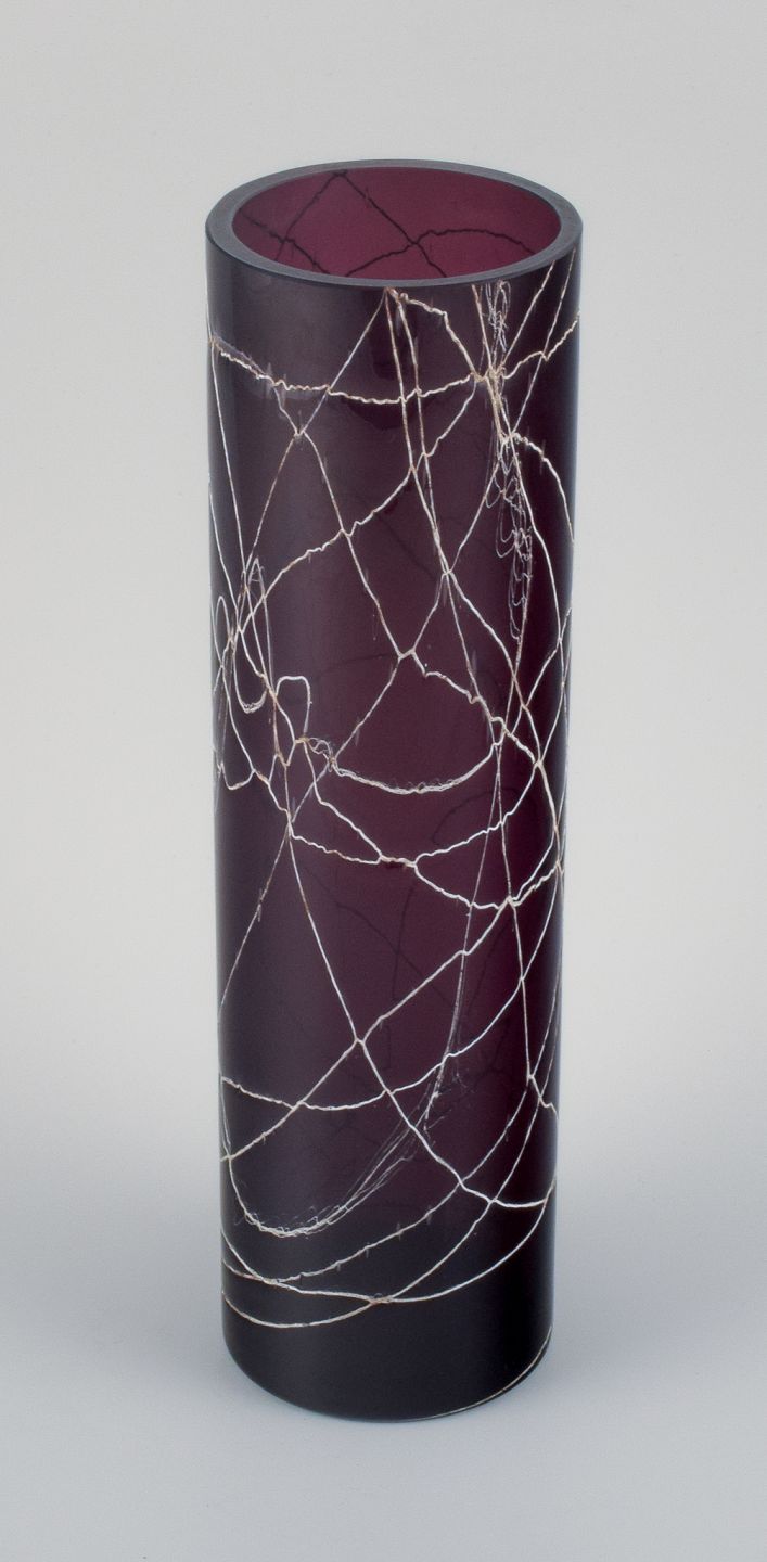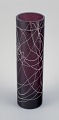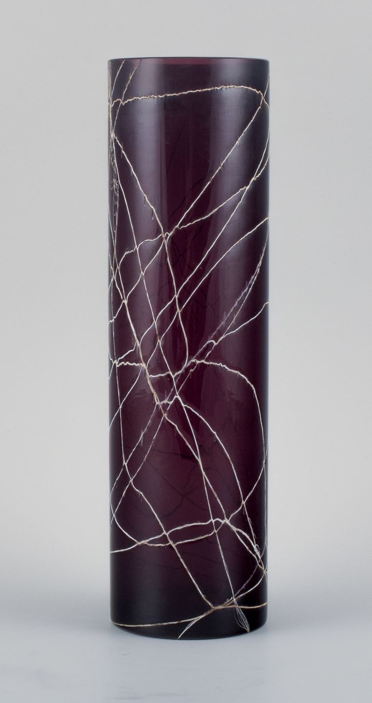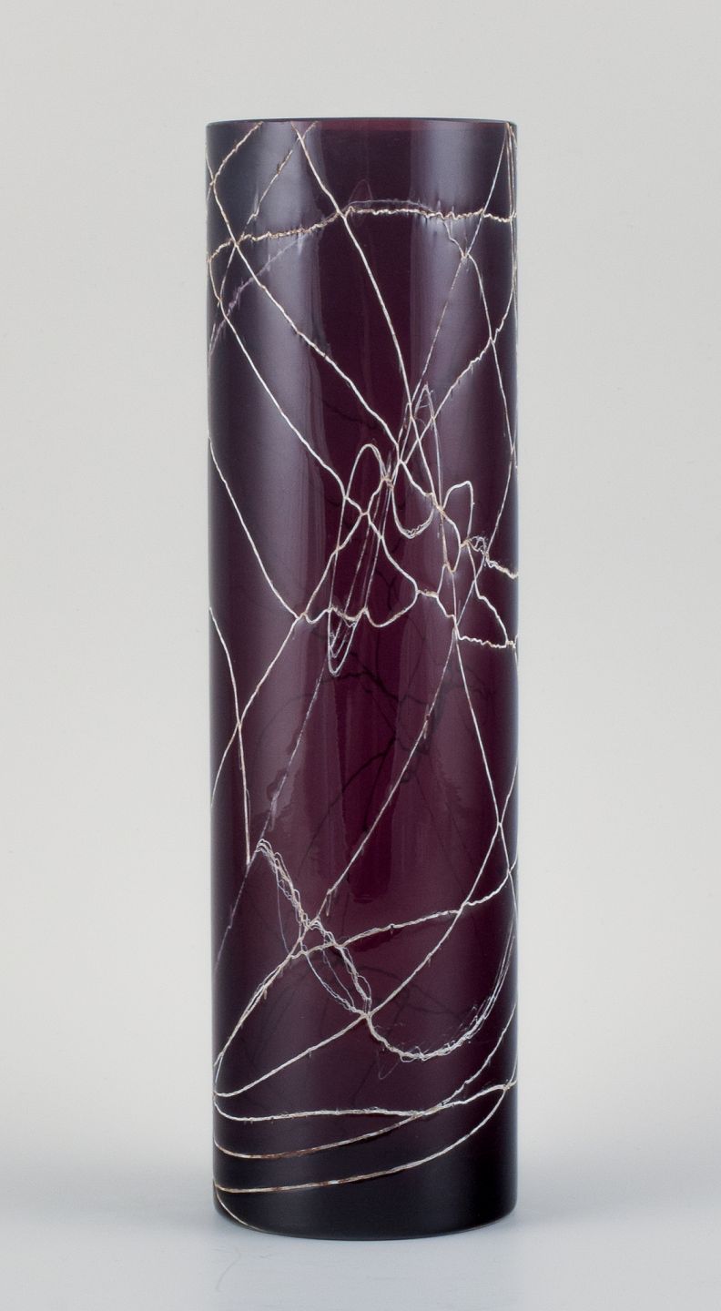 Lilla mundblæst kunstglasvase dekoreret med tråde. Ubekendt glaskunstner. Midt 1900-tallet. I perfekt stand. Mål: H 28,0 x D 8,0 cm.