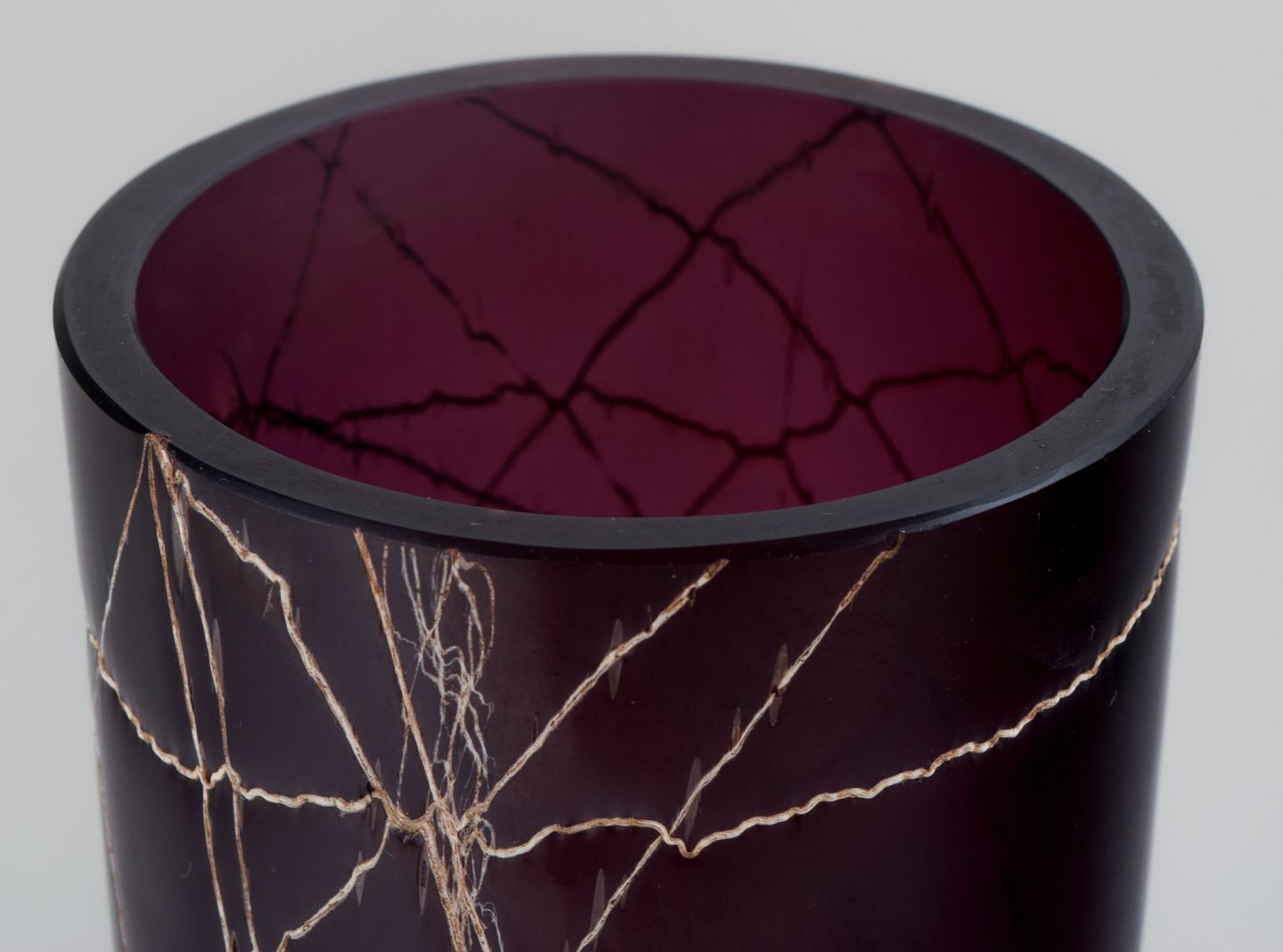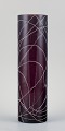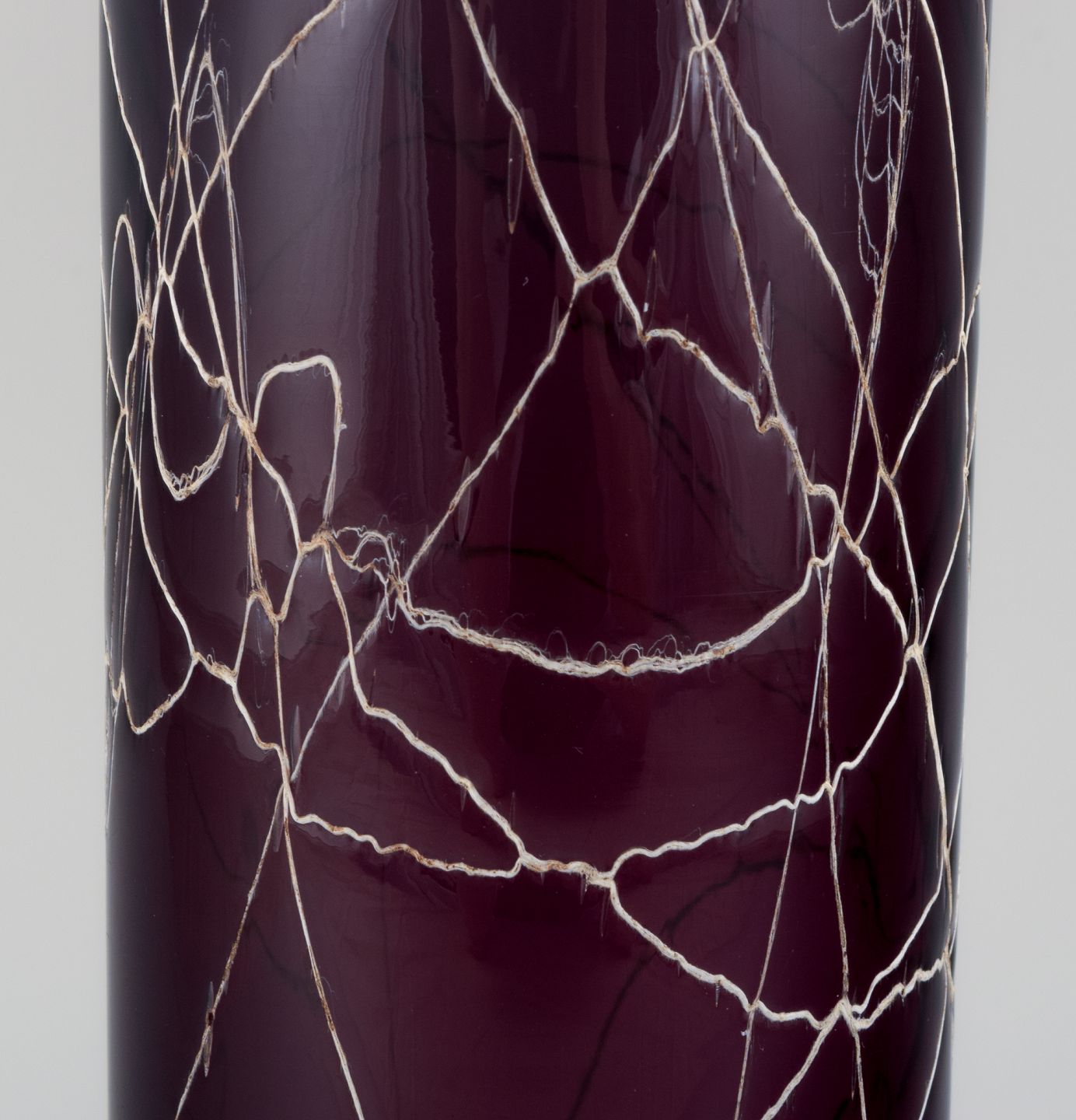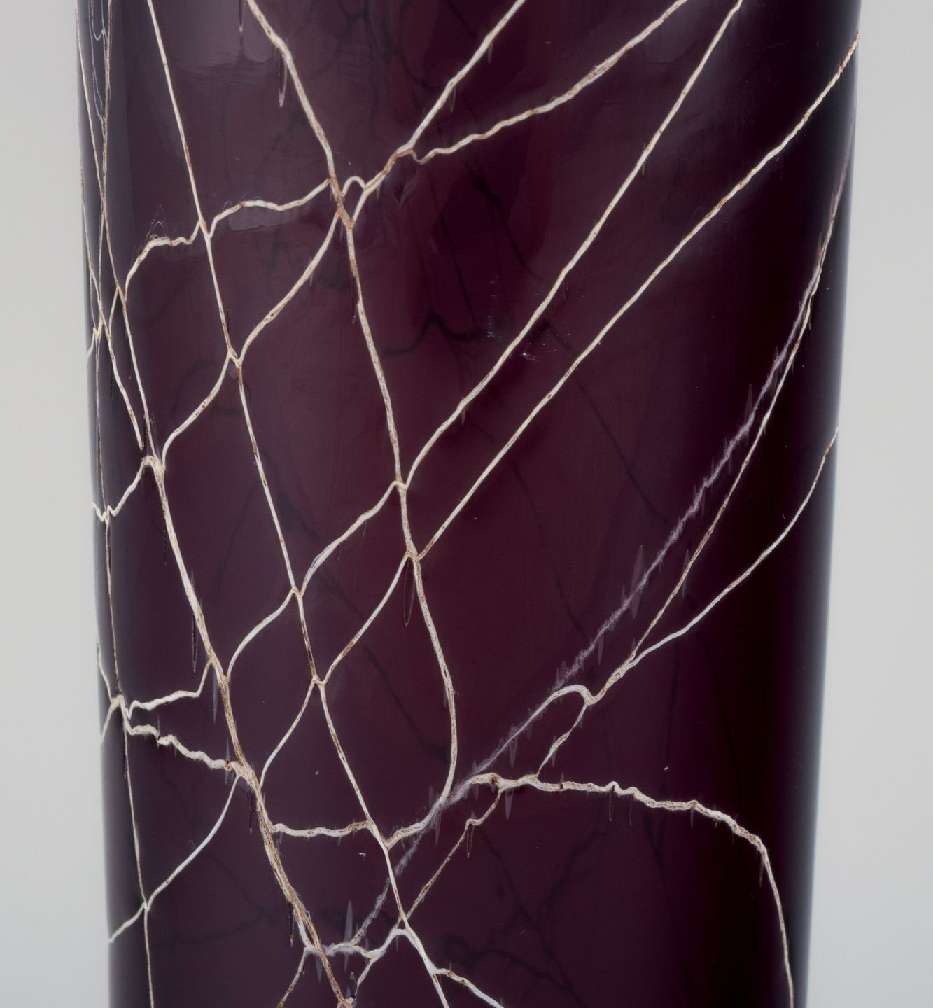 Lilla mundblæst kunstglasvase dekoreret med tråde. Ubekendt glaskunstner. Midt 1900-tallet. I perfekt stand. Mål: H 28,0 x D 8,0 cm.