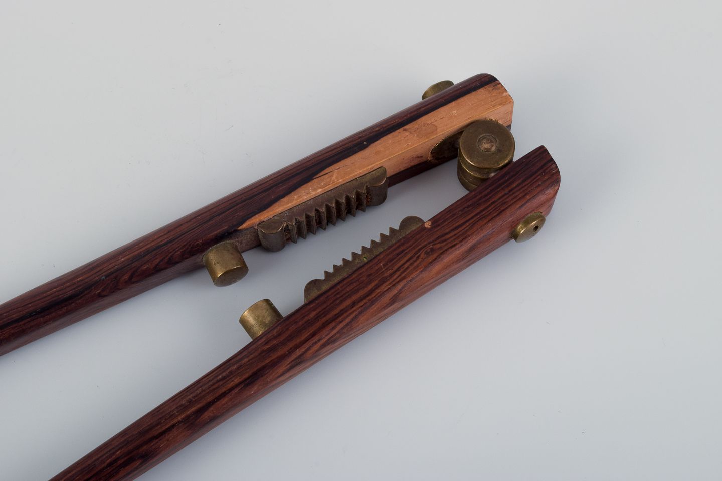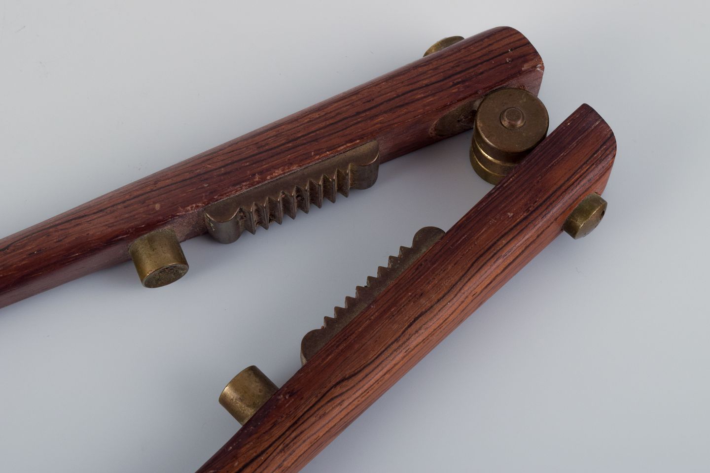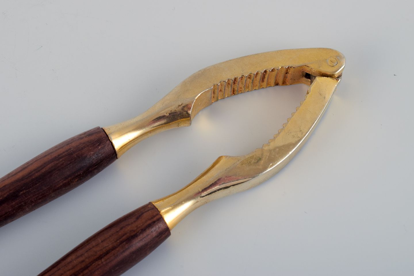 To nøddeknækkere i dansk design, messing og teak. Ca. 1960’erne. I flot stand. Den længste måler: L 20,5 cm.
