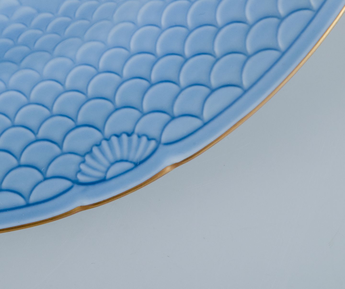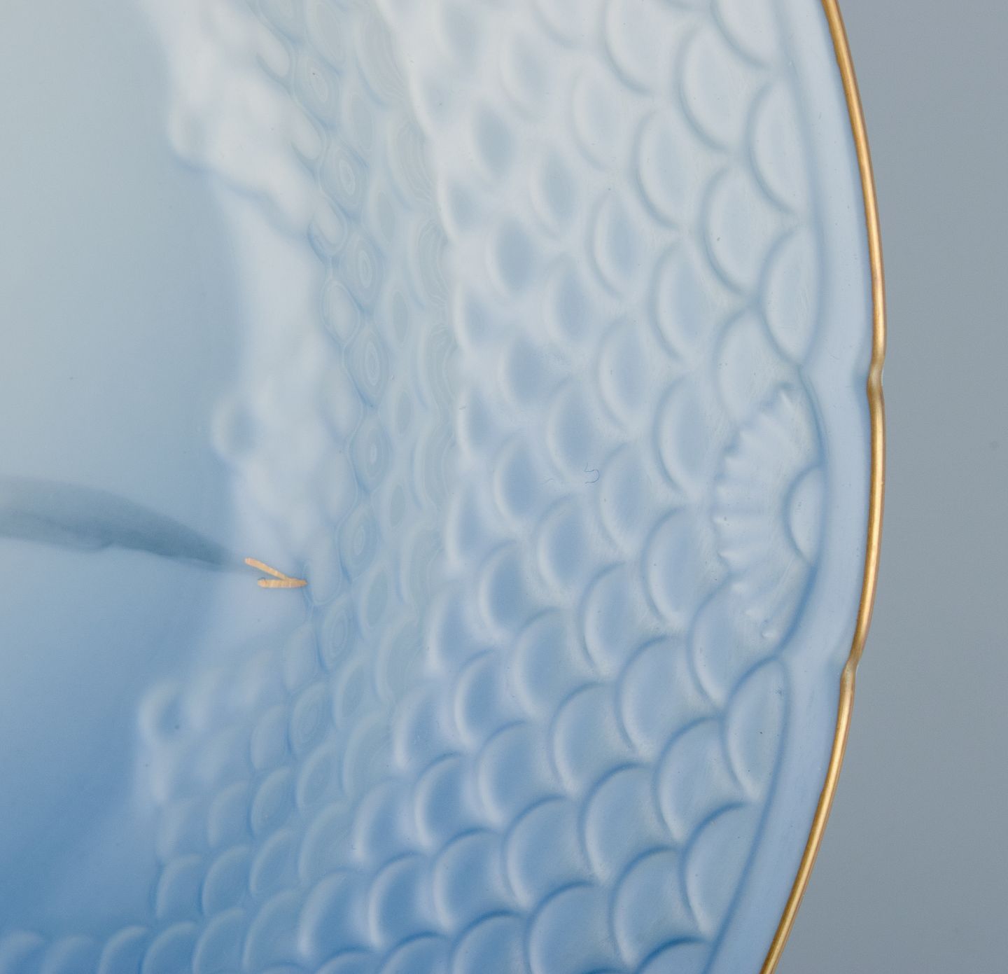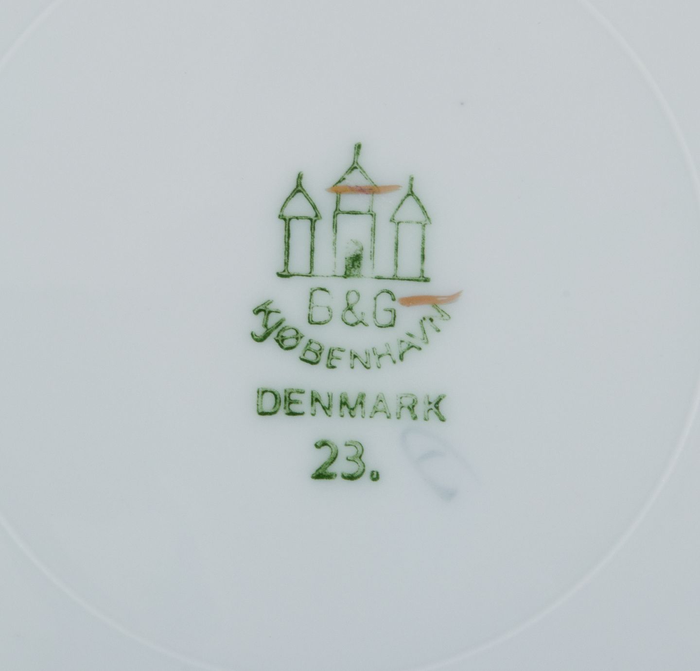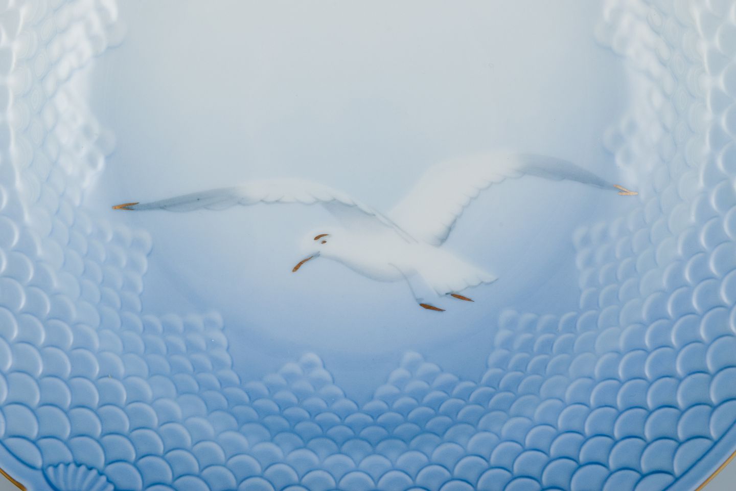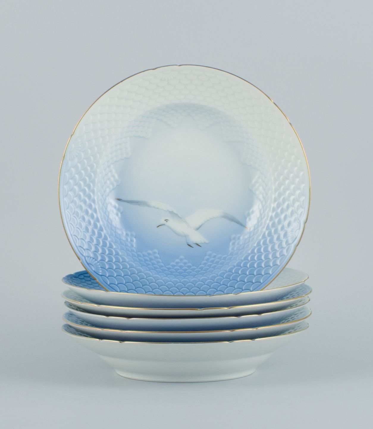 Bing & Grøndahl, mågestellet, seks dybe tallerkner med måge og gulddekoration. Model 23. 1960'erne. I perfekt stand. Anden sortering. Stemplet. Mål: D 21,0 x H 4,0 cm.