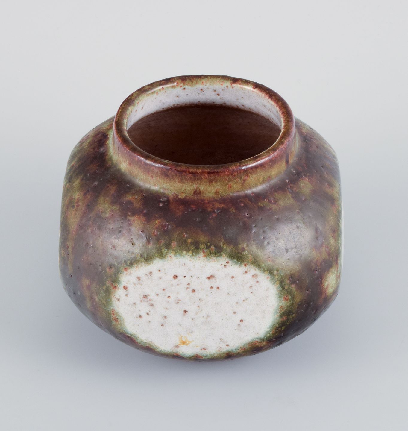 Danish ceramicist, unique vase decorated with a baby bird. White, green, and brown shades. 1960s. In excellent condition. Marked. Dimensions: H 13.5 cm x D 14.0 cm.