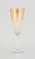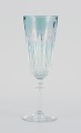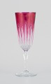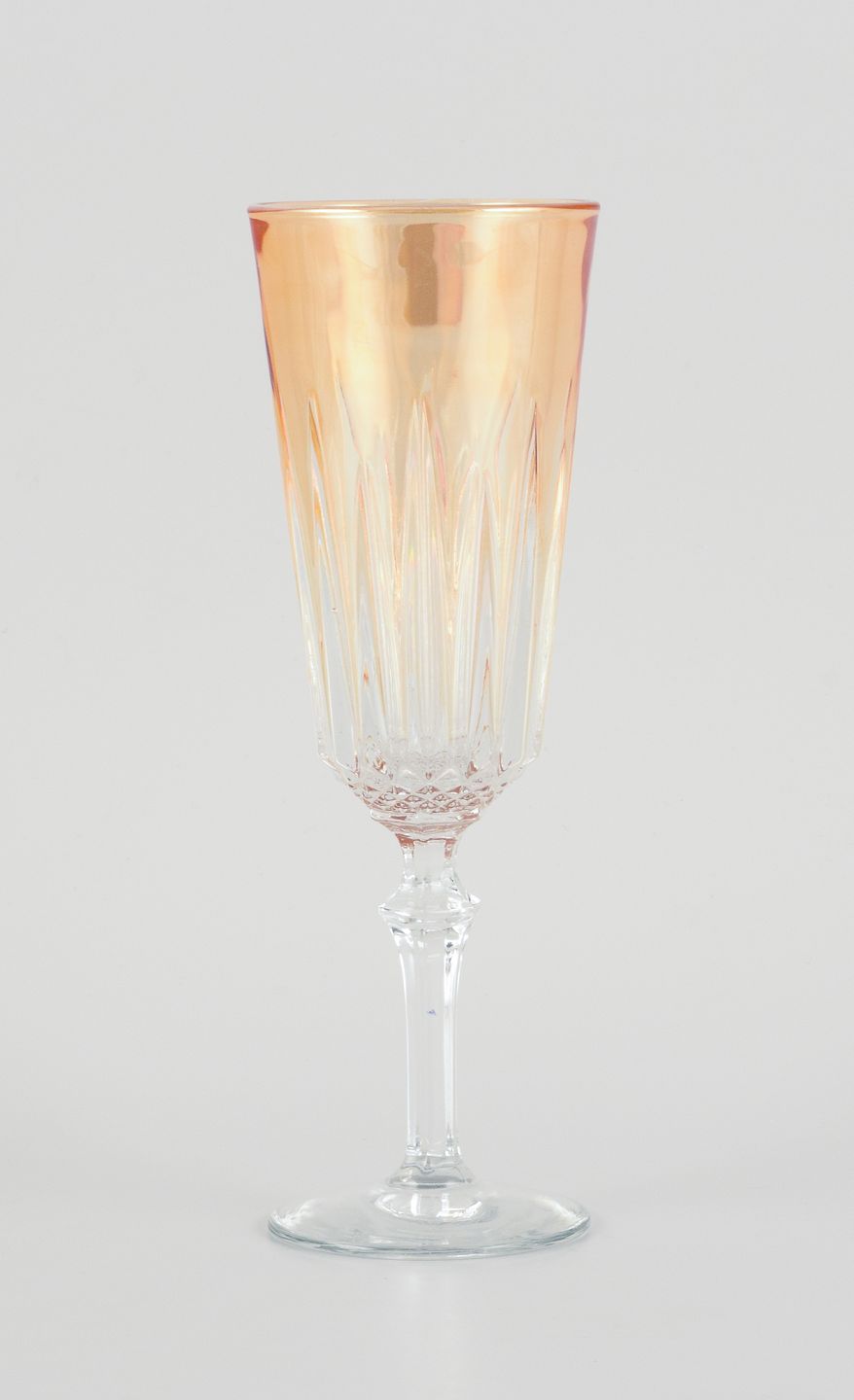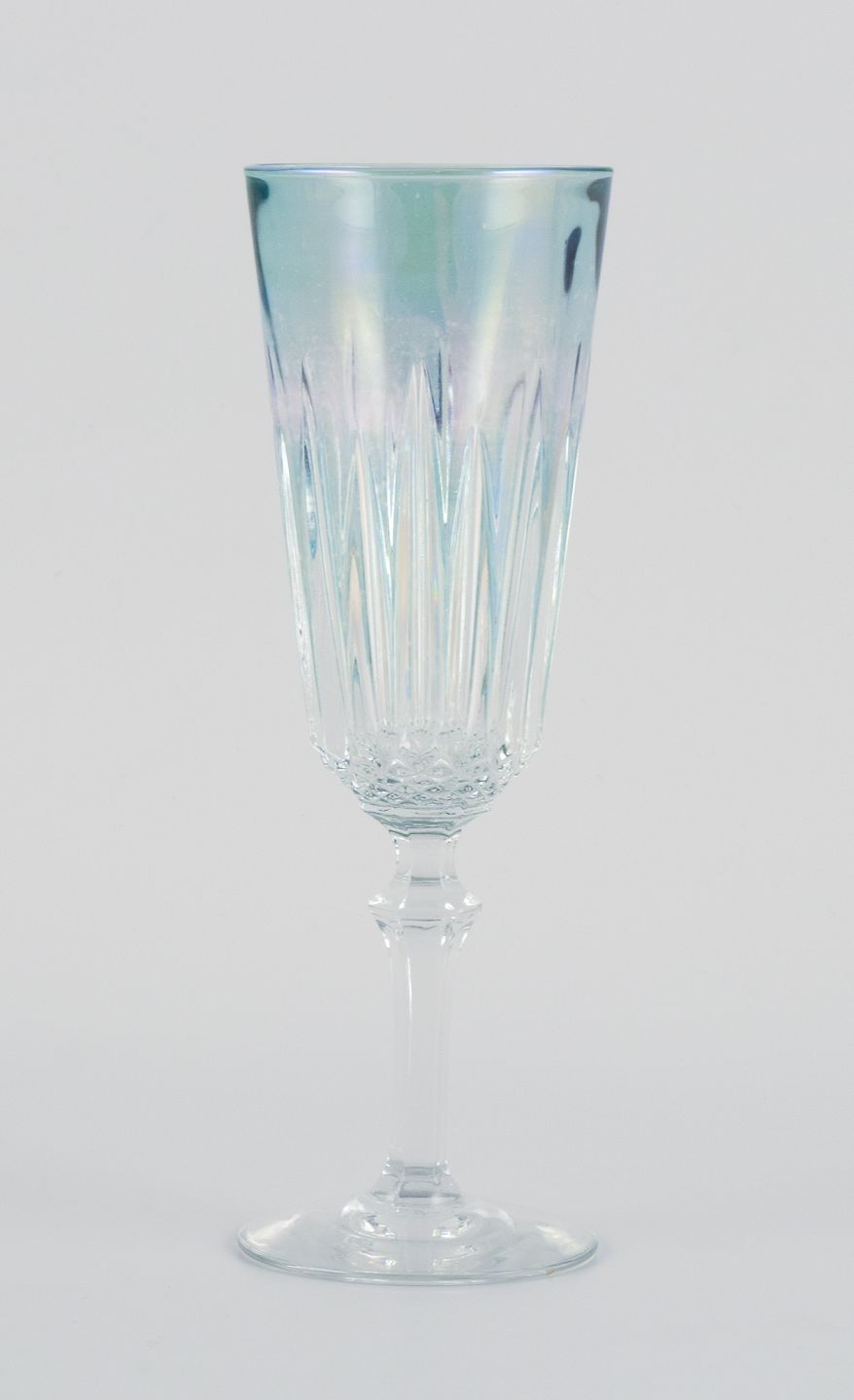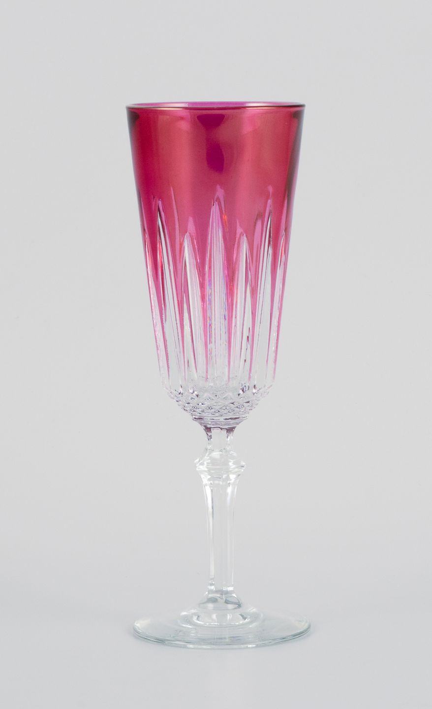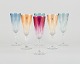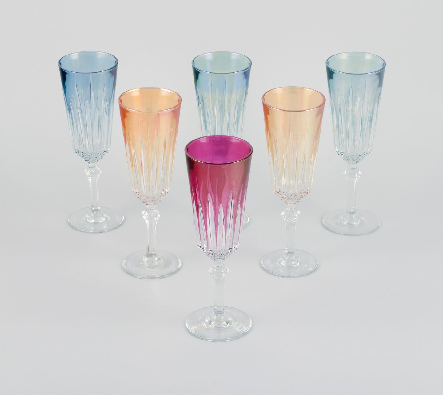 Seks franske champagnefløjter i krystalglas. Klassisk design i forskellige farver. Midt 1900-tallet. I perfekt stand. Mål: H 18,7 cm. x D 6,5 cm.