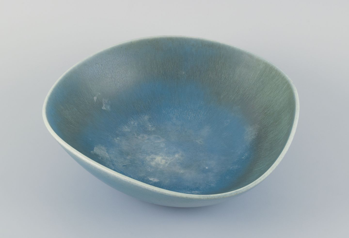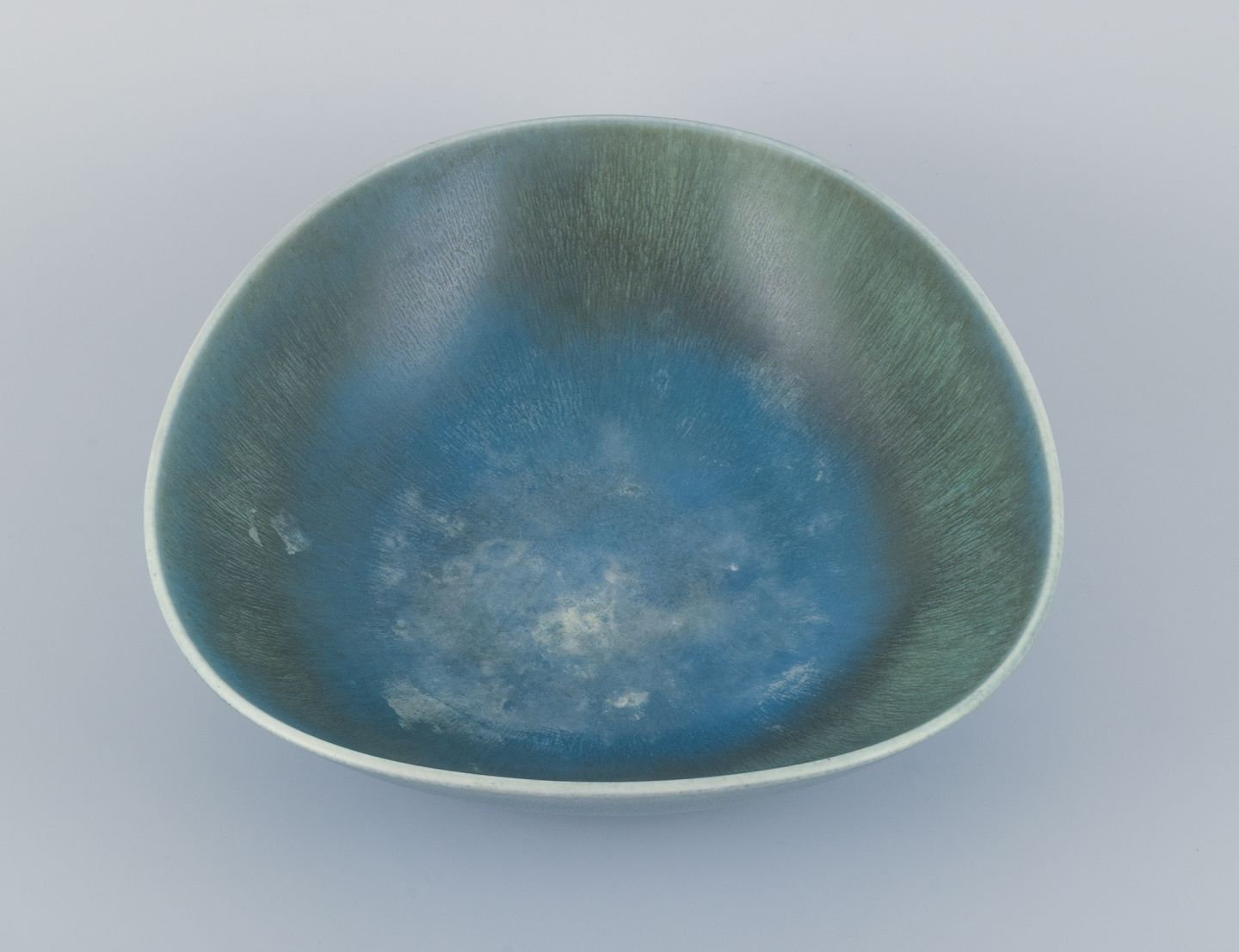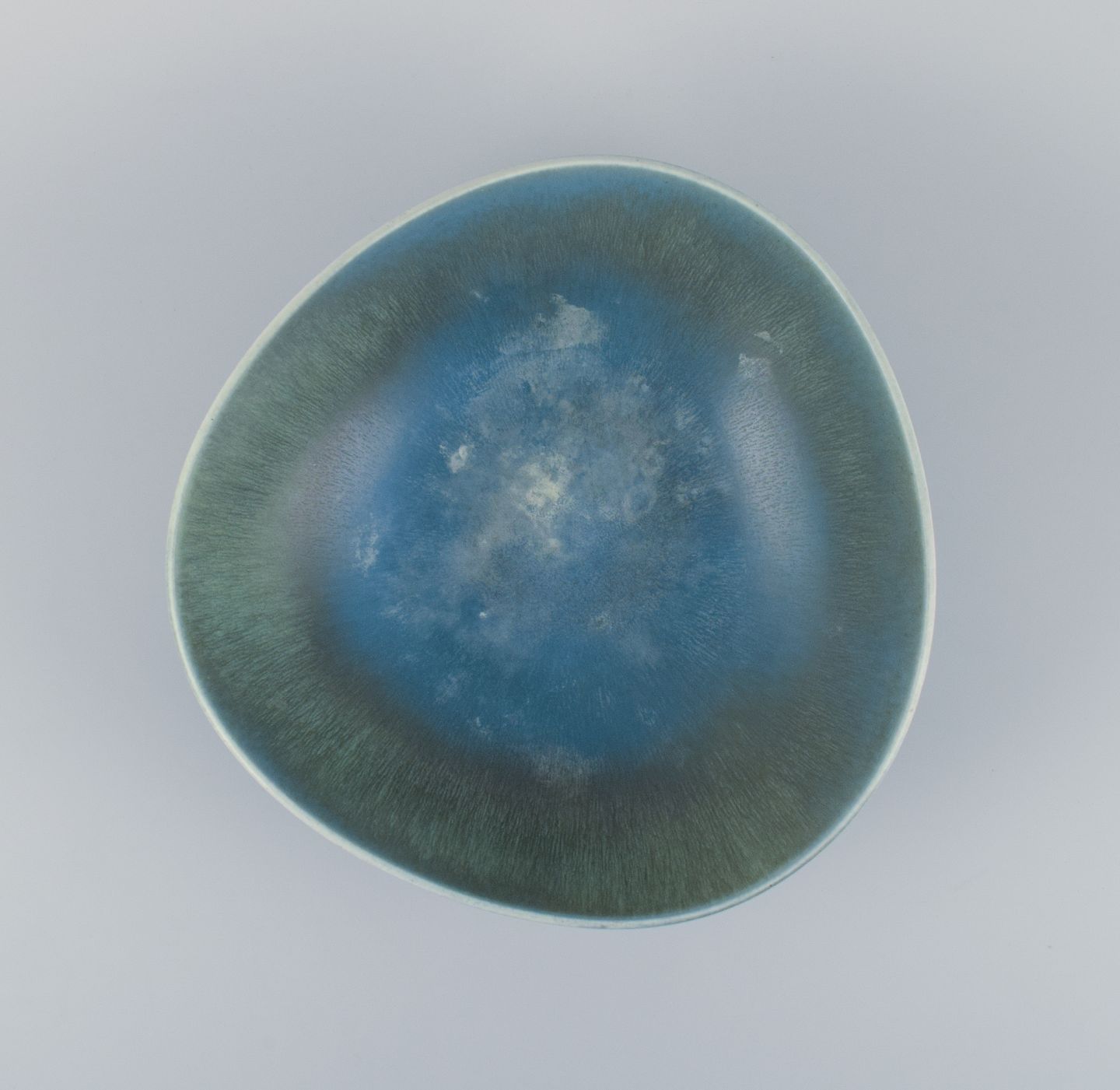 Berndt Friberg for Gustavsberg, Sweden, large ceramic bowl with glaze in blue-green tones. Mid-20th century. Perfect condition. Signed. Dimensions: D 32.0 cm x H 9.5 cm.