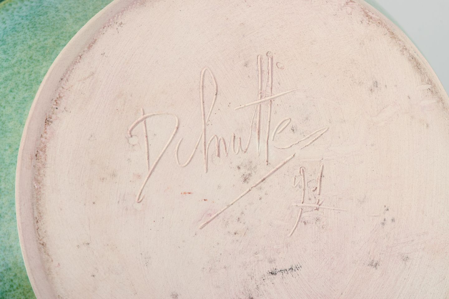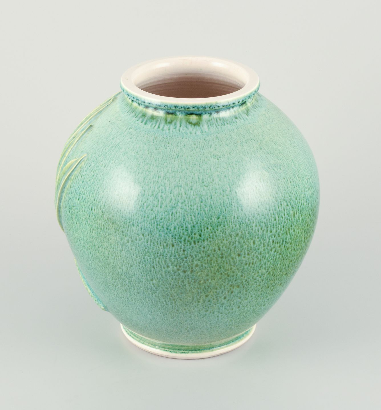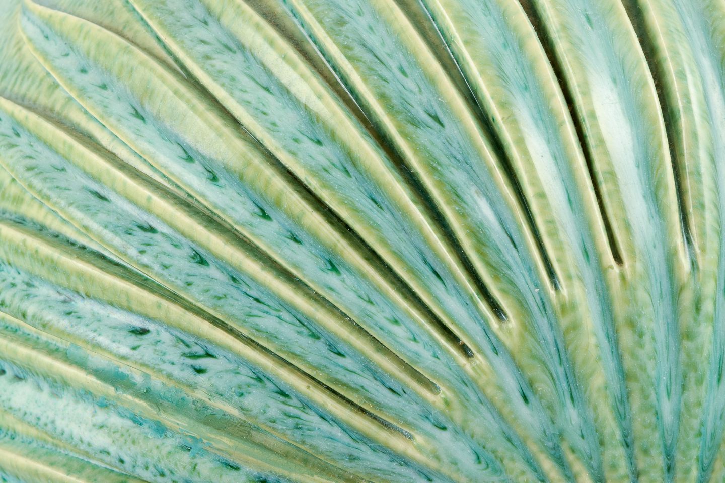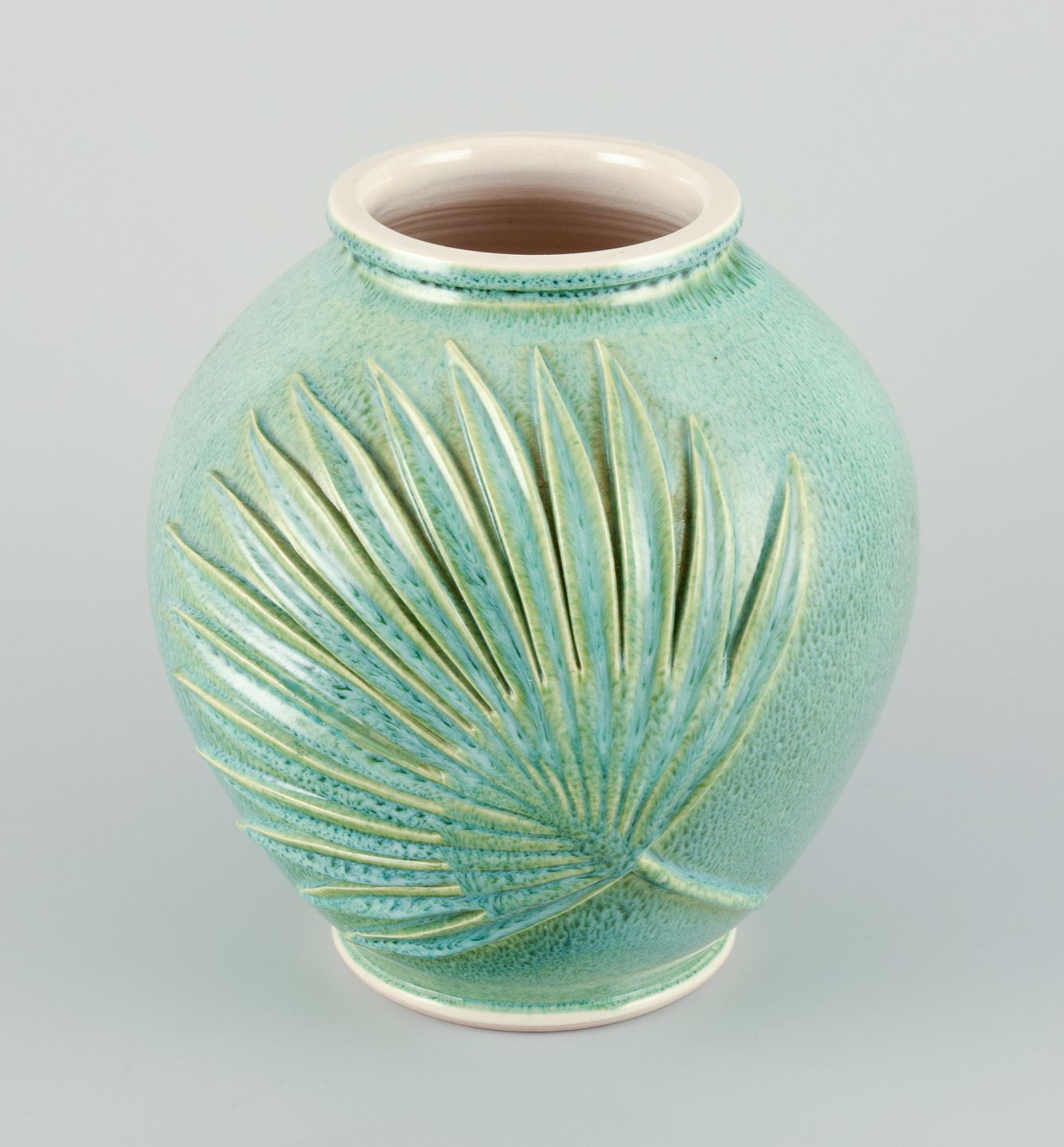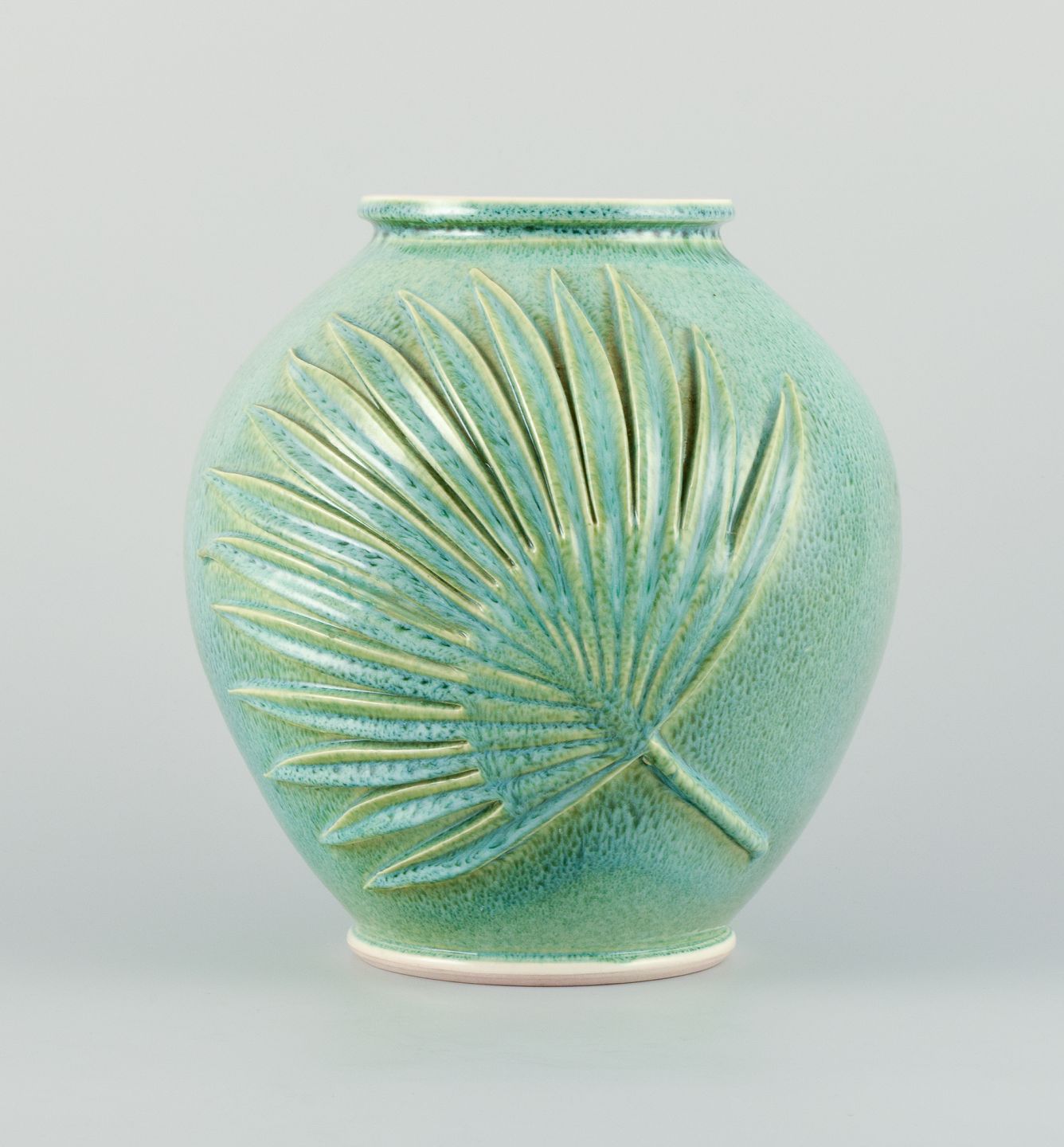 Fransk keramiker, stor unikavase i grønblå glasur. Udformet med palmeblade i relief. Signeret. Dateret 1991. Perfekt stand. Mål: 24,0 cm. x D 22,0 cm.