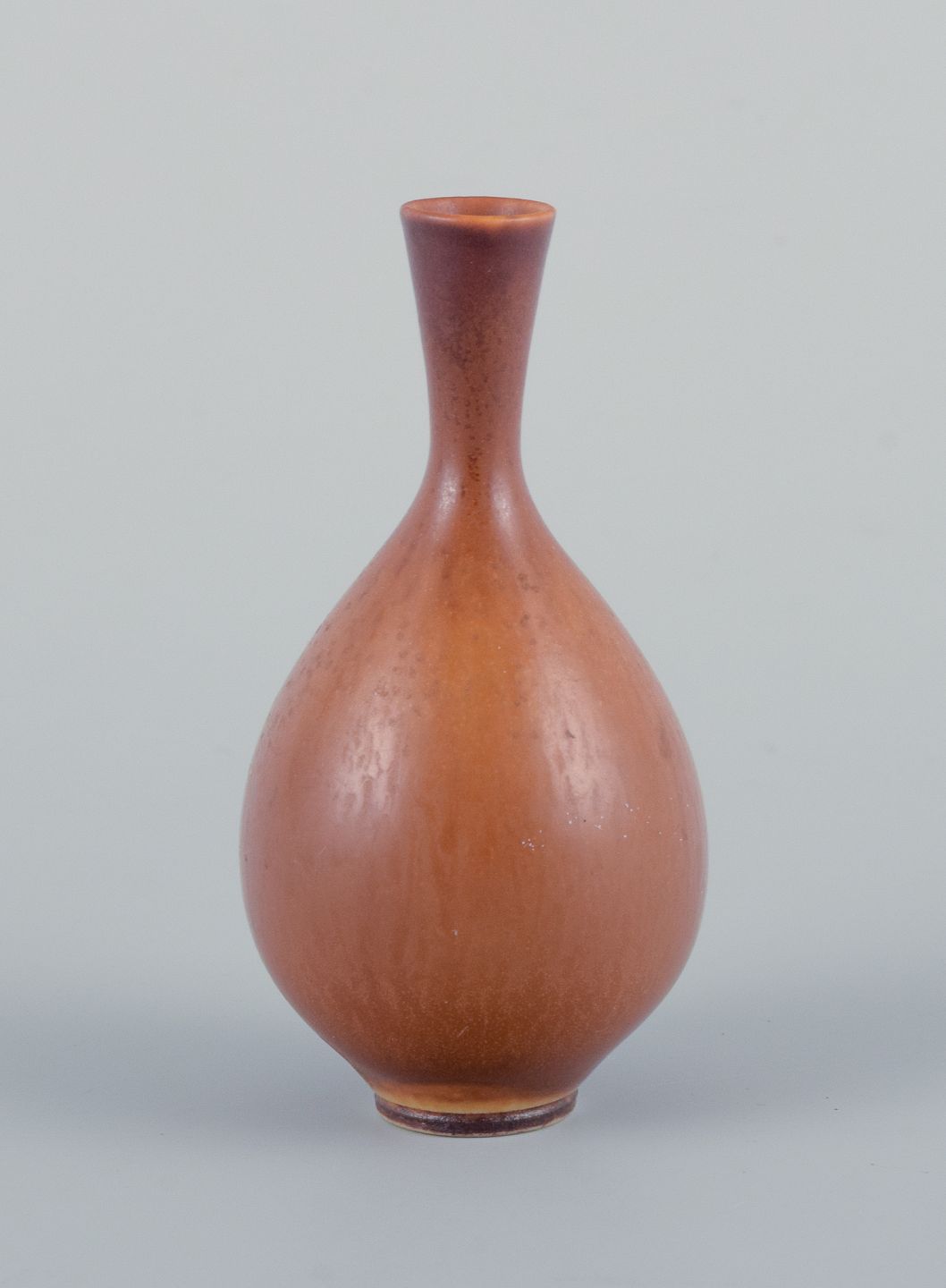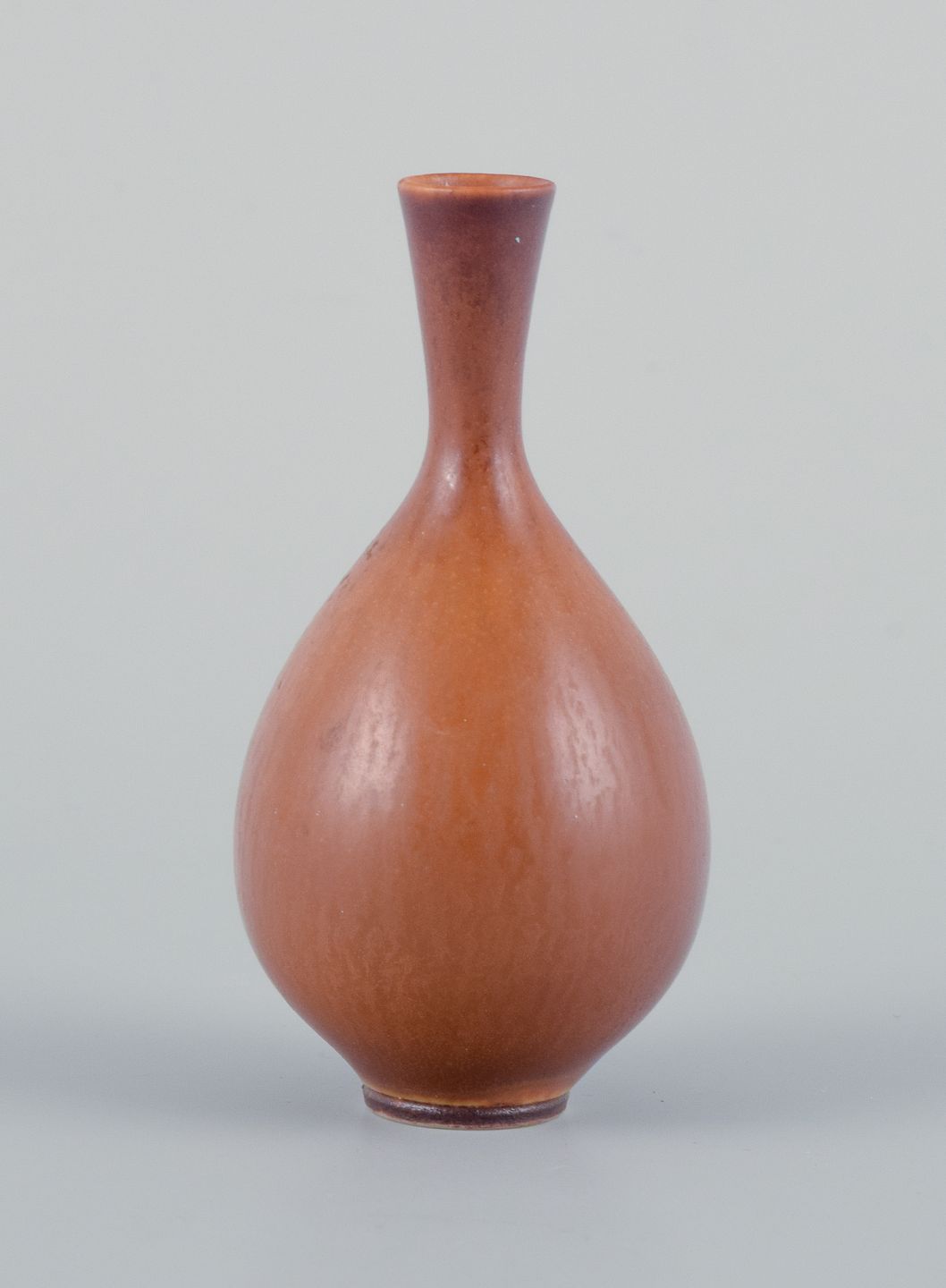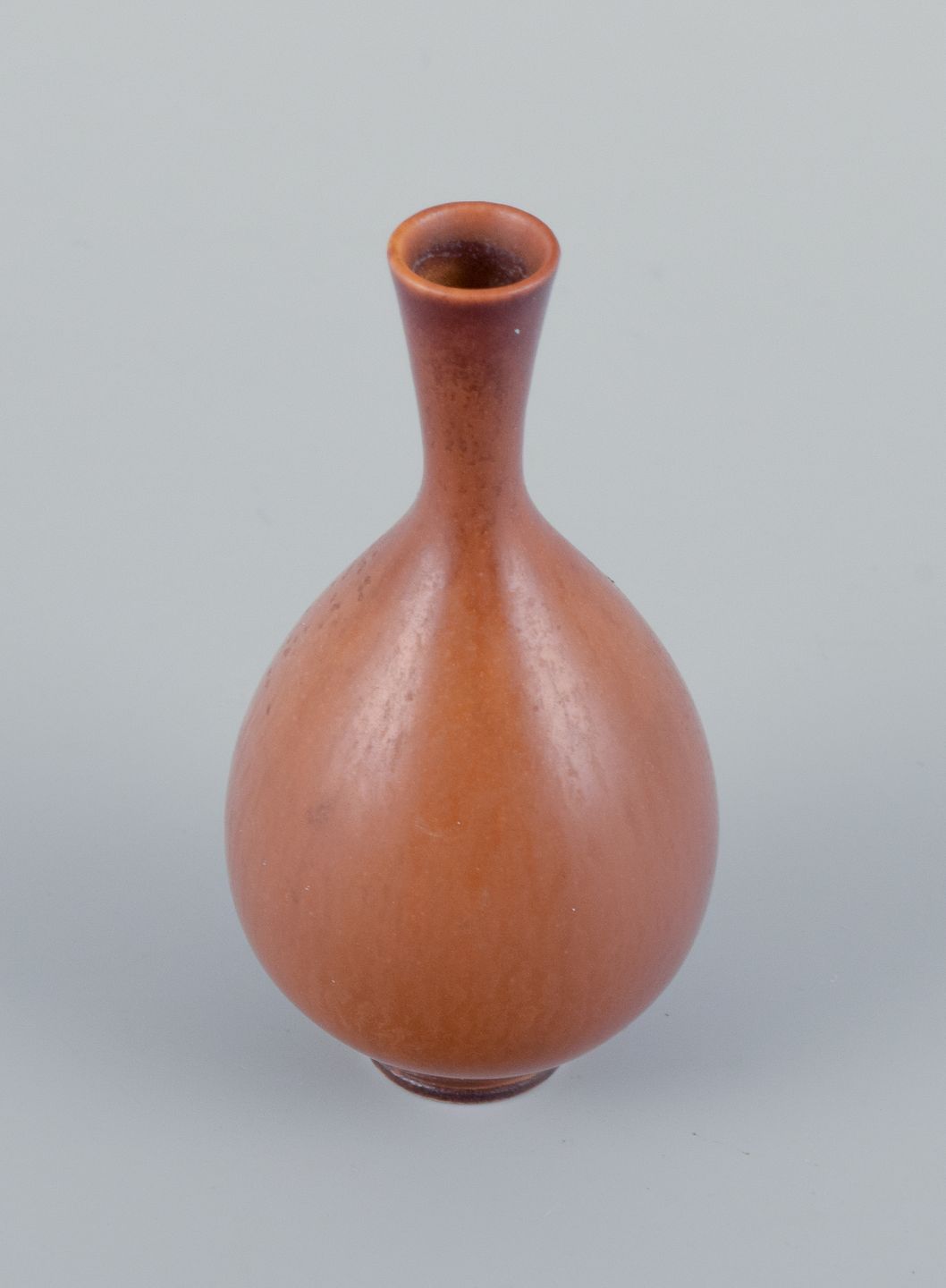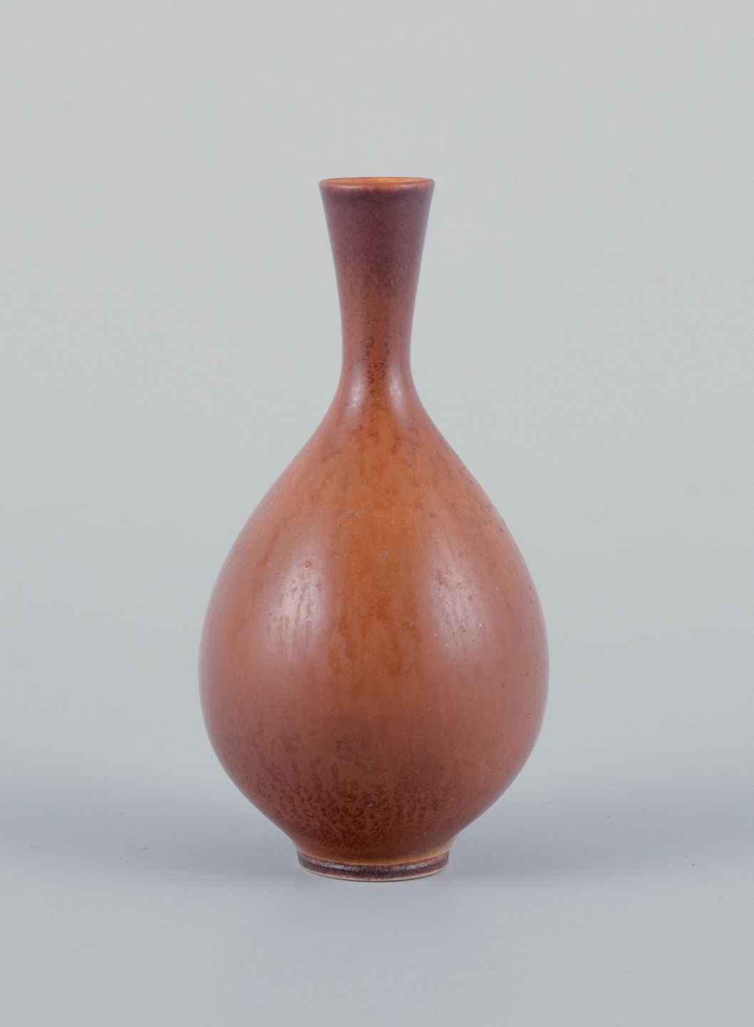 Berndt Friberg (1899-1981) for Gustavsberg, Sverige, miniature keramikvase med glasur i brune nuancer. Midt 1900-tallet. Signeret. Perfekt stand. Mål: H 6,0 cm. x D 3,0 cm.