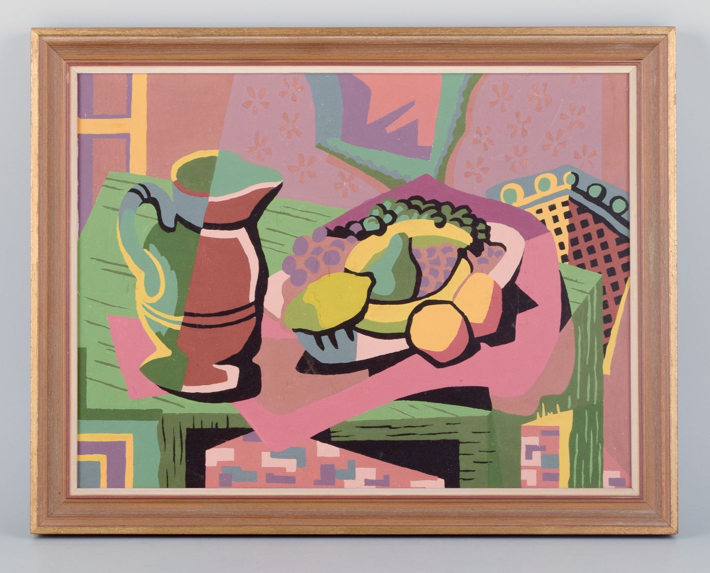 Scandinavian modernist, oil on board, still life with fruits and pitcher. Coloristic palette.