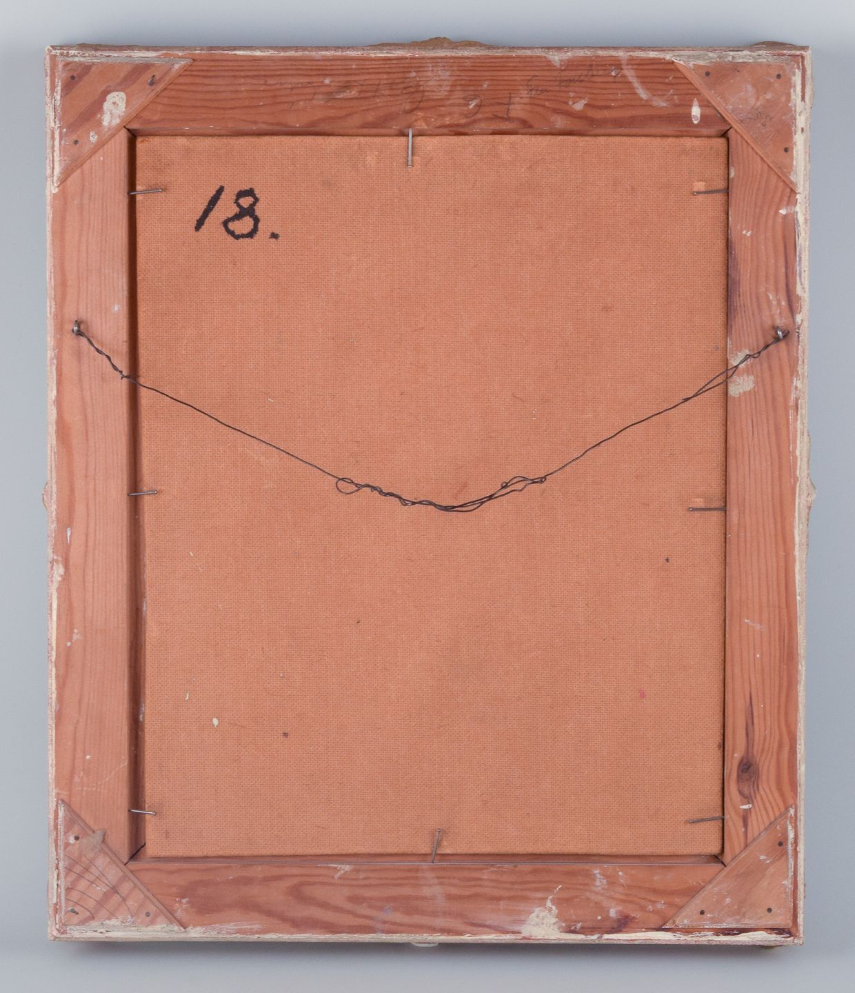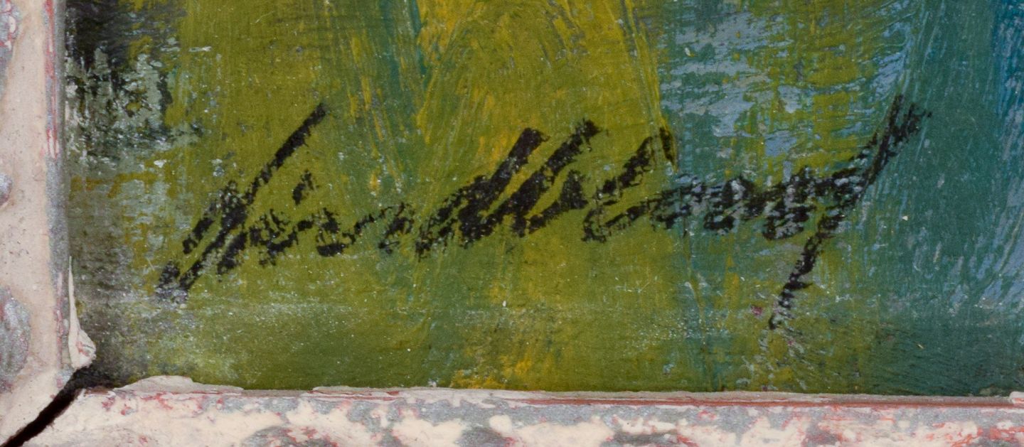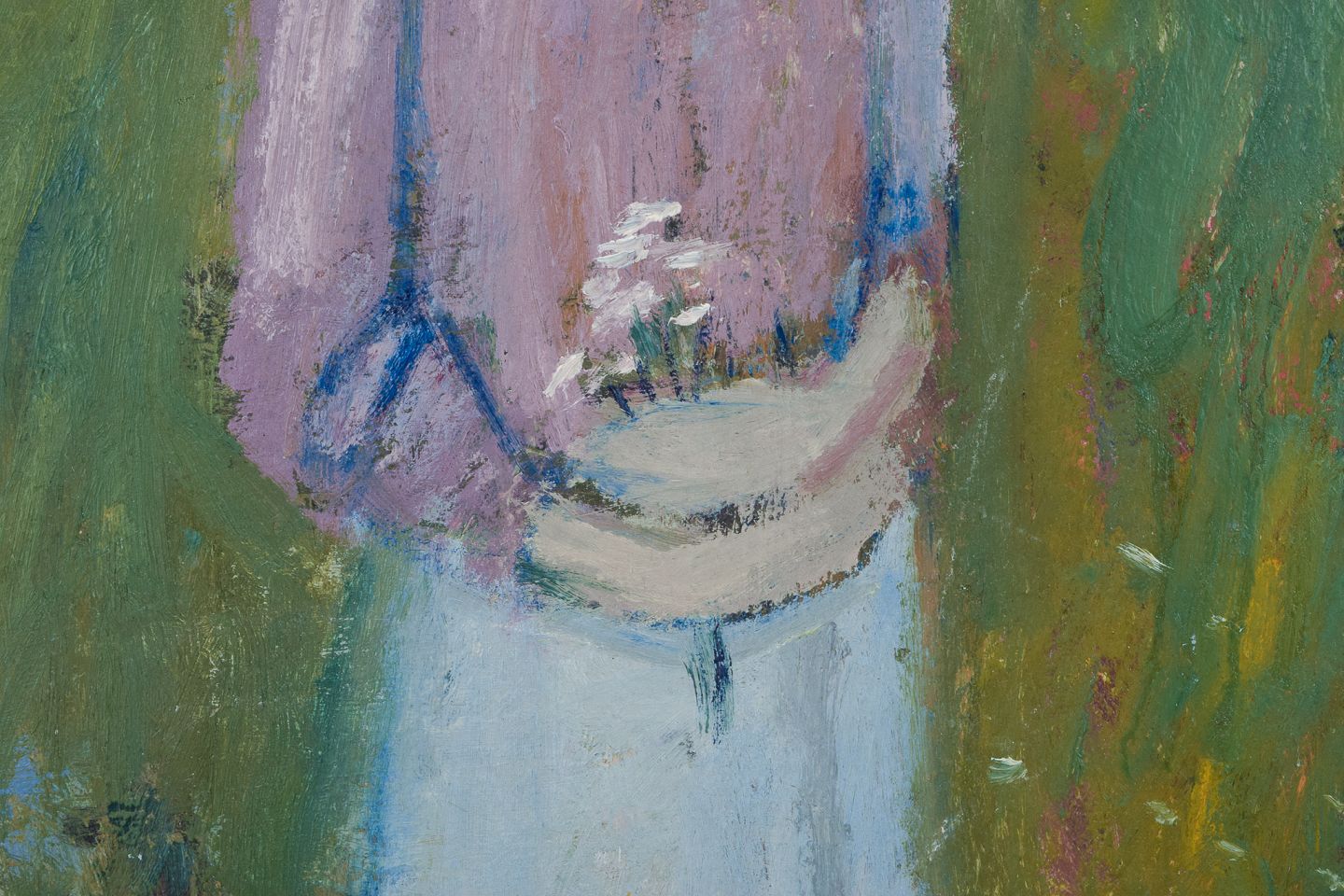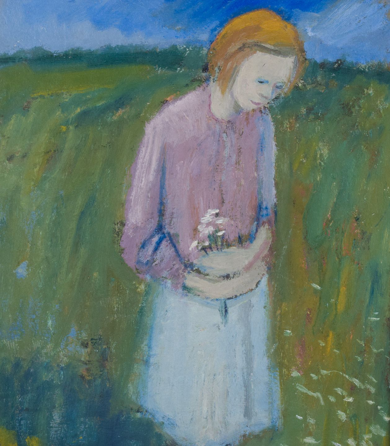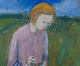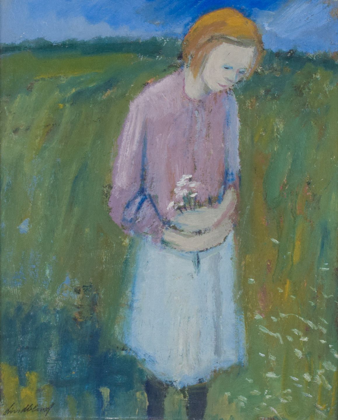Pär Lindblad, svensk kunstner, olie på plade, modernistisk landskab med pige i blomstermark. Melankolsk stemning.
