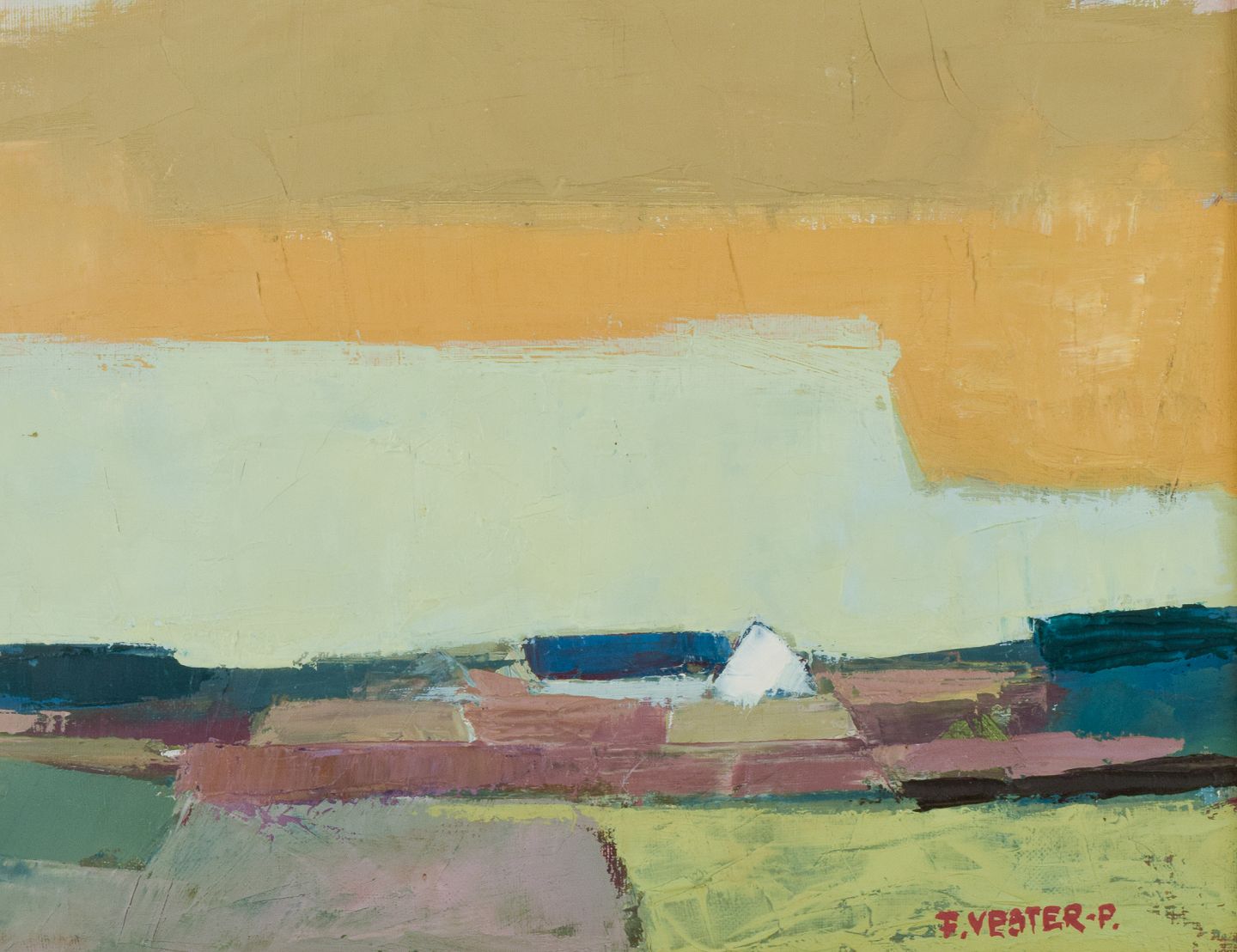 Frans Vester-Pedersen (1934-1972), modernistisk landskab med marker og gård. Ca. 1960’erne. Signeret. Perfekt stand. Mål: B 40,0 cm. x H 32,0 cm. Total: B 42,4 cm. x H 34,4 cm.