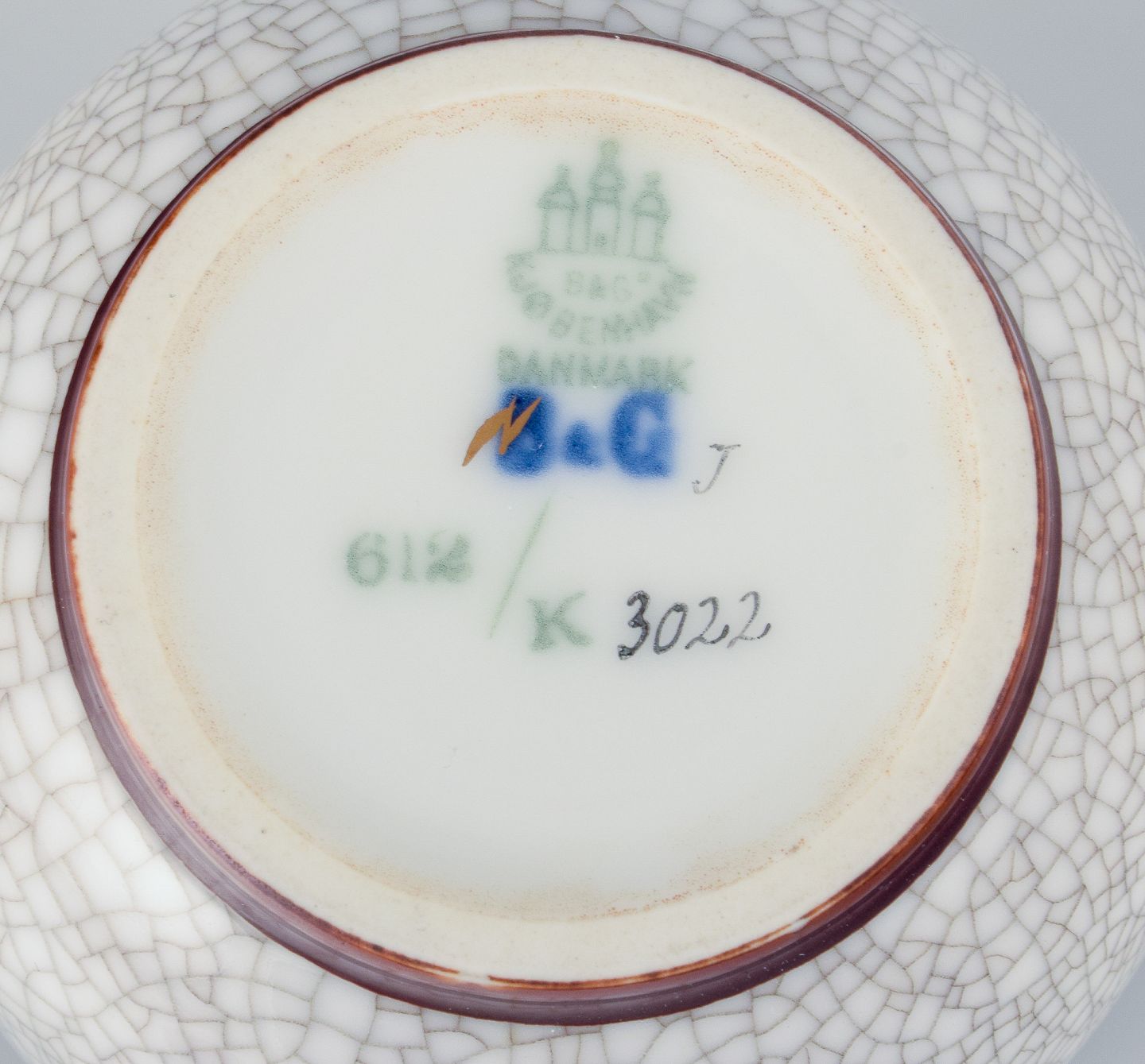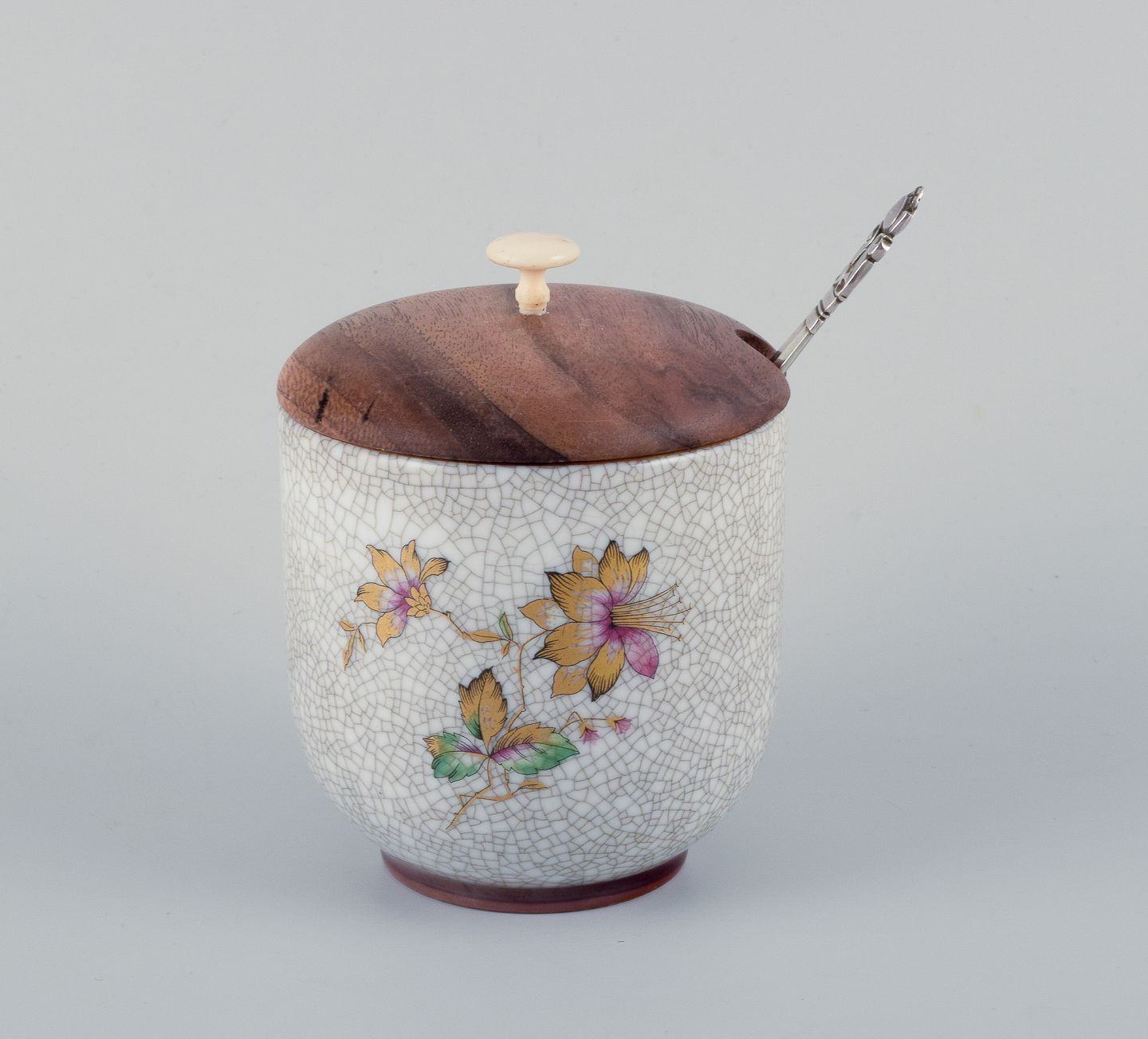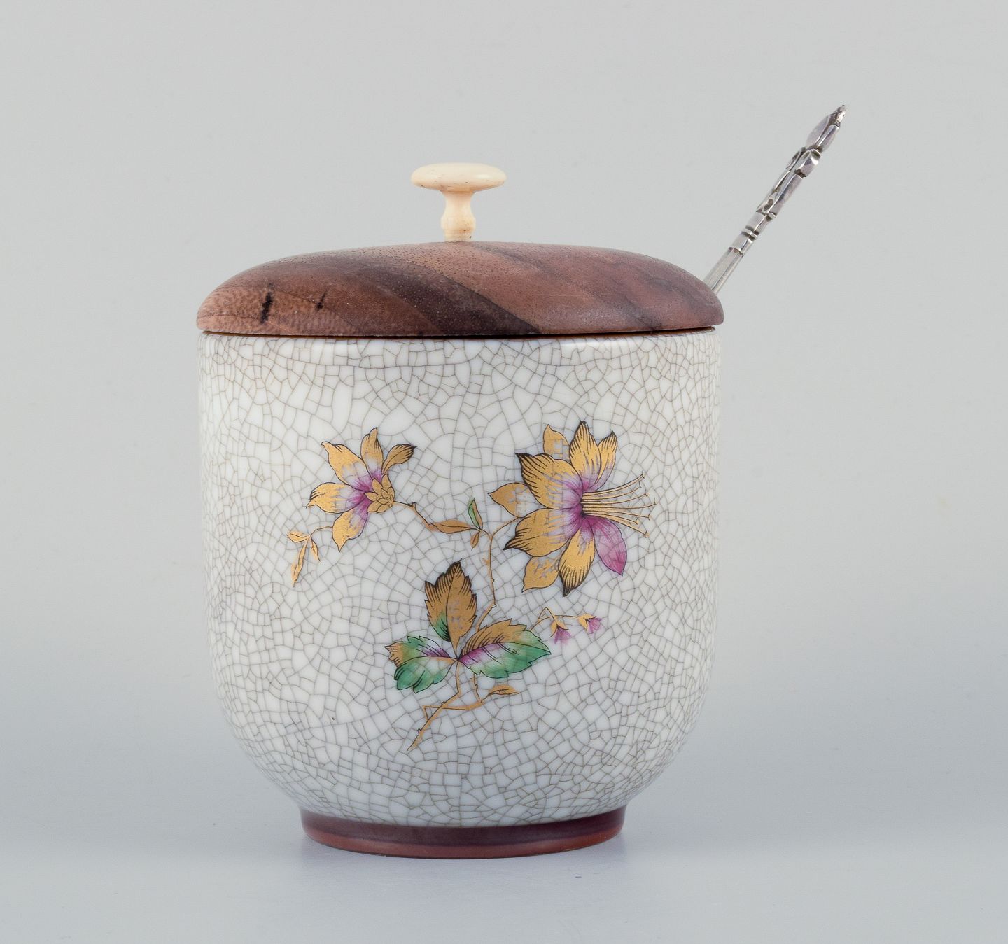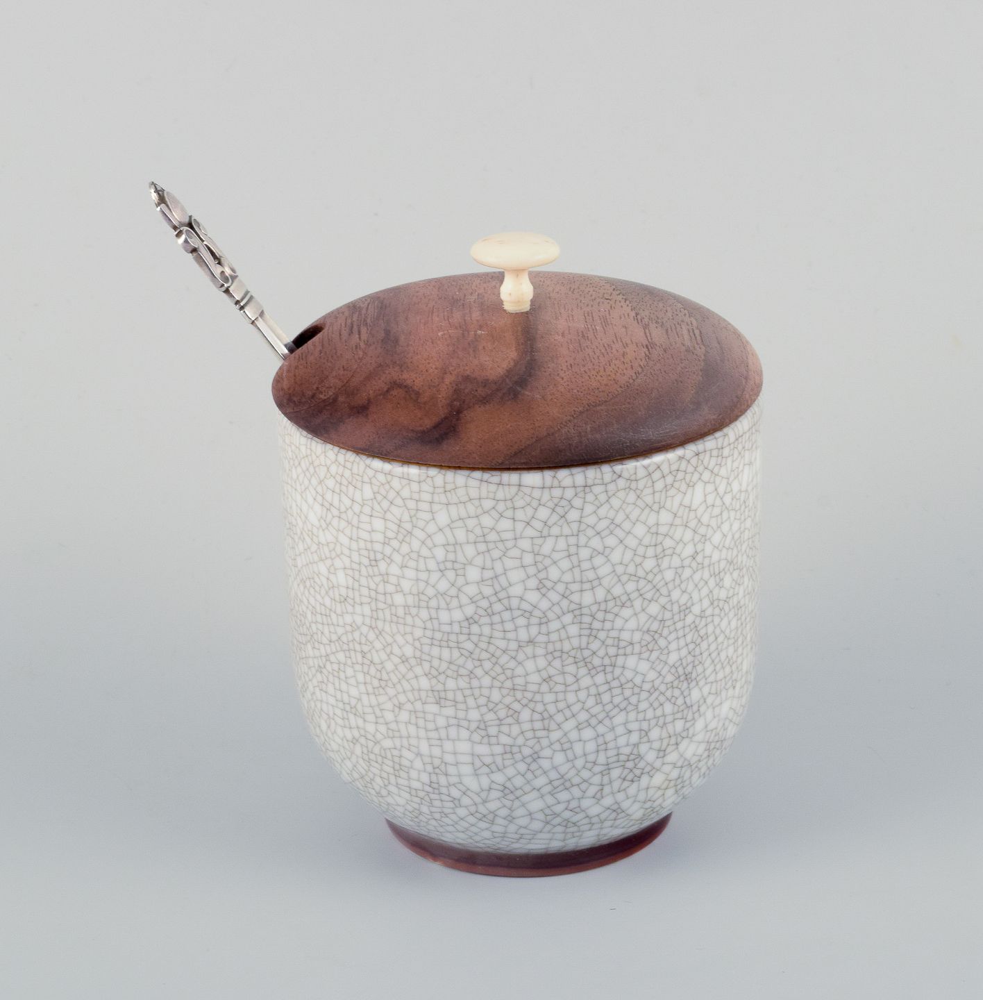 Bing & Grøndahl, jam jar in crackle porcelain with matching wooden lid and a Georg Jensen jam spoon.