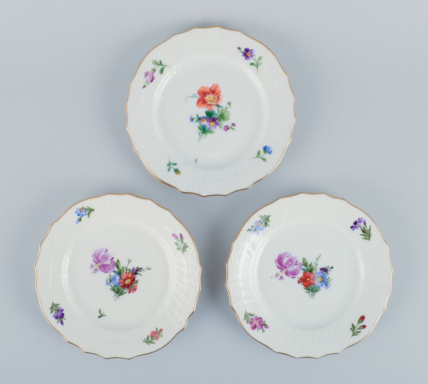 Royal Copenhagen, Saksisk Blomst, et sæt på ti små tallerkner, hånddekoreret med polykrome blomster og guldkant.