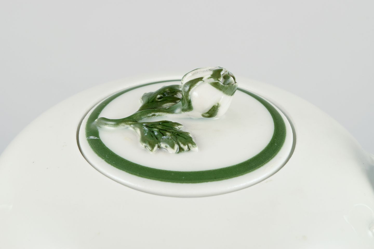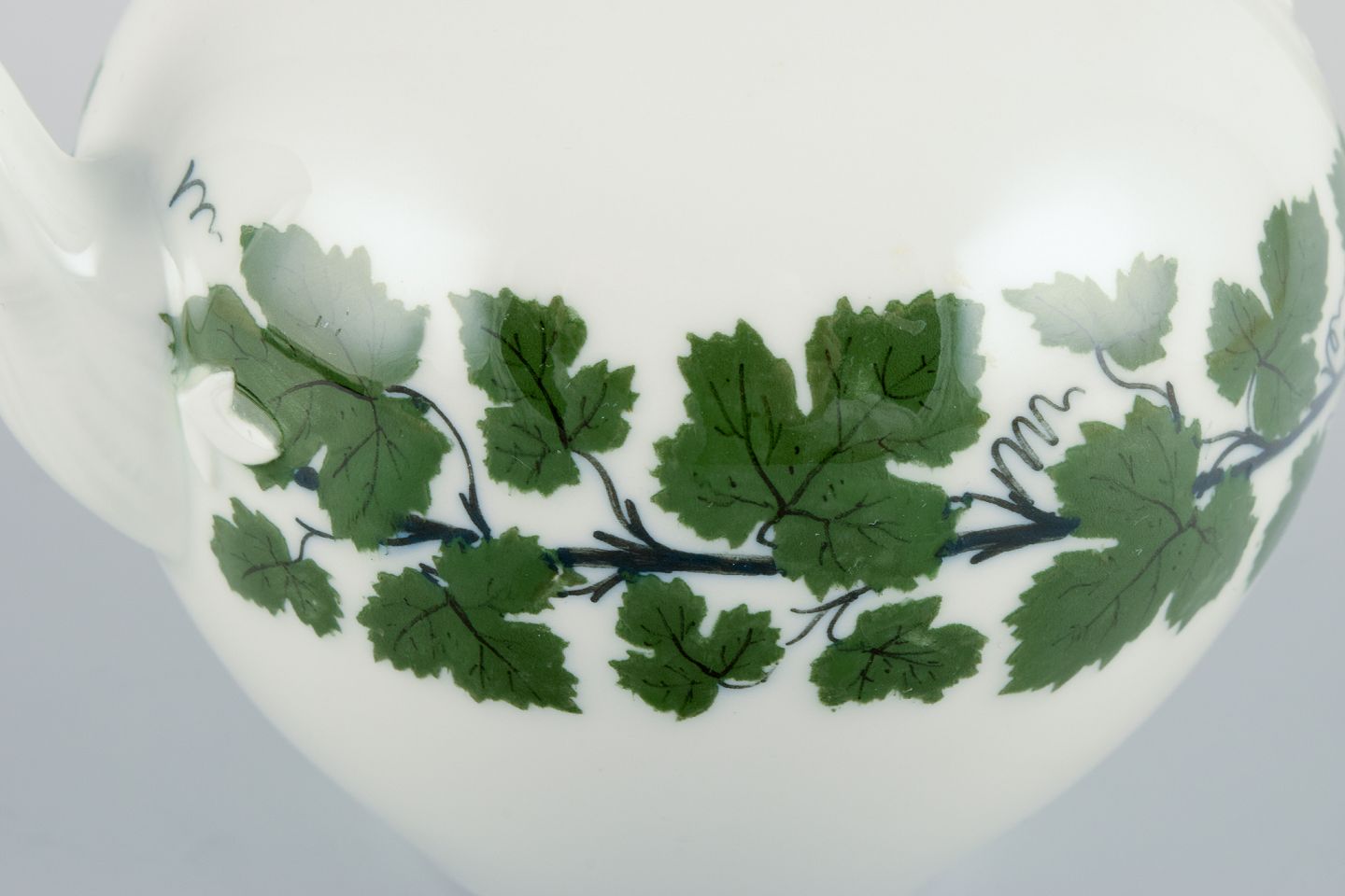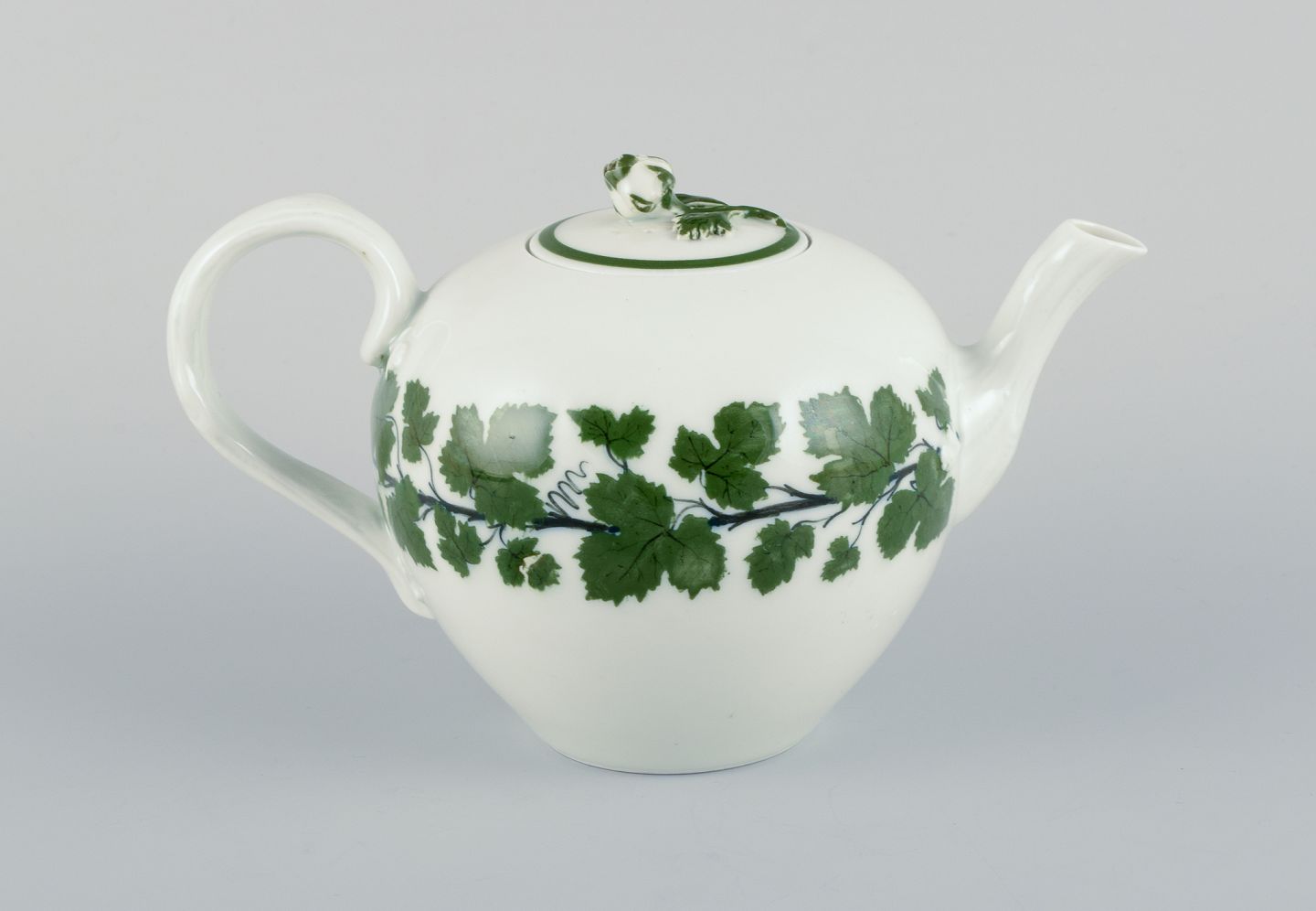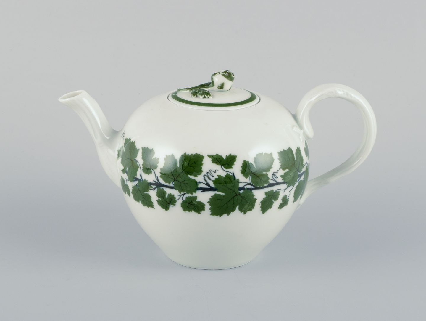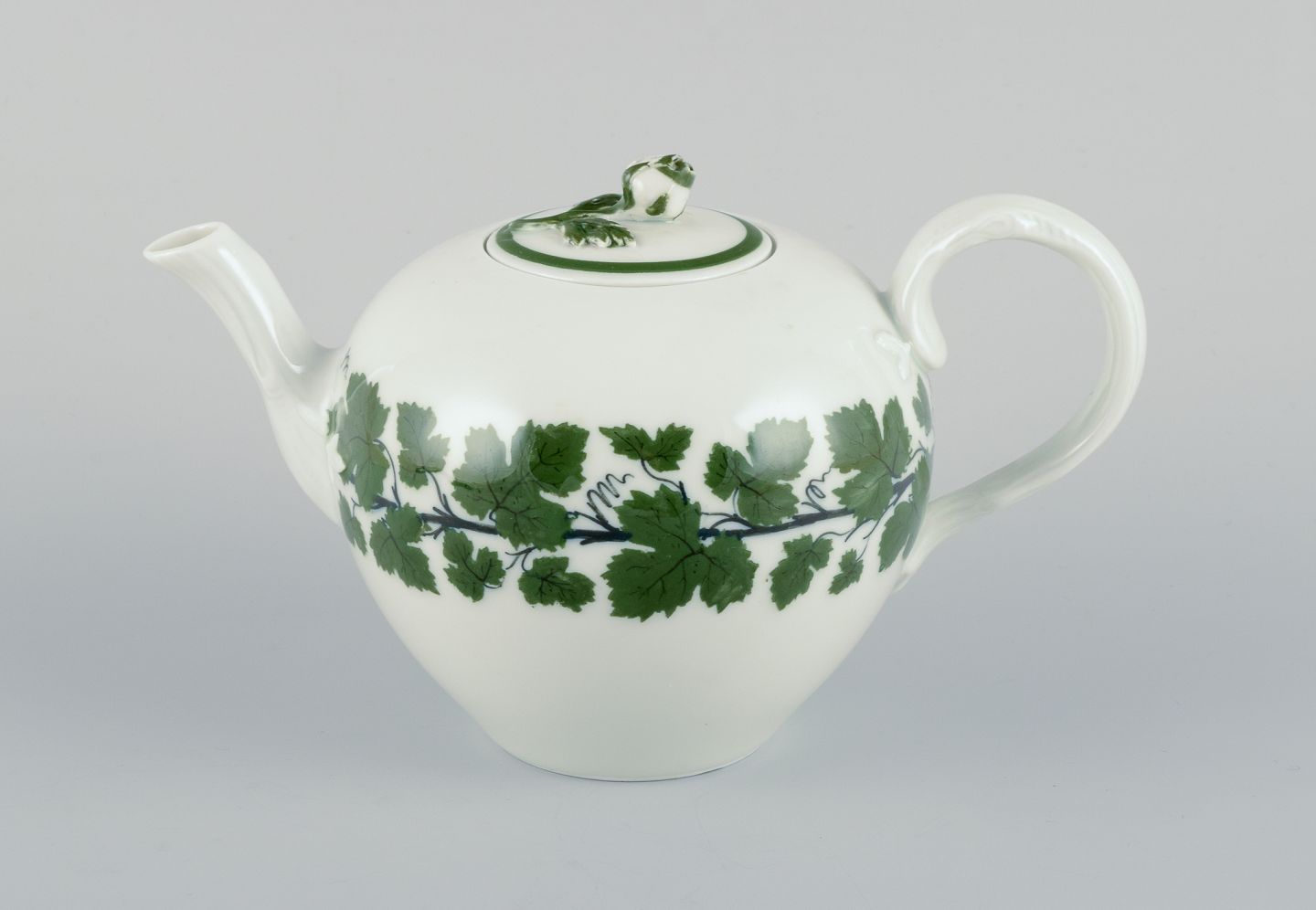 Meissen Green Ivy Vine, small teapot with flower knob lid. Approximately from the 1930s. Marked. Excellent condition. Third factory quality. Dimensions: H 10.5 cm x D 17.5 cm including handle and spout.